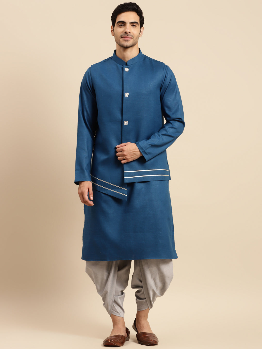 This Stylish and Charming kurta jacket set makes it an occasion wear you'll want to flaunt at any social gathering. The polished style and graceful cut will add a touch of glamour and edge to any outfit.