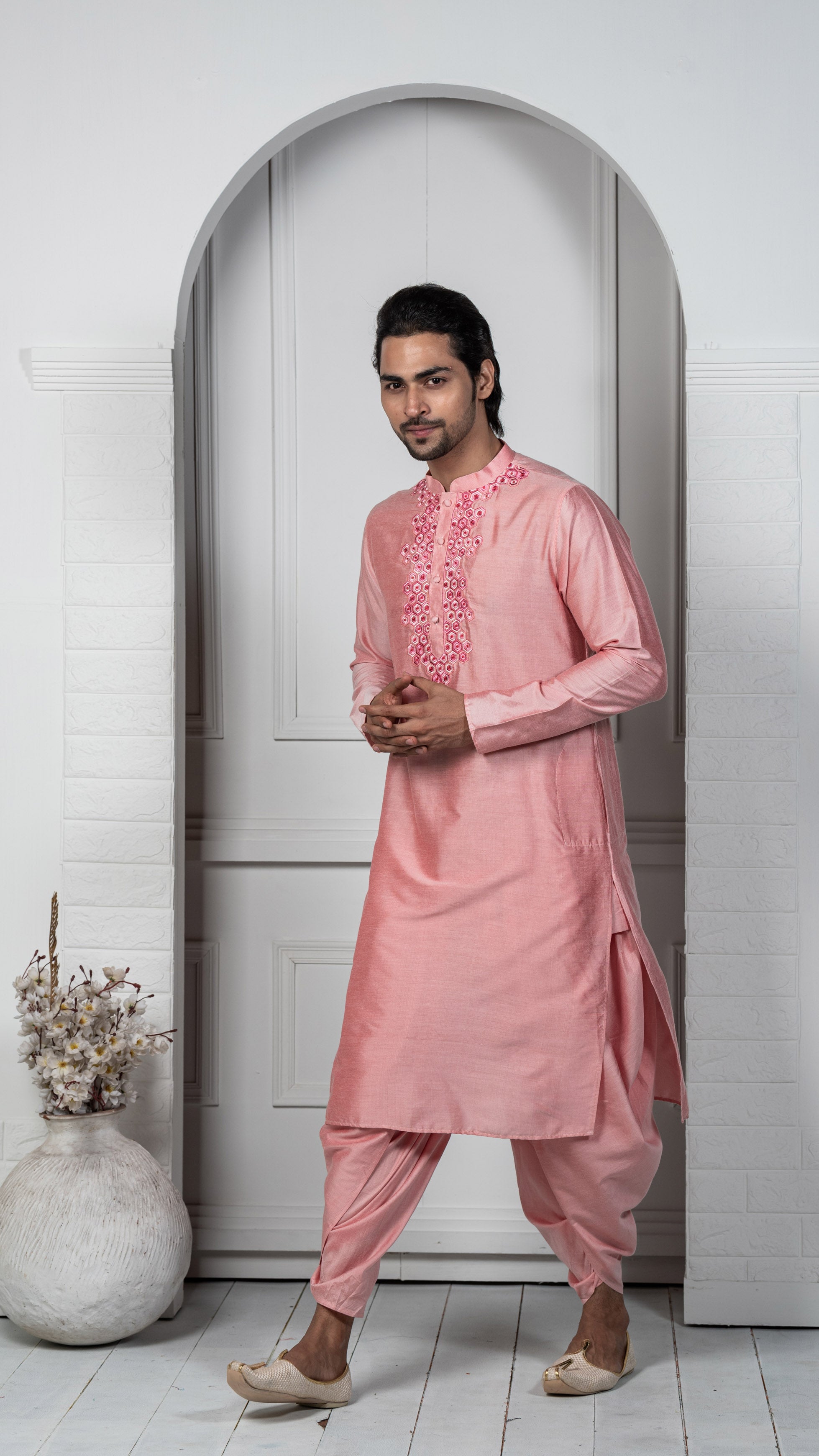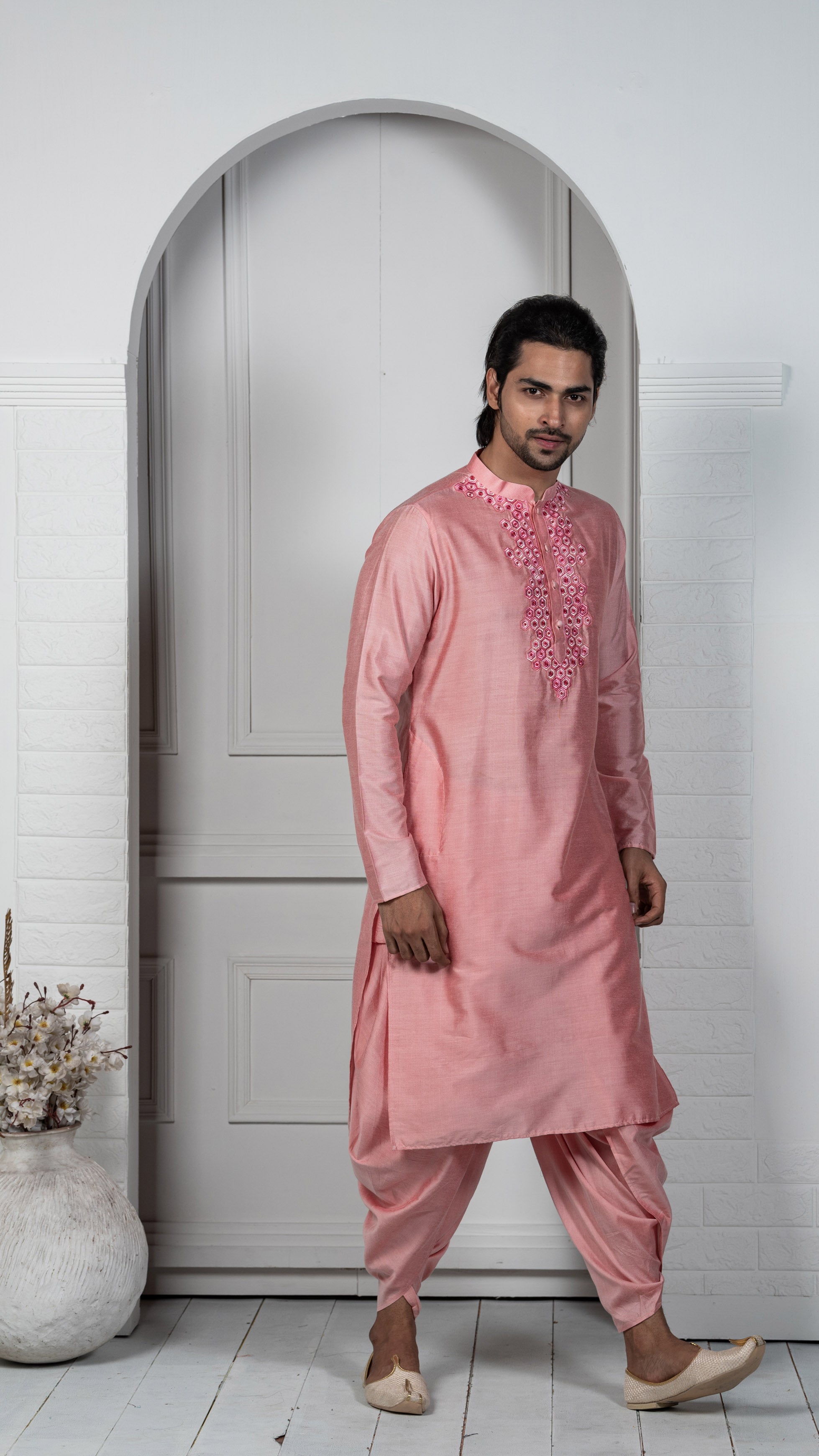 This kurta will be a great addition to your wardrobe for this season. The stylish, long sleeve style and mandarin collar gives an elegant look.