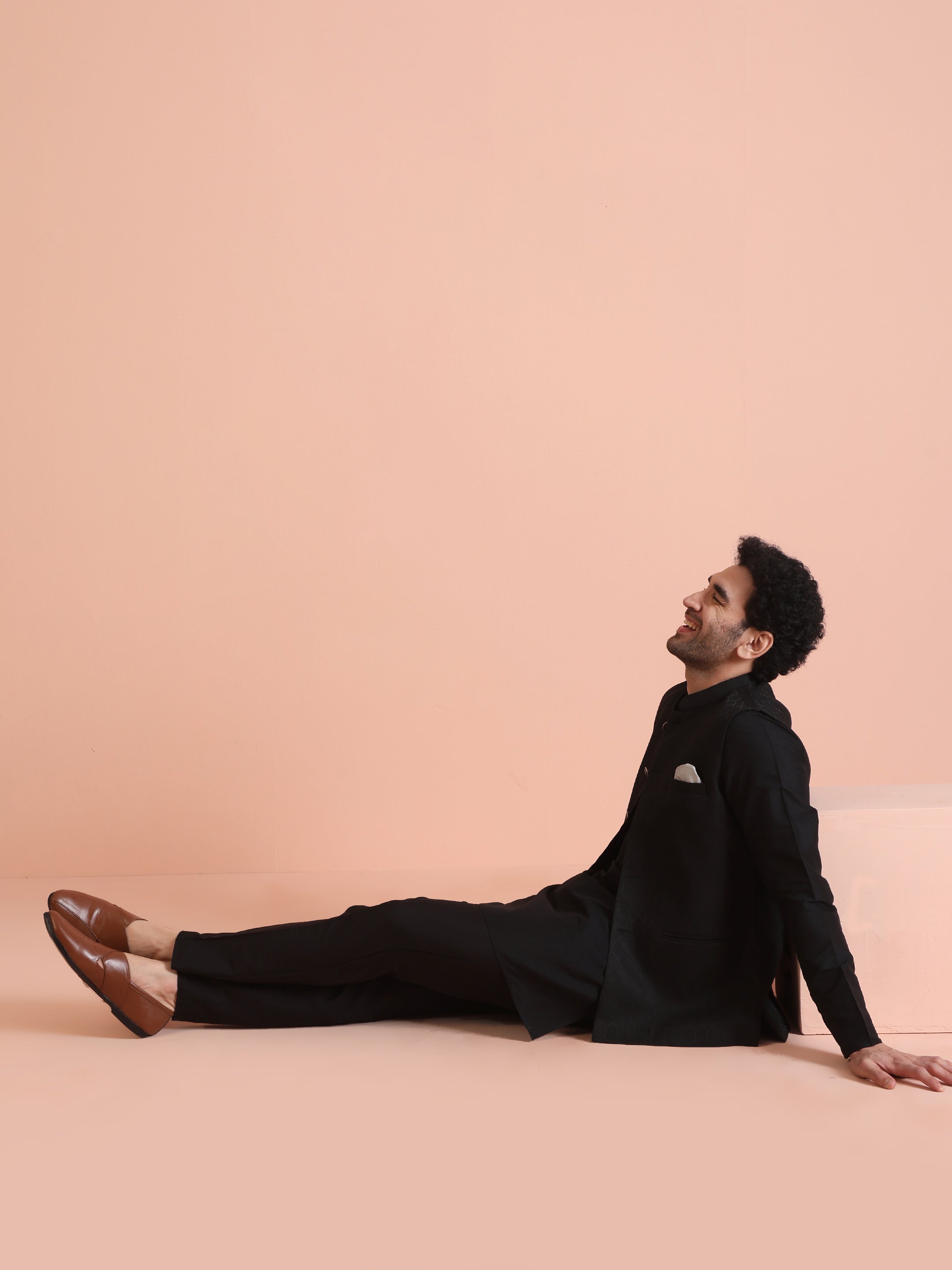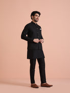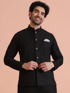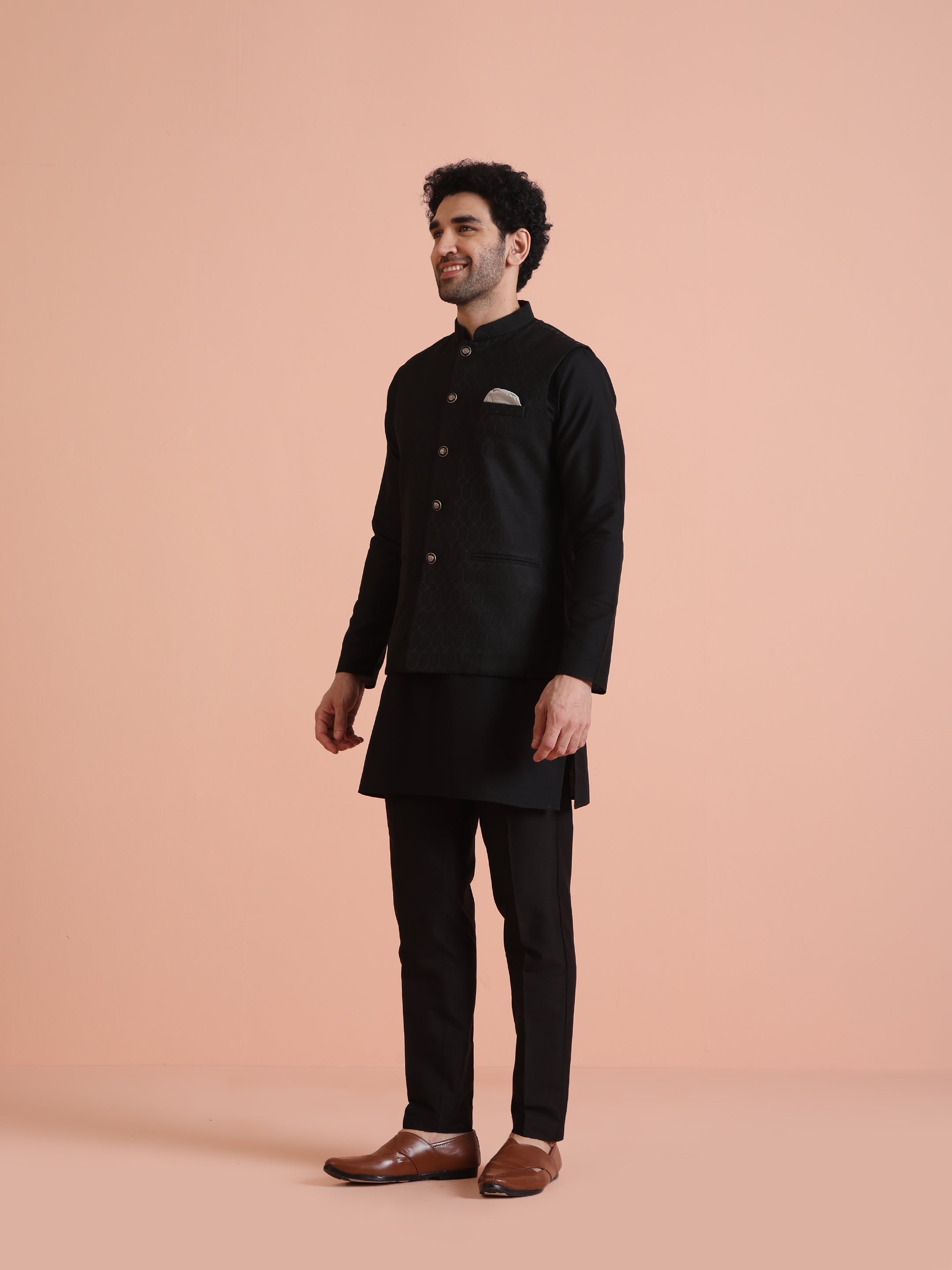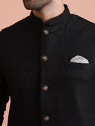 This black silk blend jacquard jacket features a woven jacquard design and regular fit. Ideal for pairing with kurtas, it adds sophistication to your ethnic wear collection.