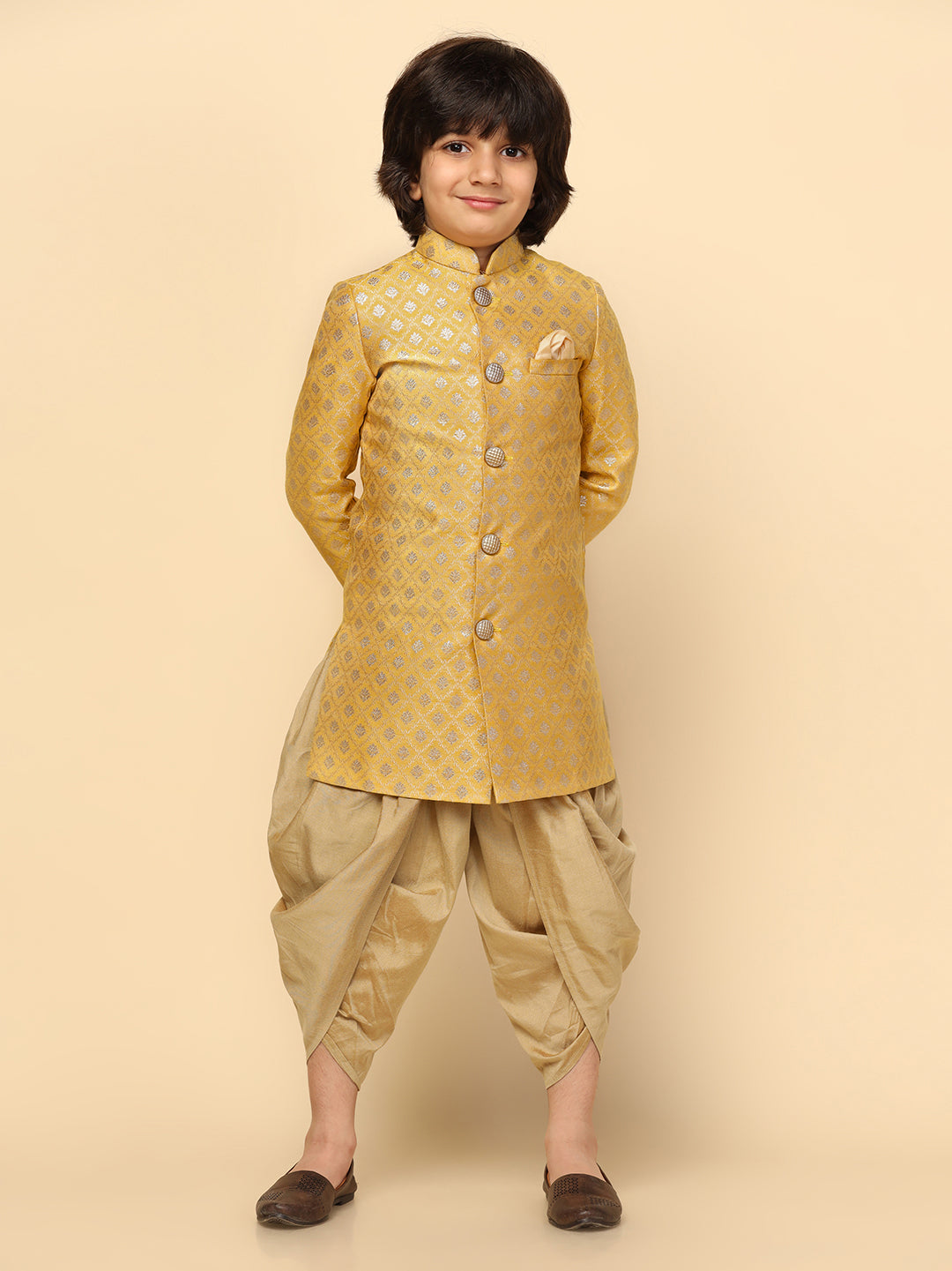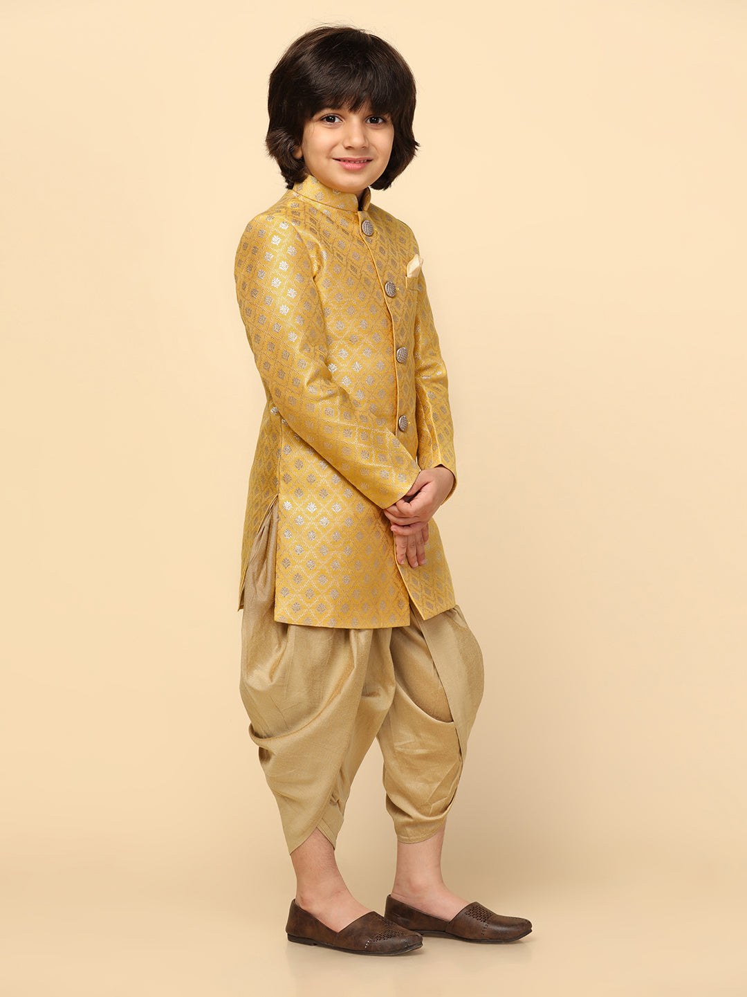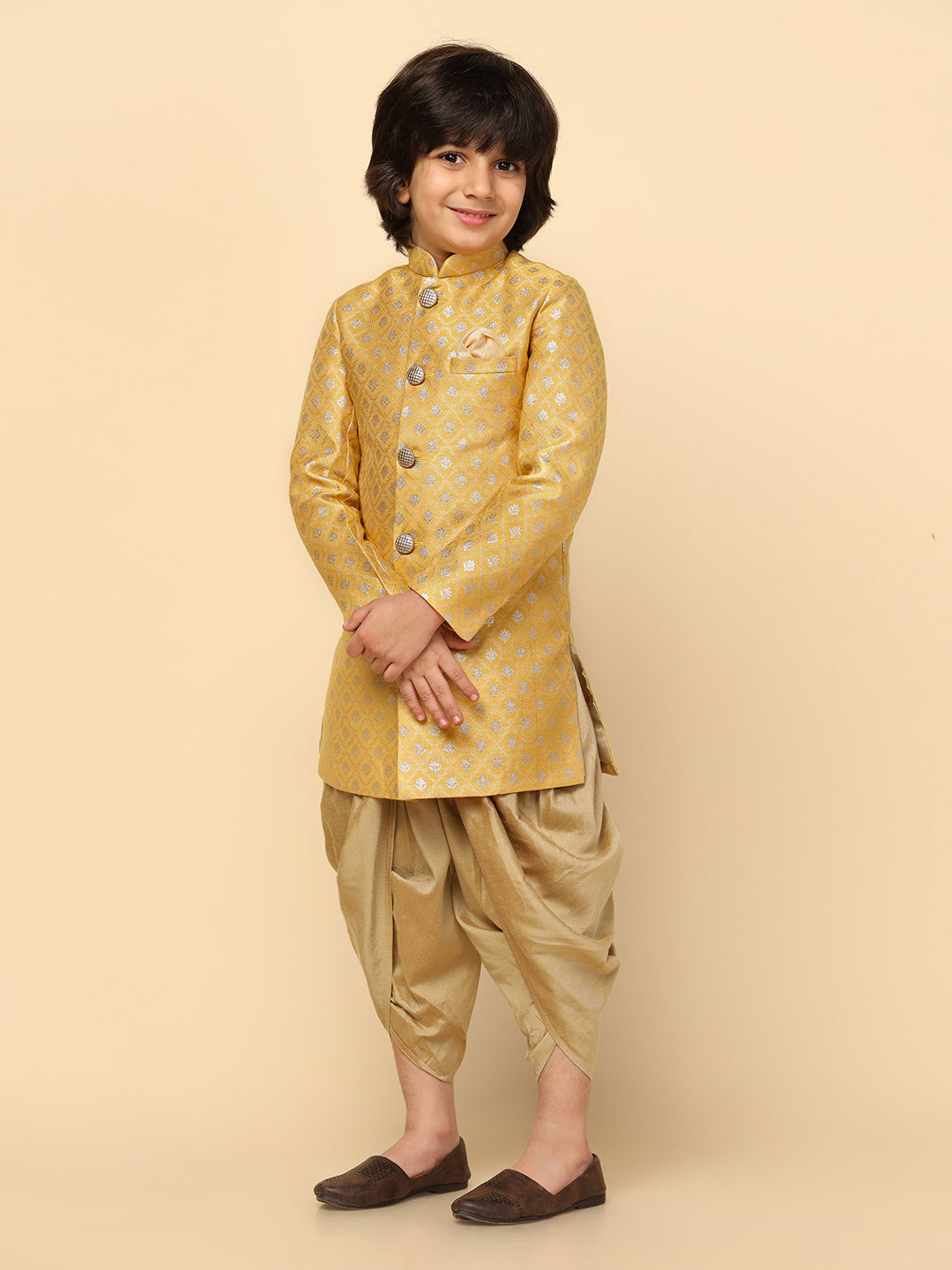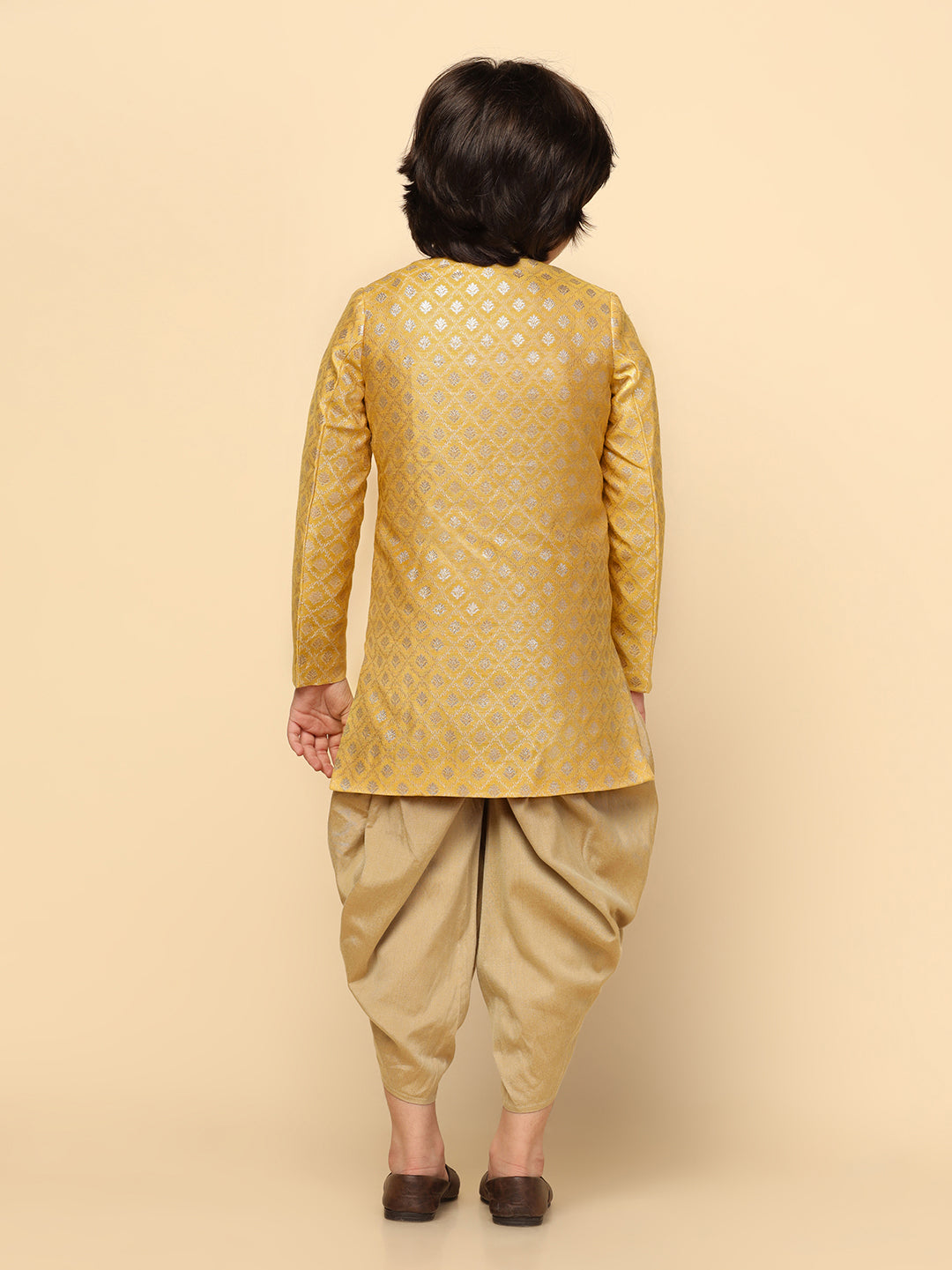 Boy's Yellow Textured Indowestern Dhoti Set