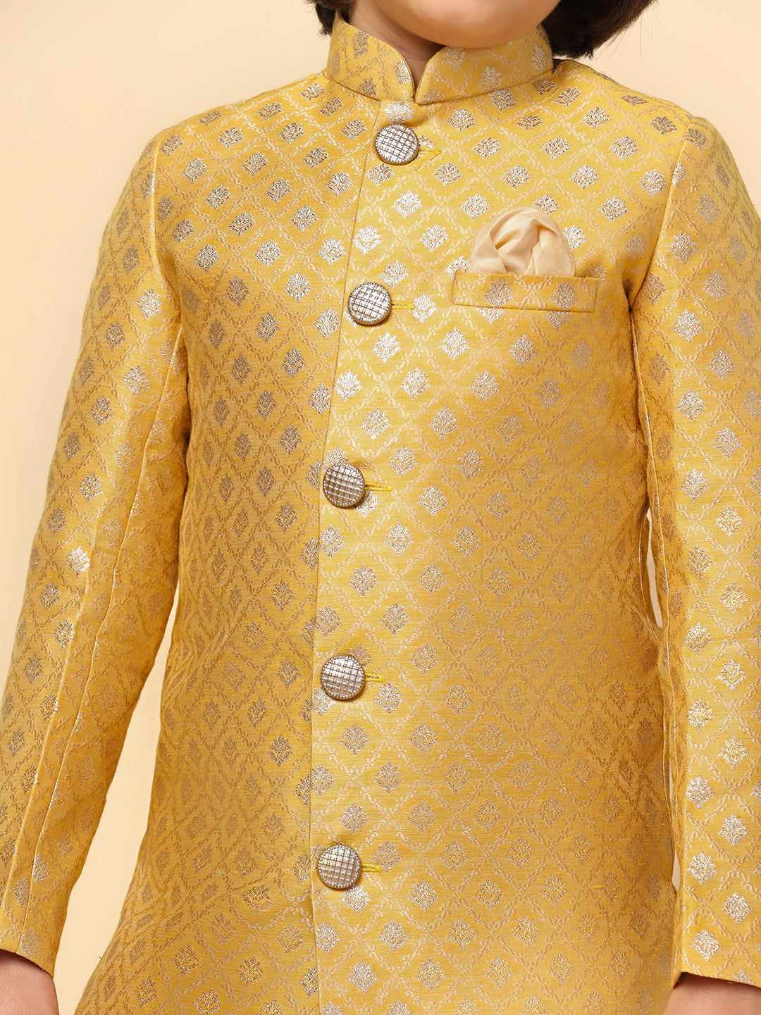 Elevate your ethnic wear with this yellow textured silk blend jacquard indowestern and dhoti set. The regular fit ensures a sharp and elegant look.