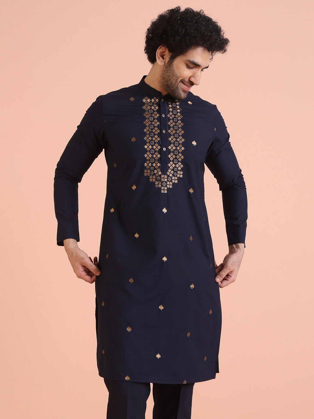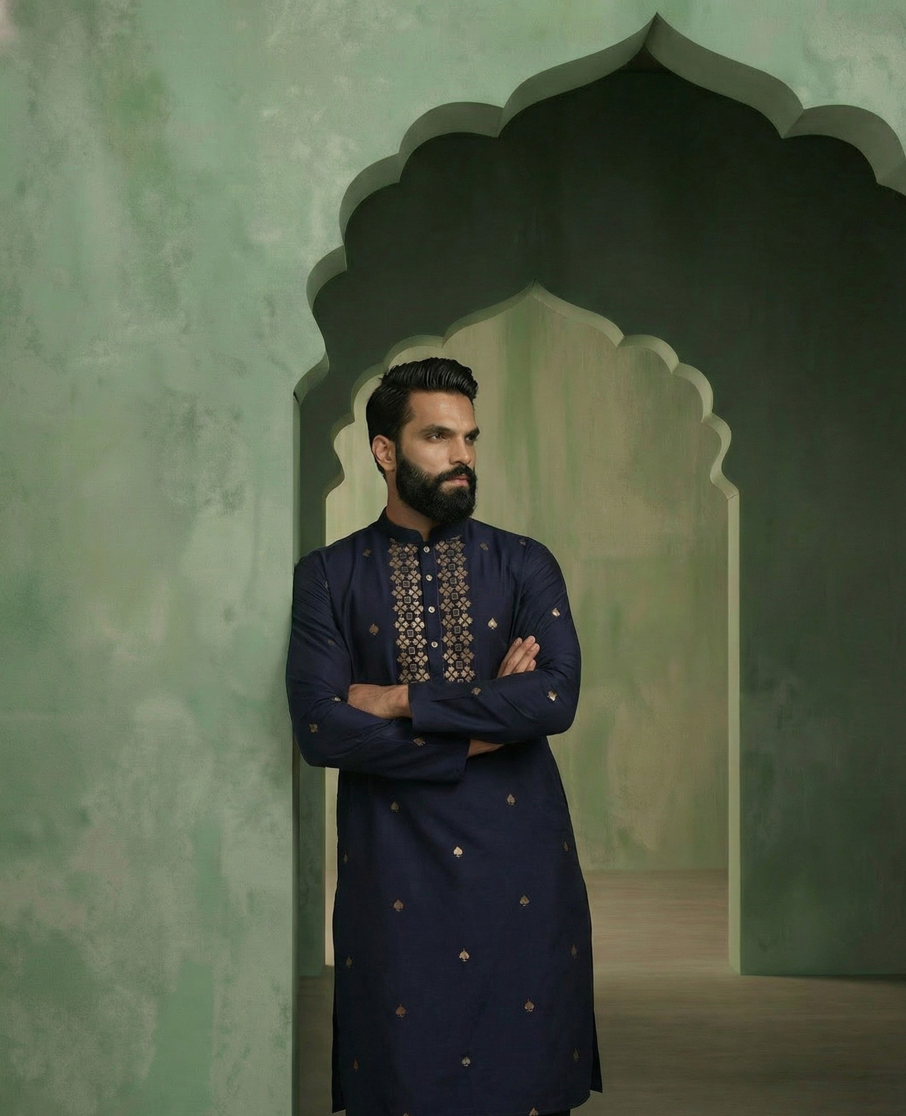 Elegant Navy Blue Kurta crafted from Cotton Silk with intricate embroidery. Perfect for festive occasions and traditional celebrations. Ideal for Eid festival.