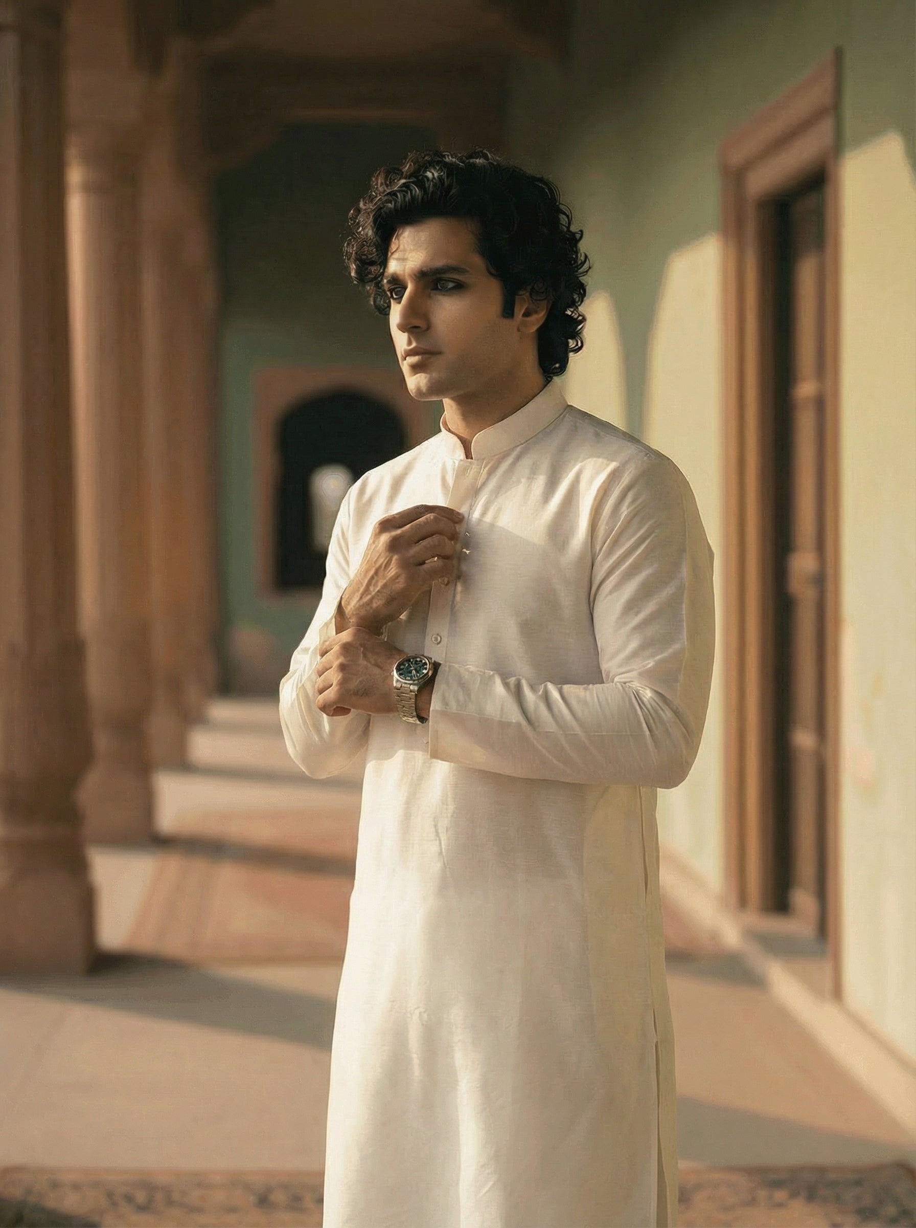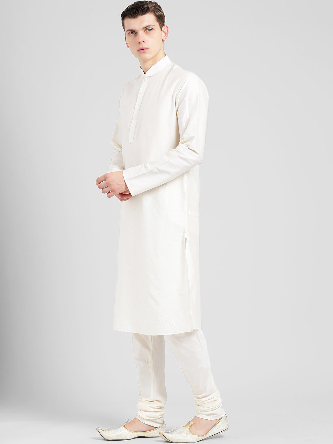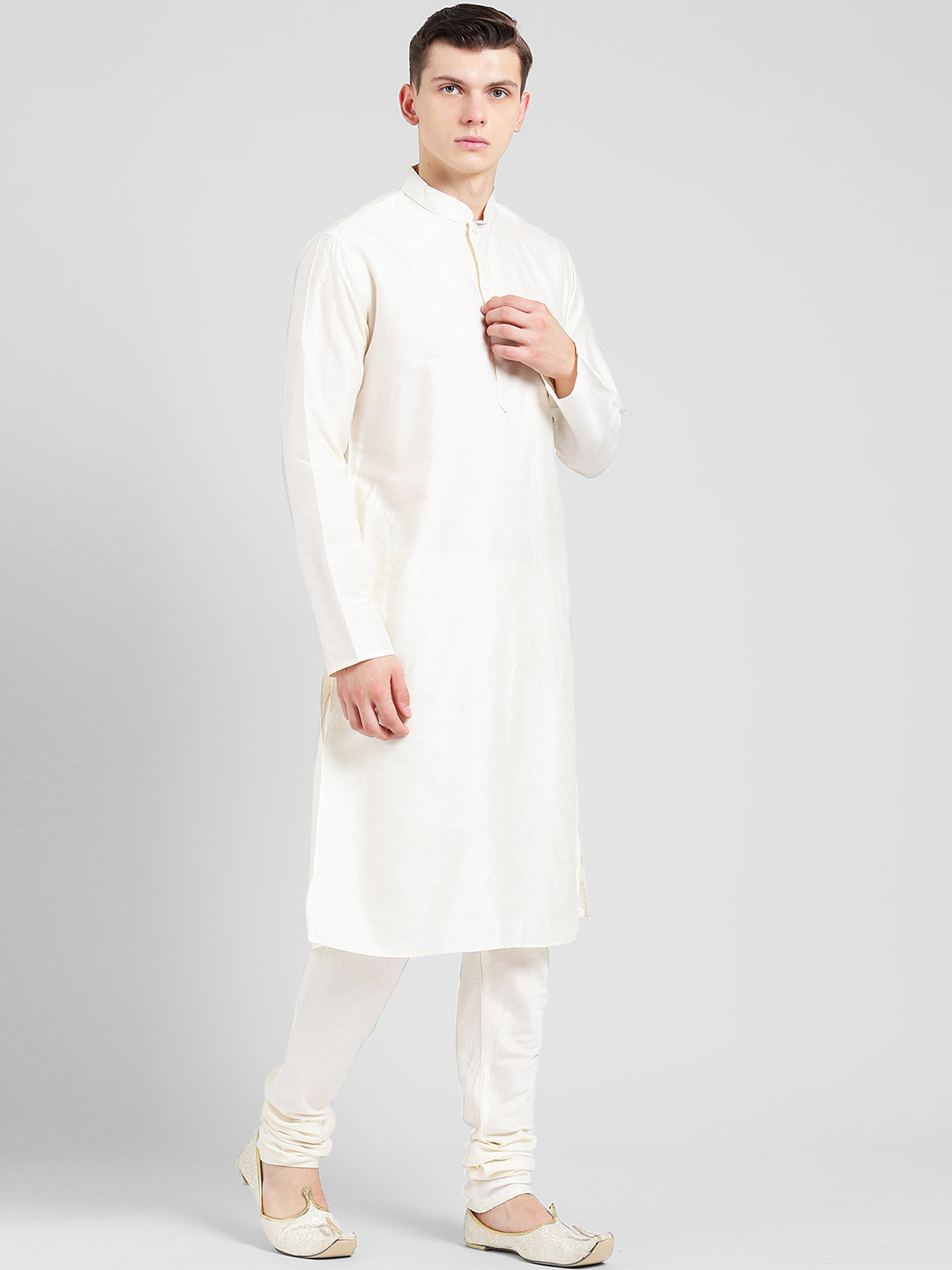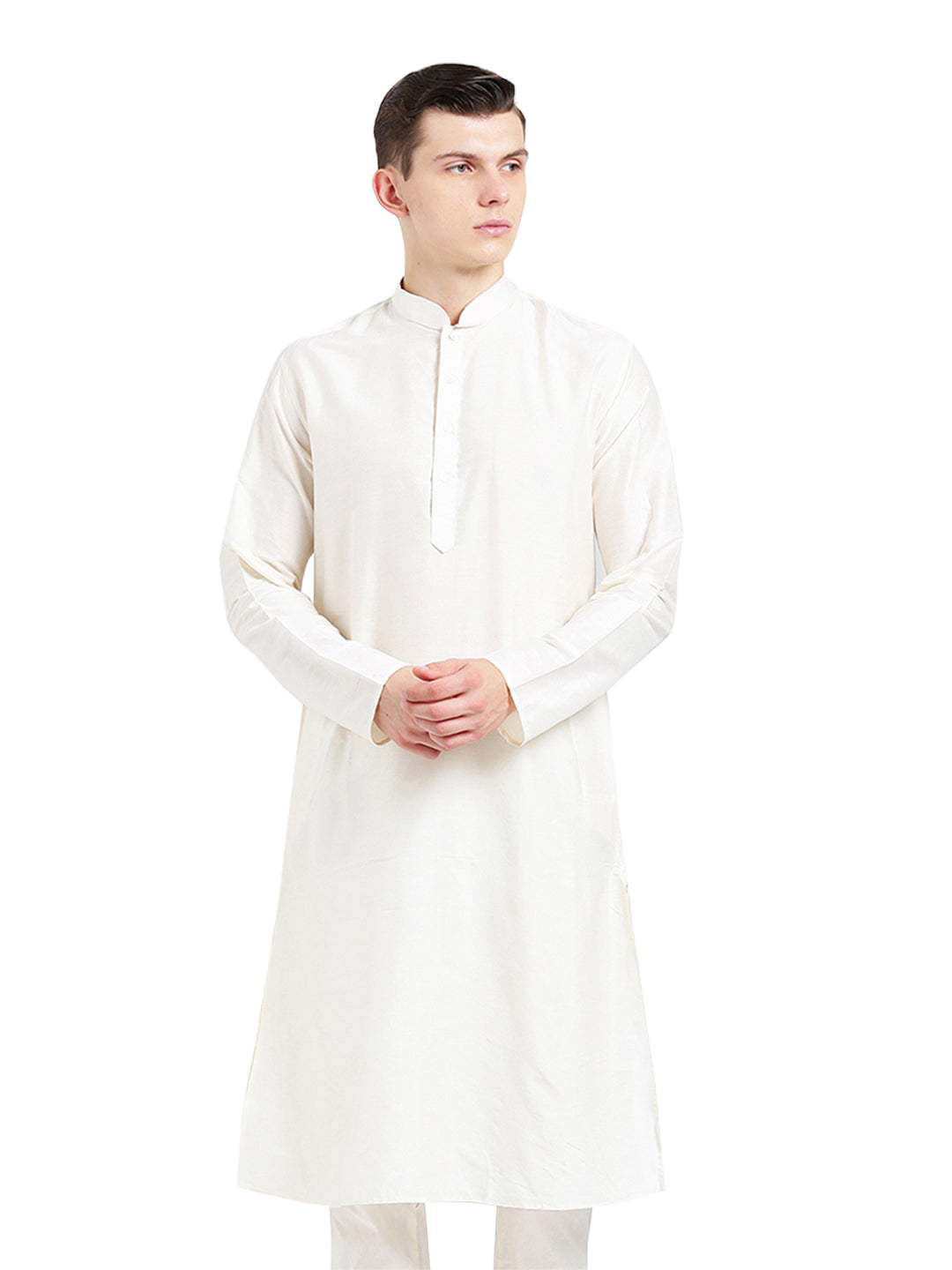 Off-White Plain Kurta crafted from a cotton blend for daily wear. Features a mandarin collar and full sleeves, perfect for casual or festive occasions. Ideal for Eid festival.
