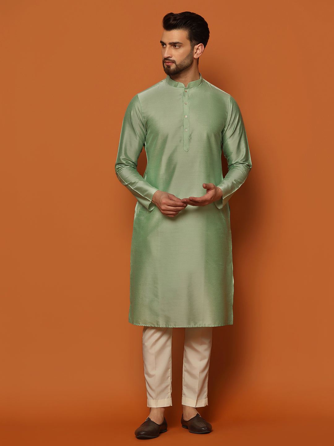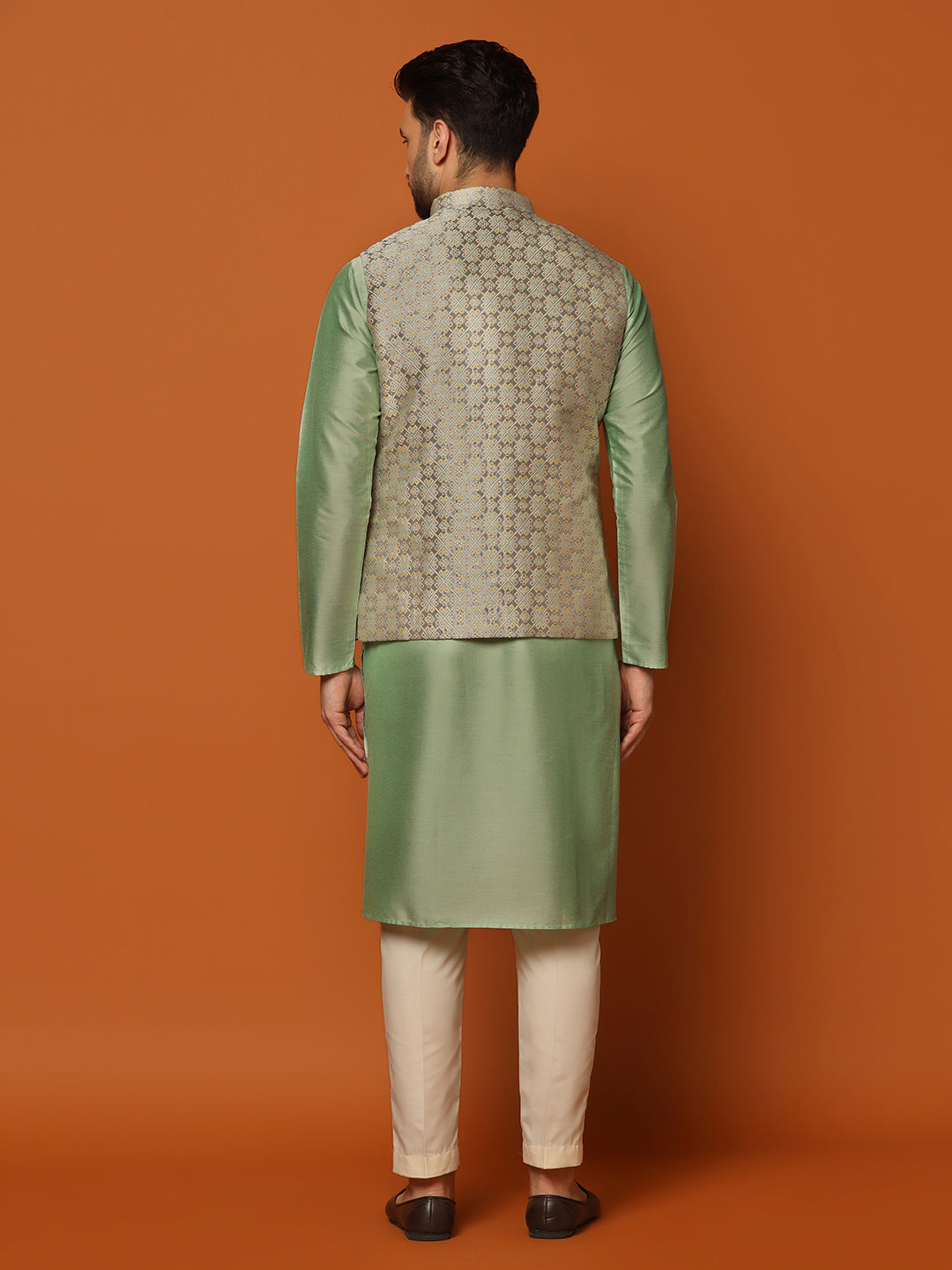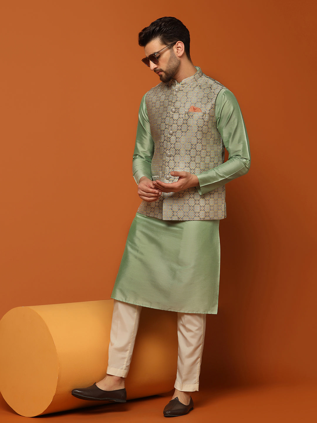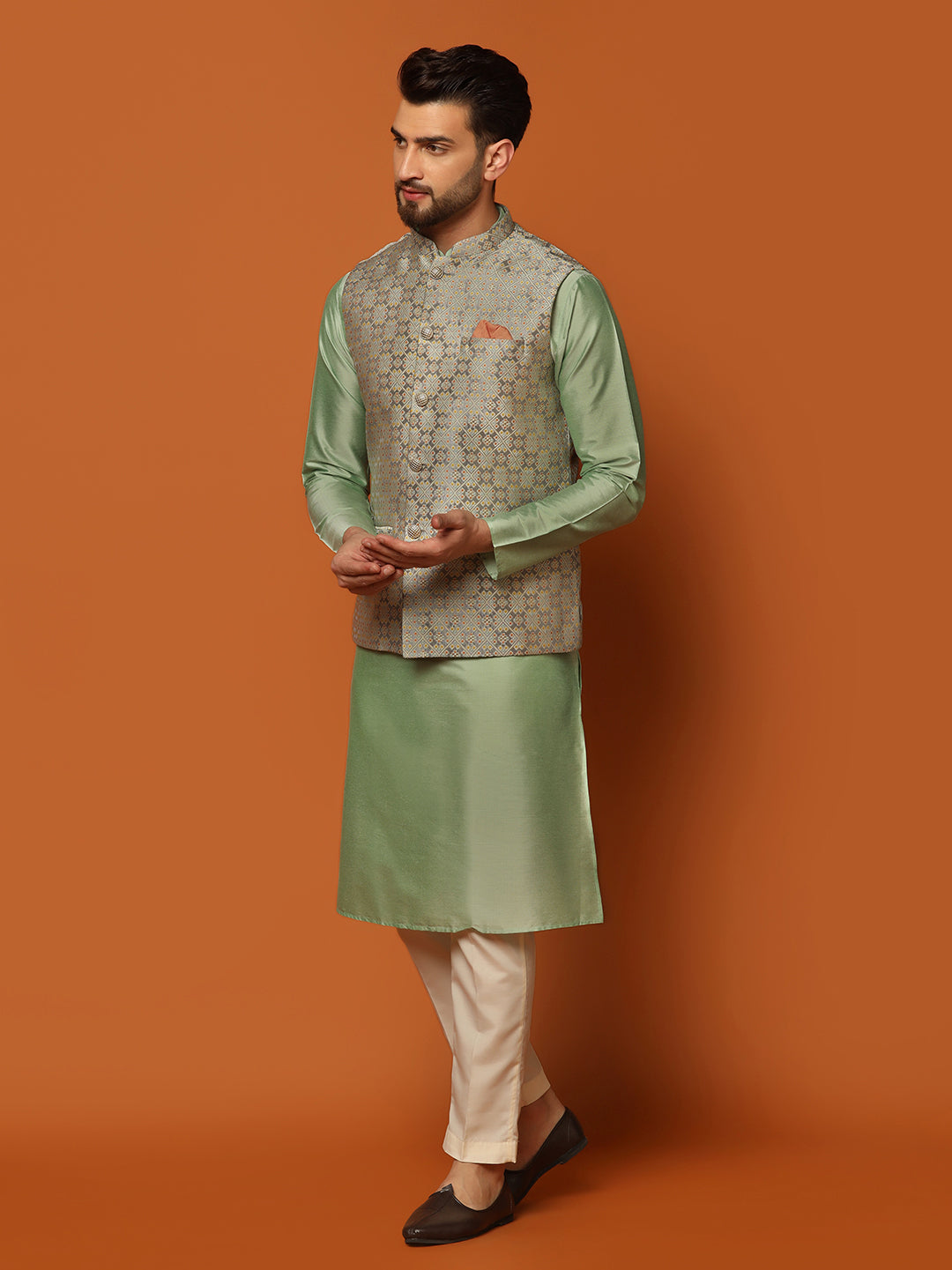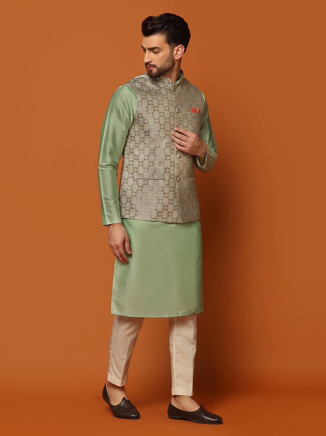 Enhance your ethnic wardrobe with this grey silk blend jacquard kurta, jacket, and trouser set. Featuring a textured design and regular fit, itÃÆs¢â‚¬â„¢s perfect for festive occasions.
