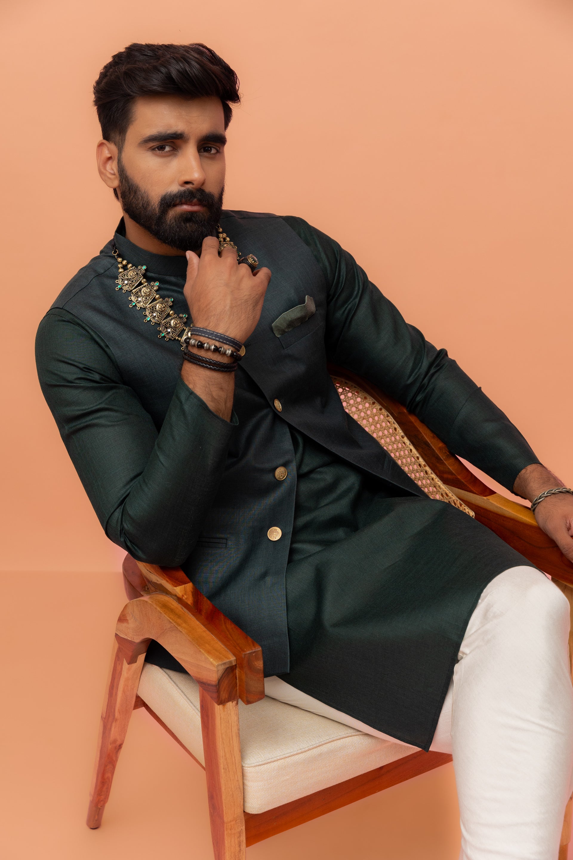 This green cotton blend kurta, jacket, and churidar set features a solid design and regular fit. Ideal for traditional events, it combines style and comfort effortlessly.