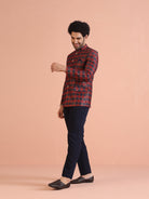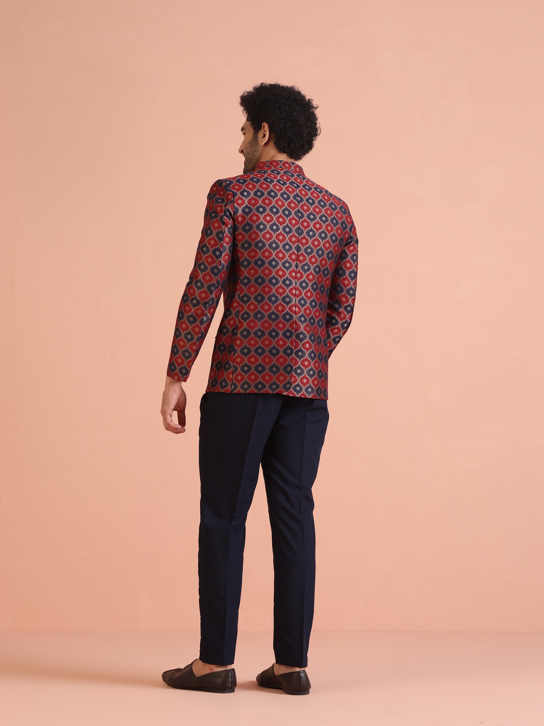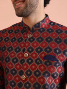 Stand out in this maroon and navy blue silk blend jacquard textured bandhgala and trouser set. Its textured jacquard design offers a regal and polished look for traditional events.