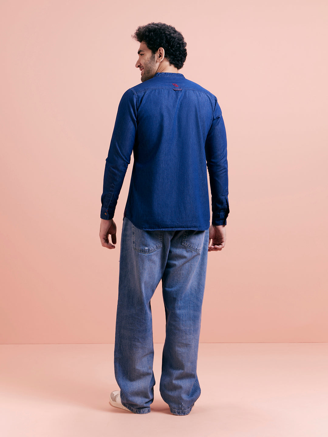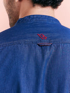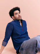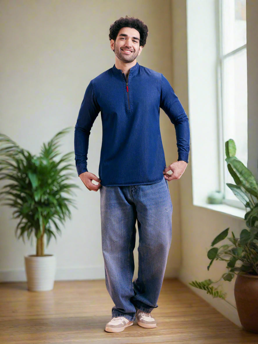 Tailored denim short kurta in breathable cotton with contrast zipper tab, ideal for casual weekend or outdoor dressing.