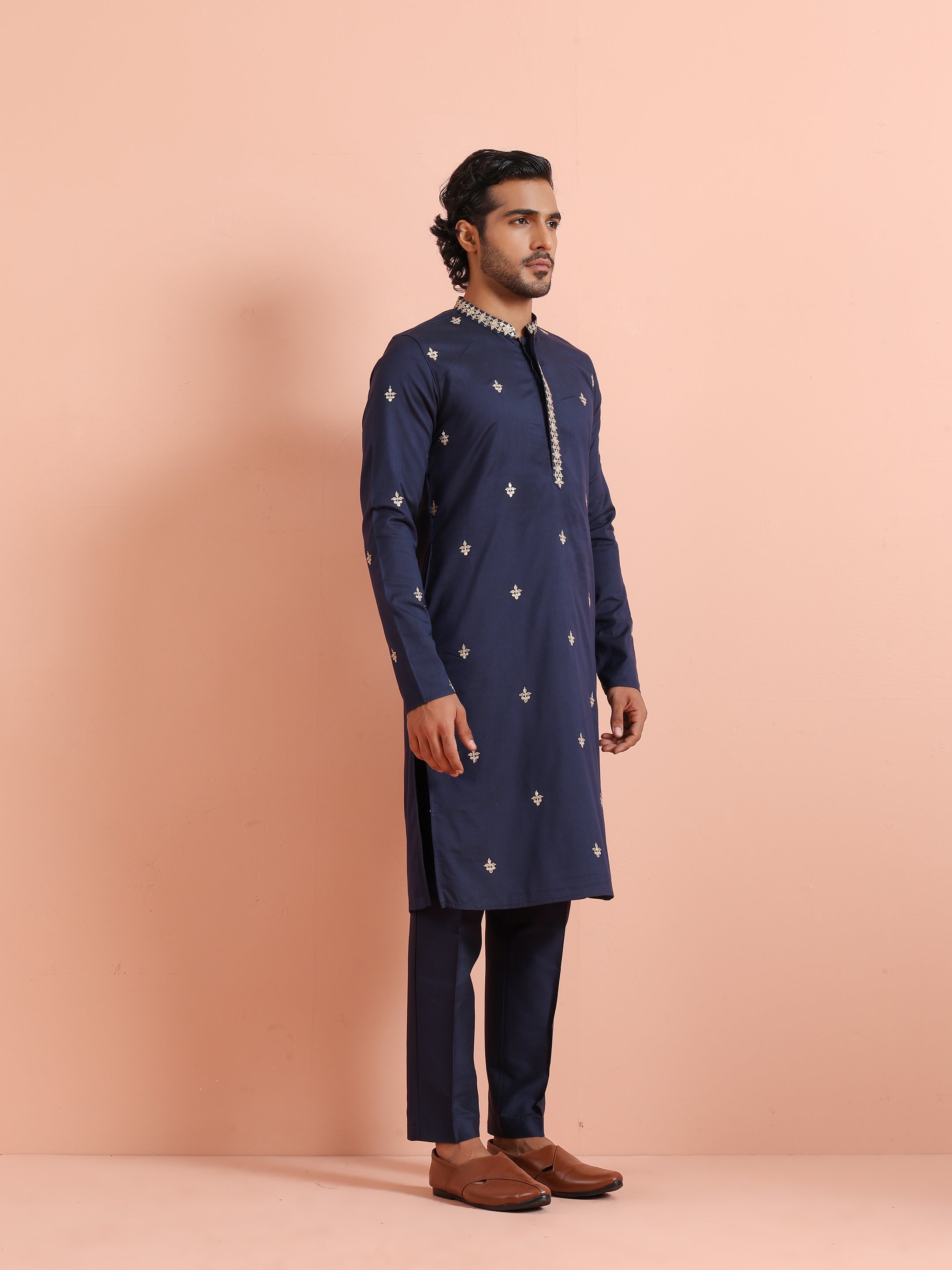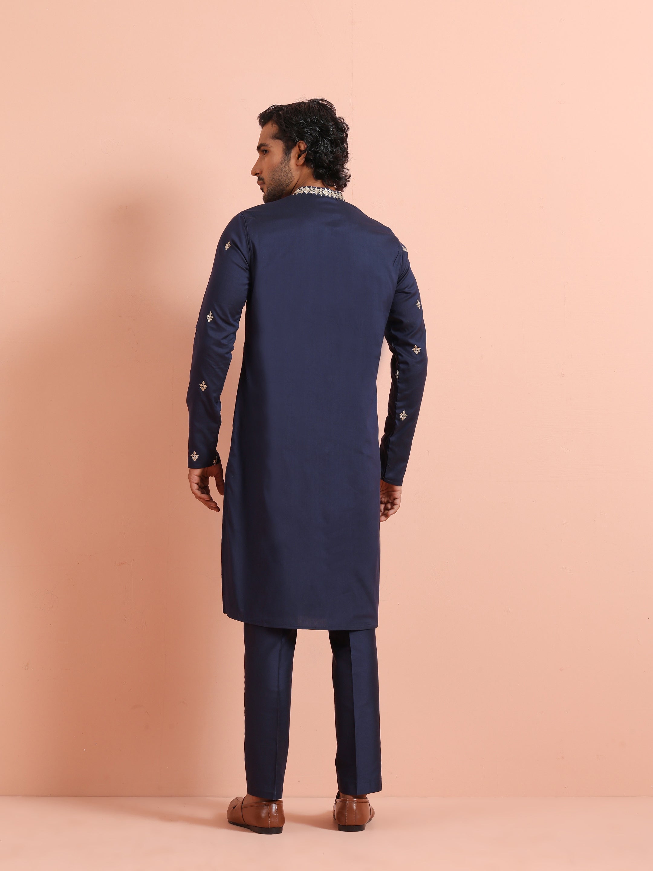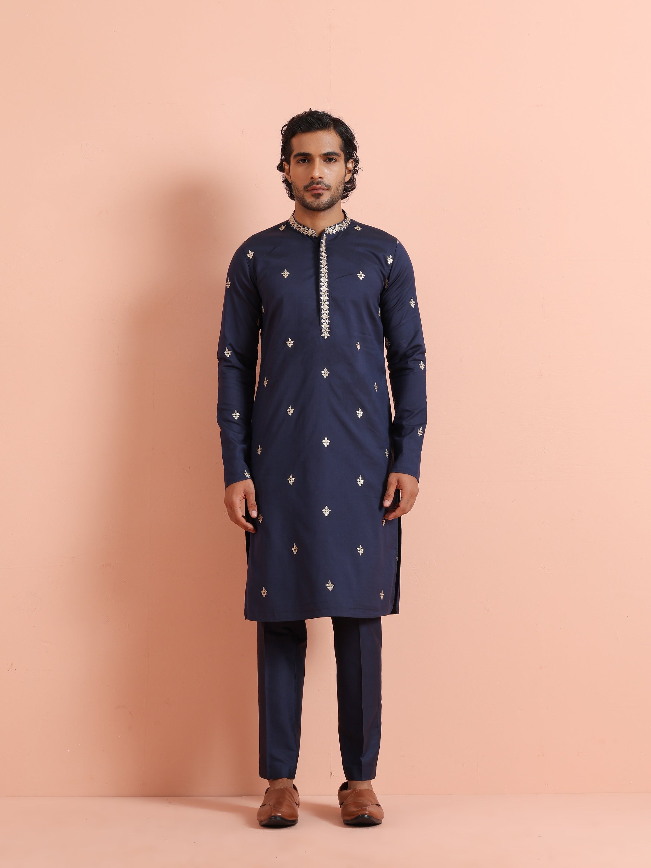 Navy blue silk blend kurta trouser set with embroidered neckline & motifs. Elegant festive wear outfit for weddings, receptions & special occasions.