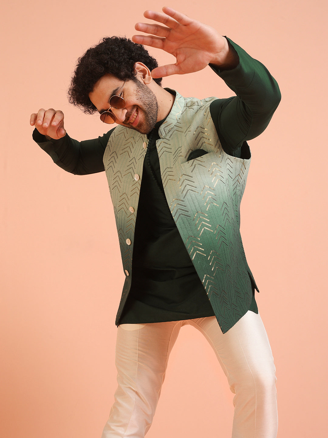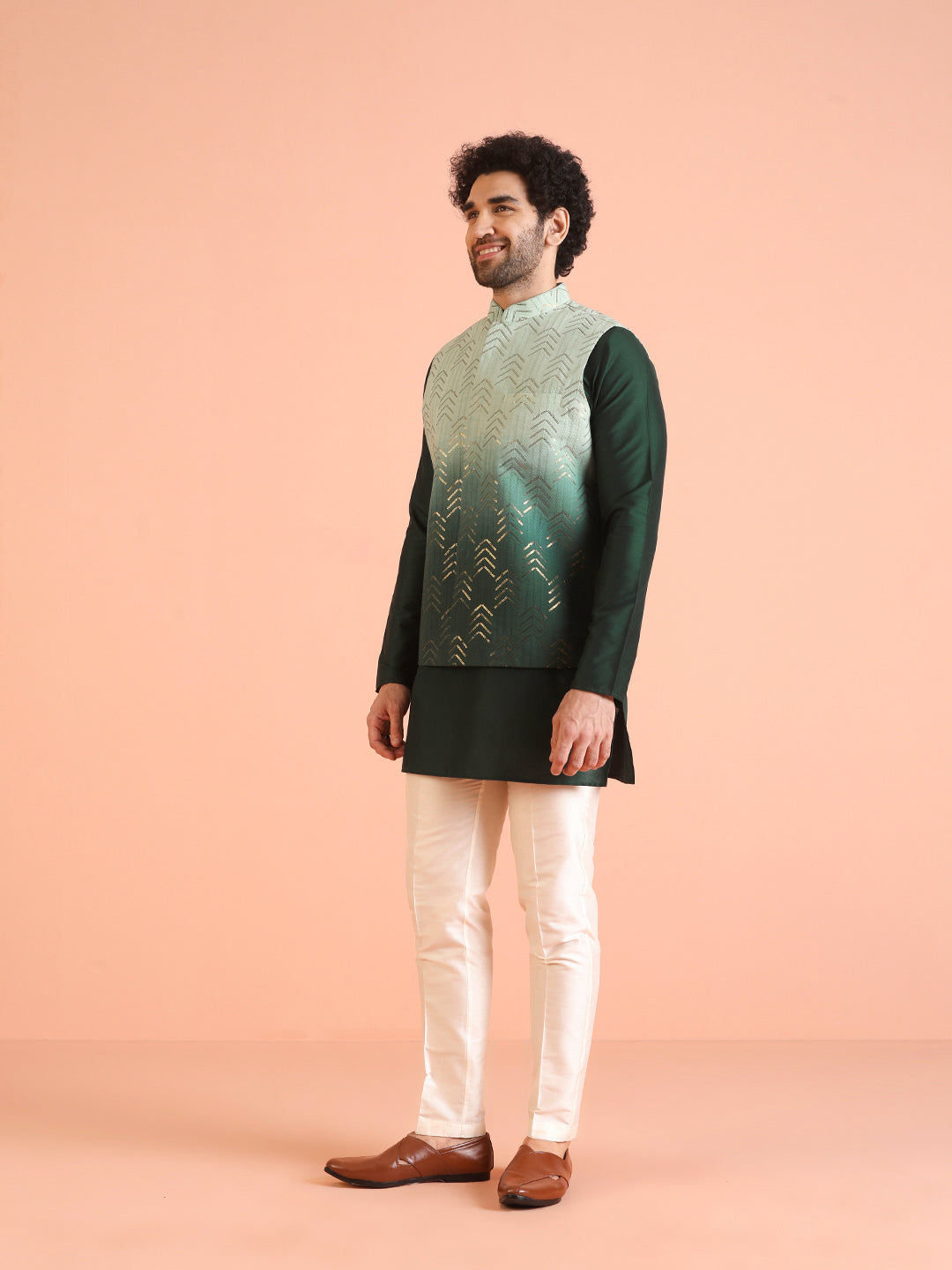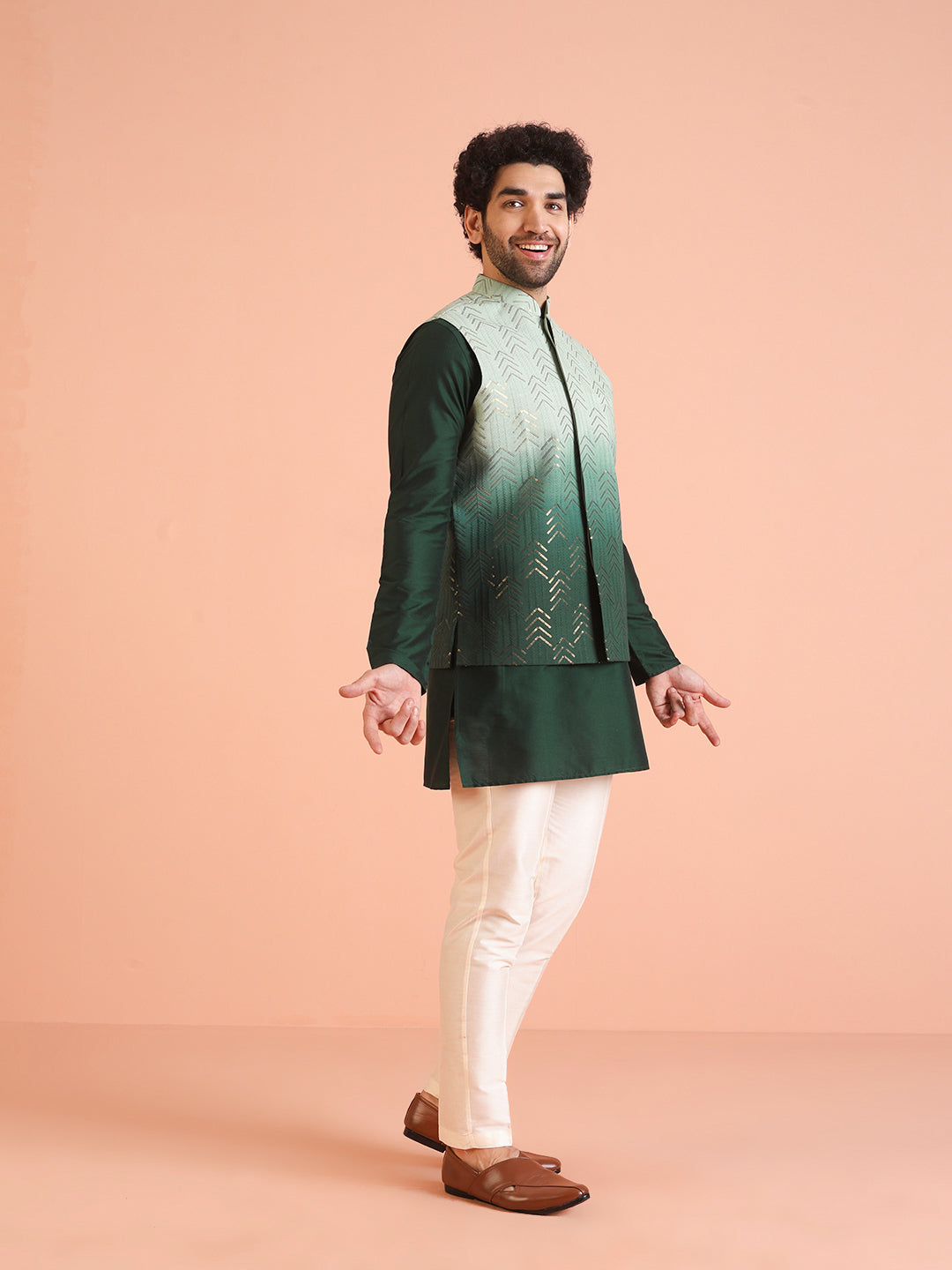 Experience classic elegance with this Men Ombre Embellished Sequinned Mid Kurta Jacket Trouser Set. The Embellished Pattern adds a refined touch, while the breathable Cotton fabric ensures comfort throughout the day. Ideal for festive events or casual wear, this Mid Kurta Jacket Trouser Set is a wardrobe essential..