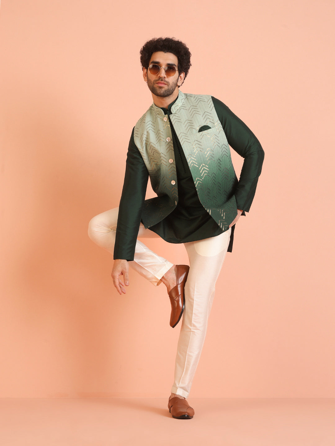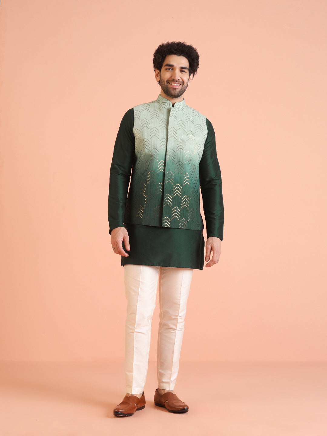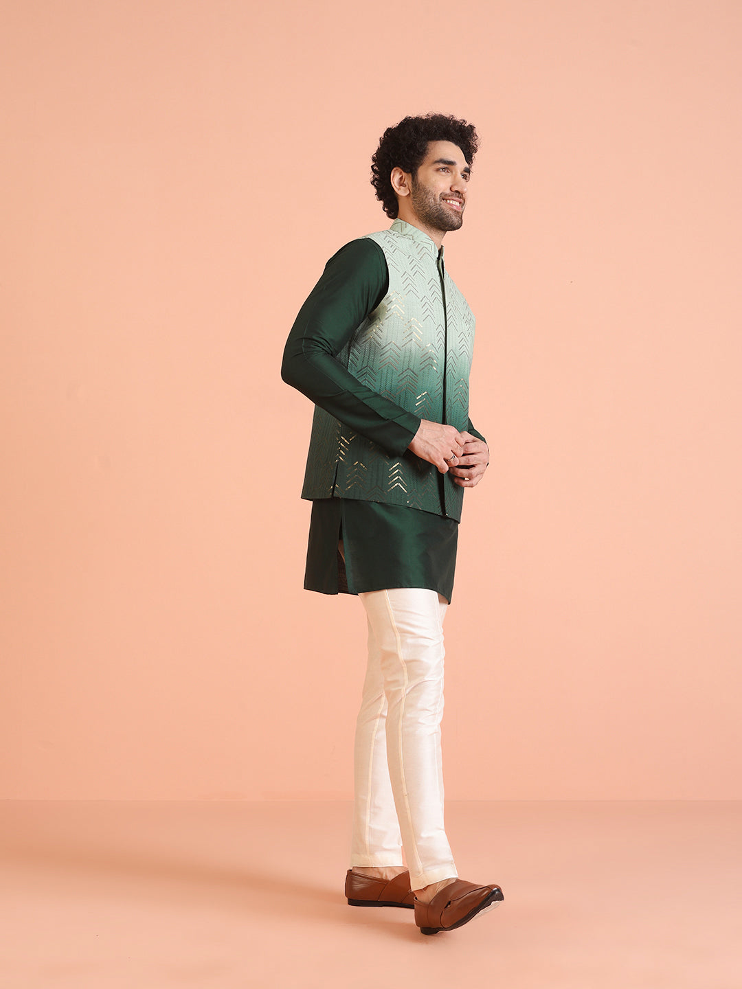 Experience classic elegance with this Men Ombre Embellished Sequinned Mid Kurta Jacket Trouser Set. The Embellished Pattern adds a refined touch, while the breathable Cotton fabric ensures comfort throughout the day. Ideal for festive events or casual wear, this Mid Kurta Jacket Trouser Set is a wardrobe essential..