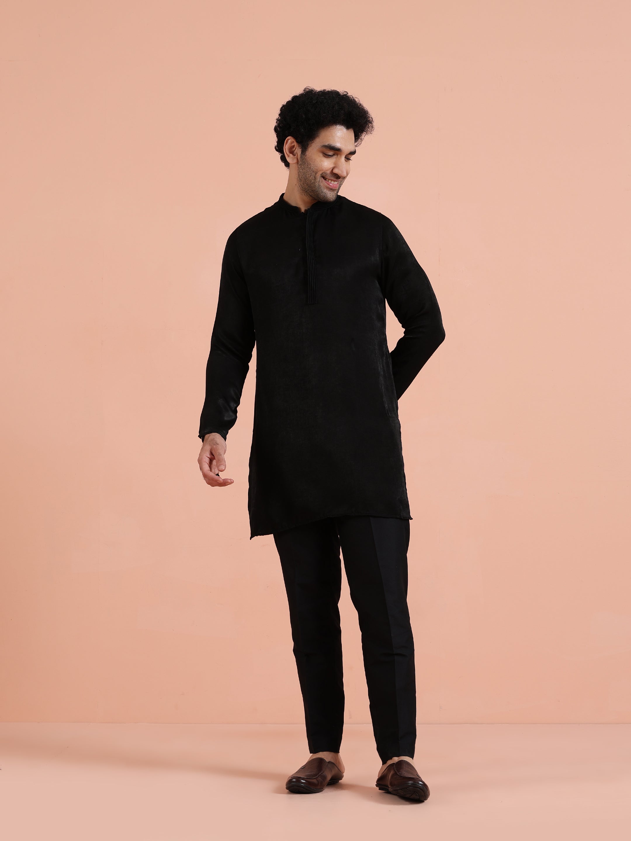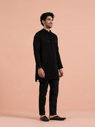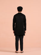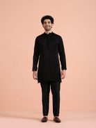 Black solid cotton kurta trouser set minimalistic ethnicwear for men, ideal for festive, wedding, and cultural occasions.