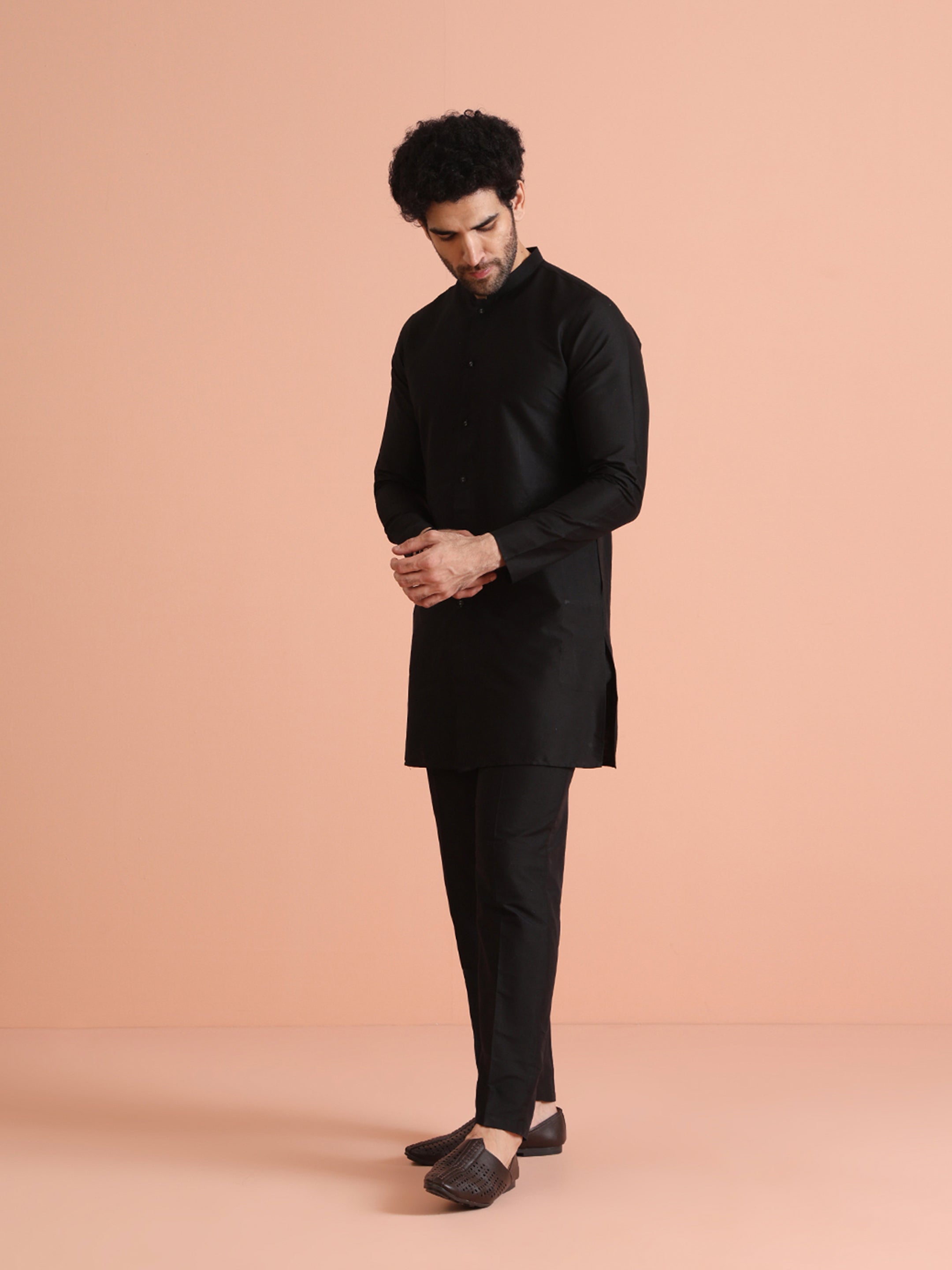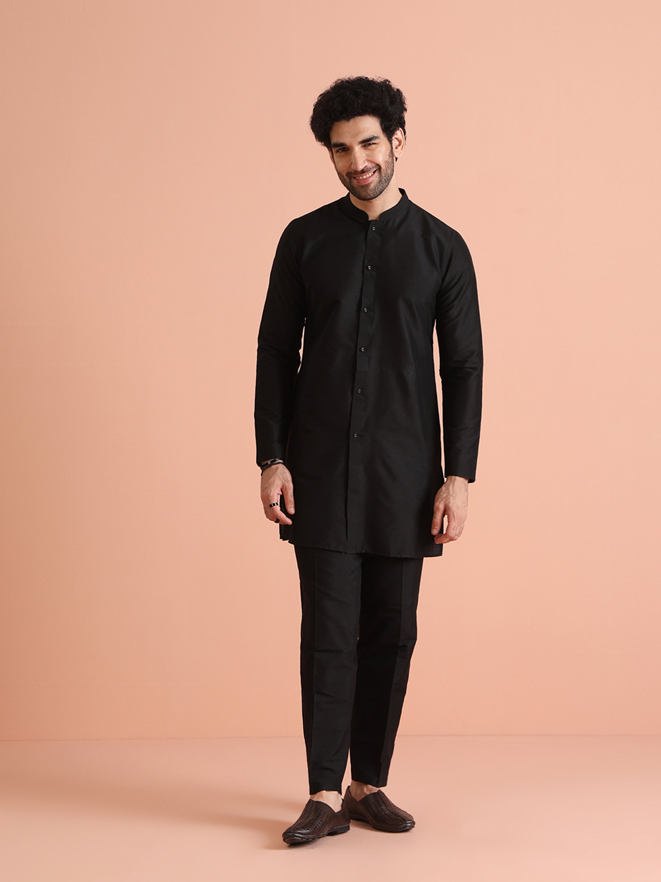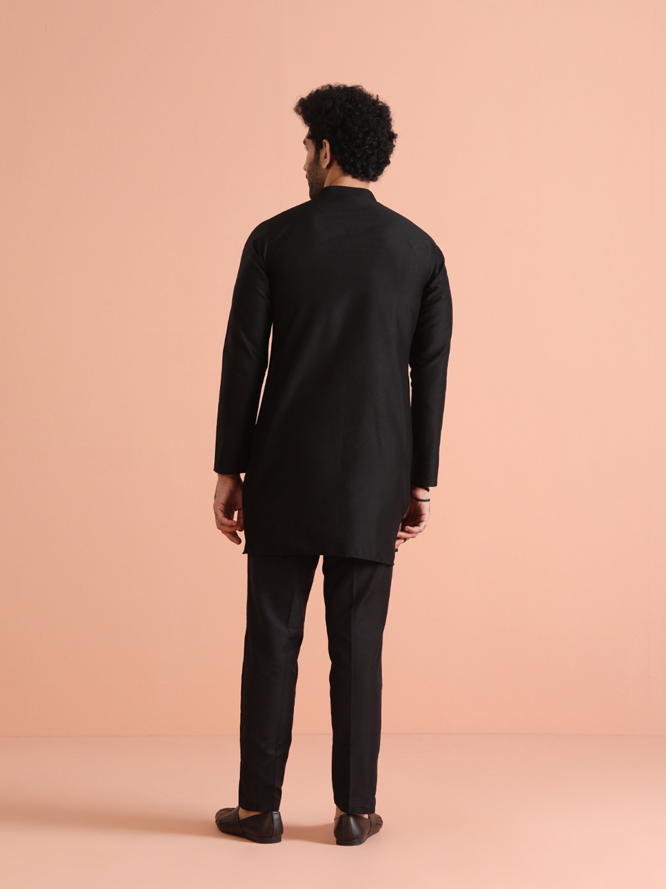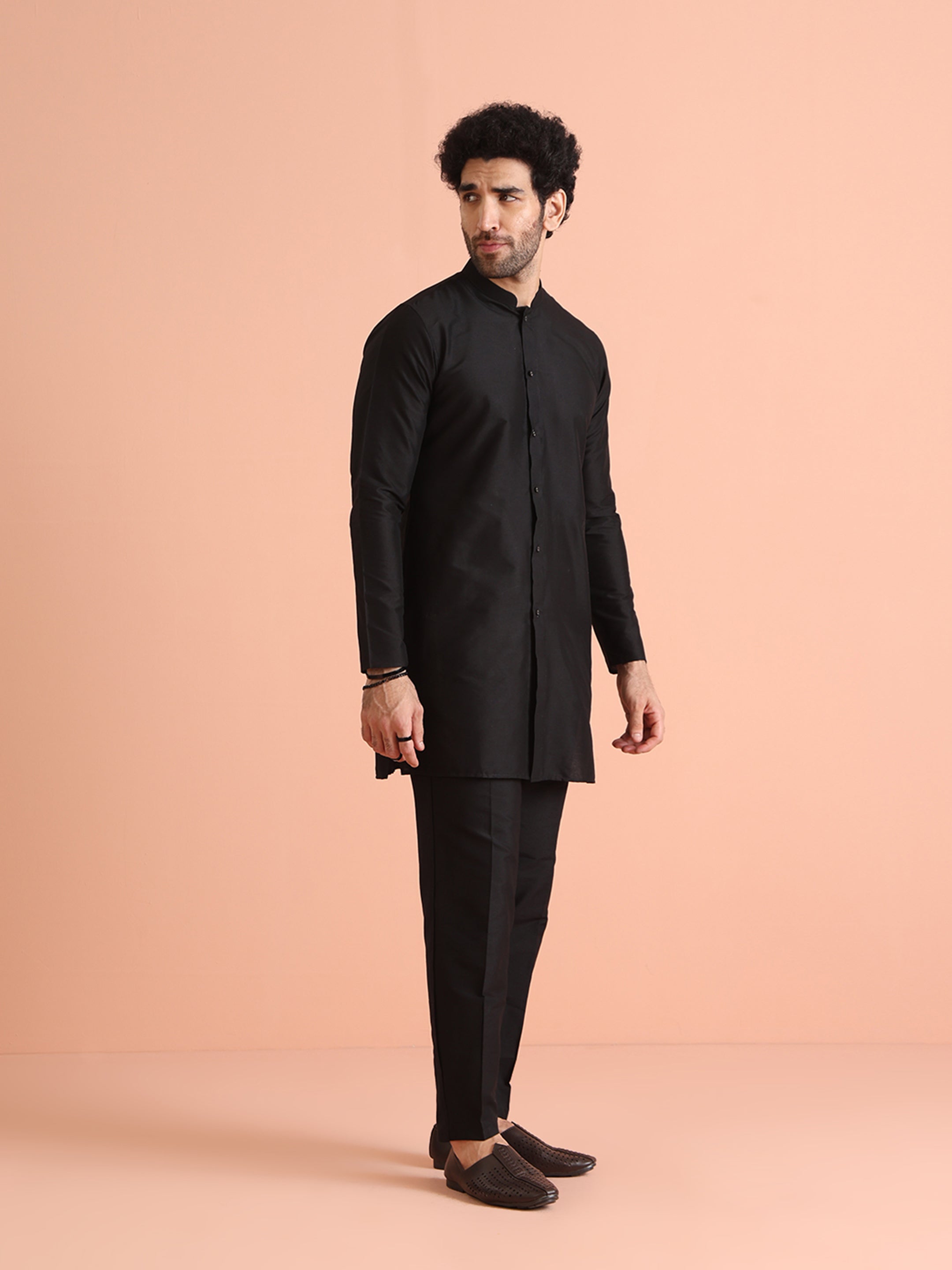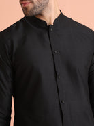 Elegant Black Front Open Mid Kurta Trouser Set crafted from Cotton Blend fabric. Perfect for festive and formal occasions. Ideal for Eid festival.