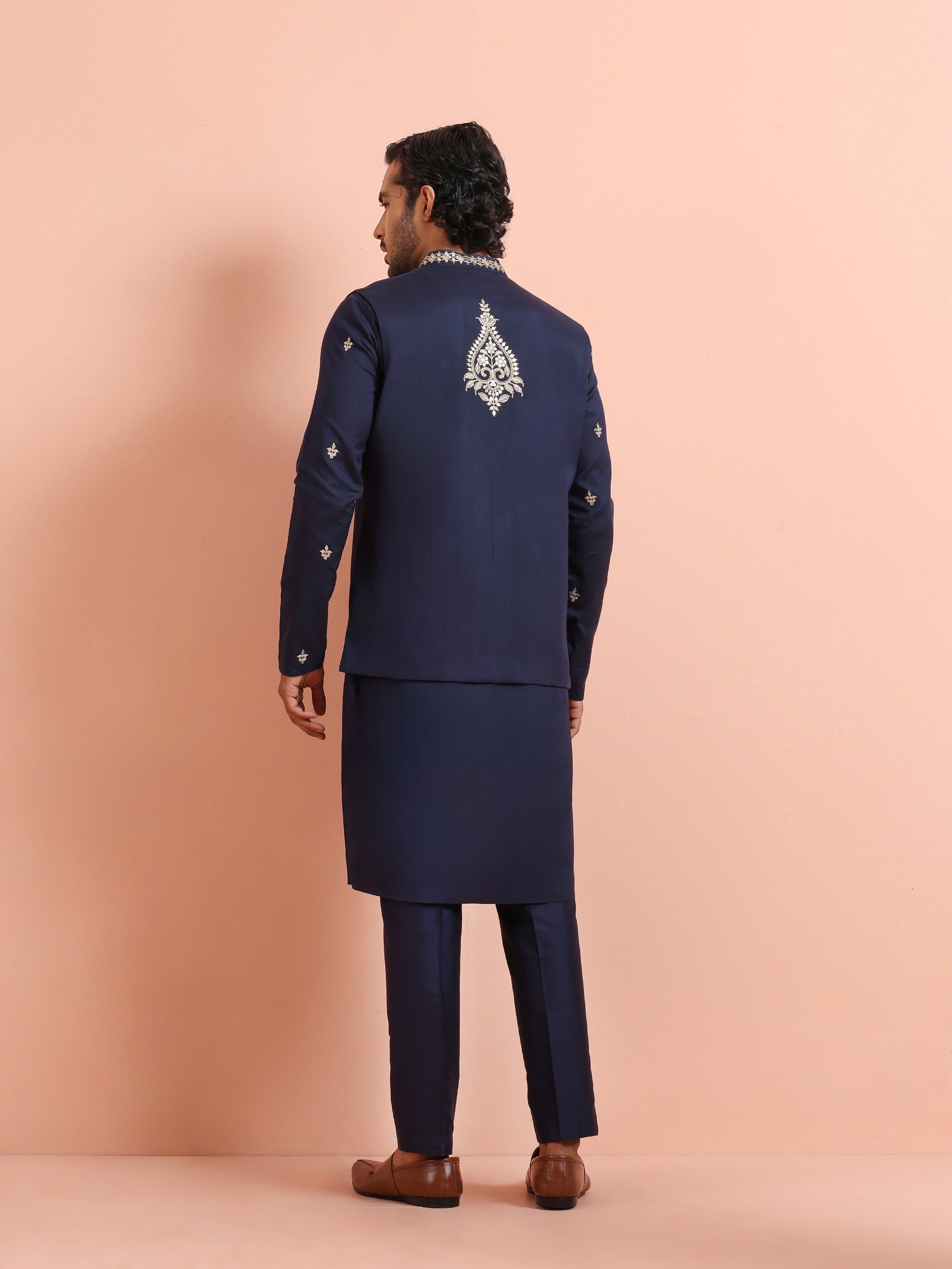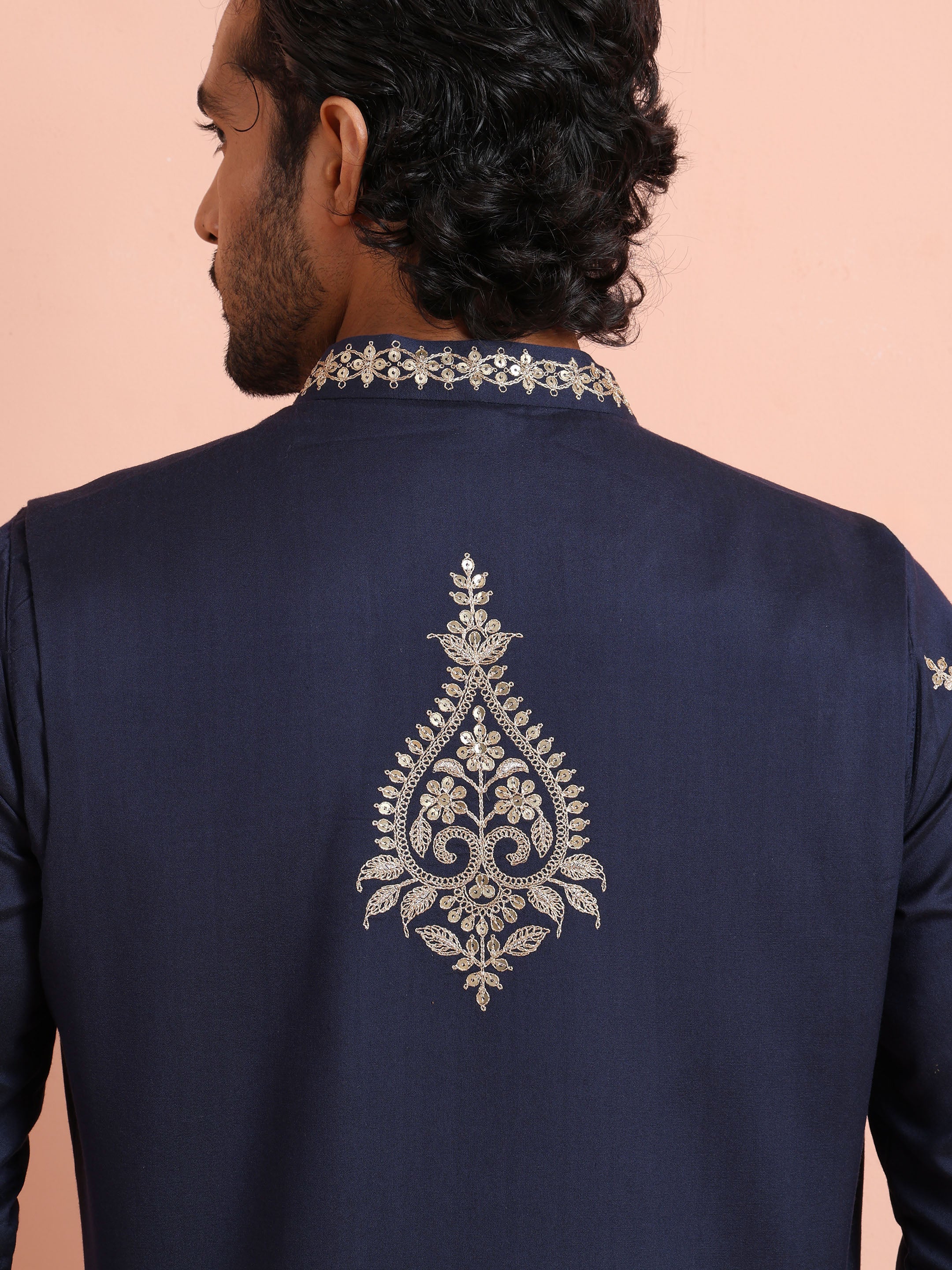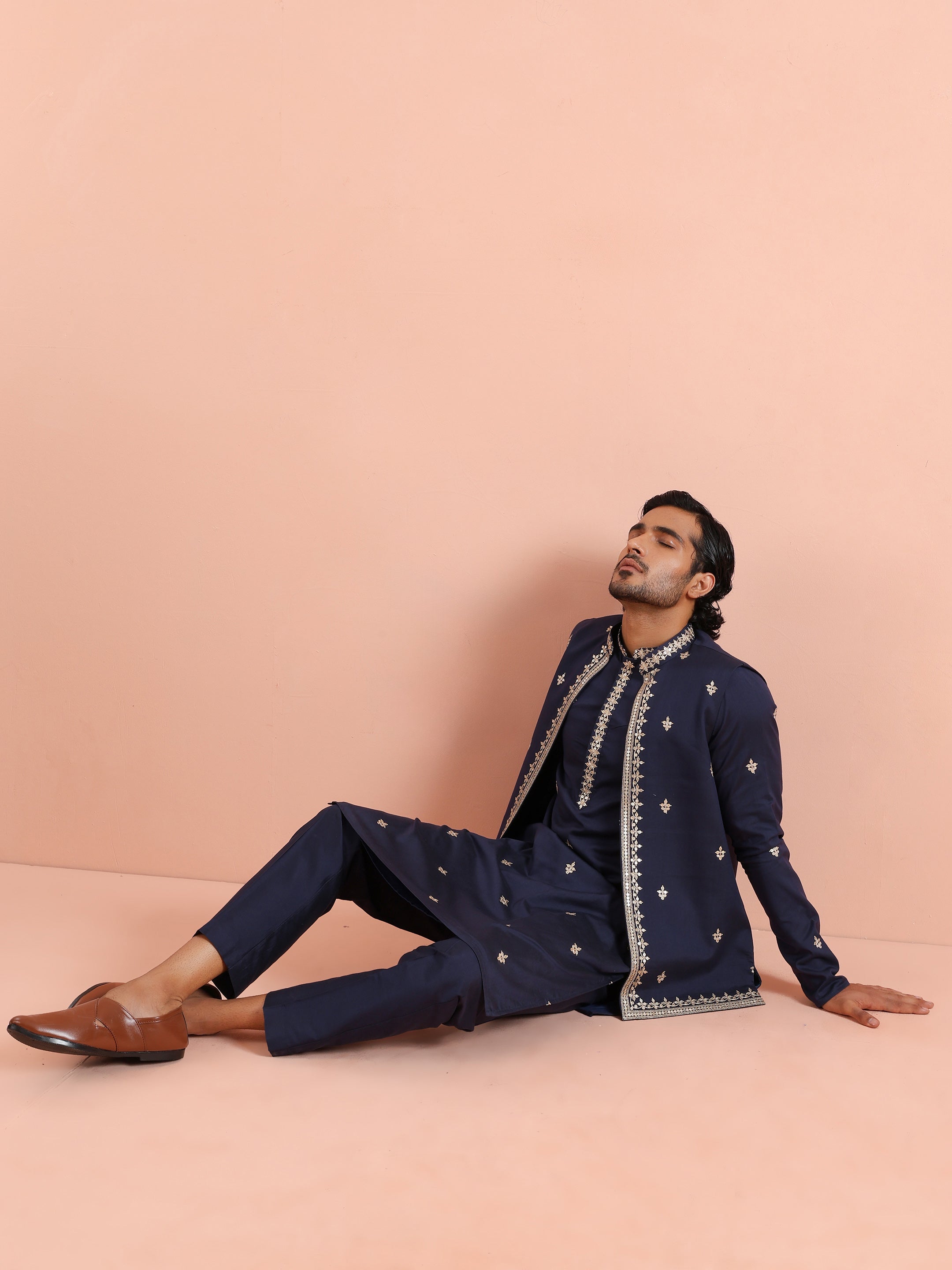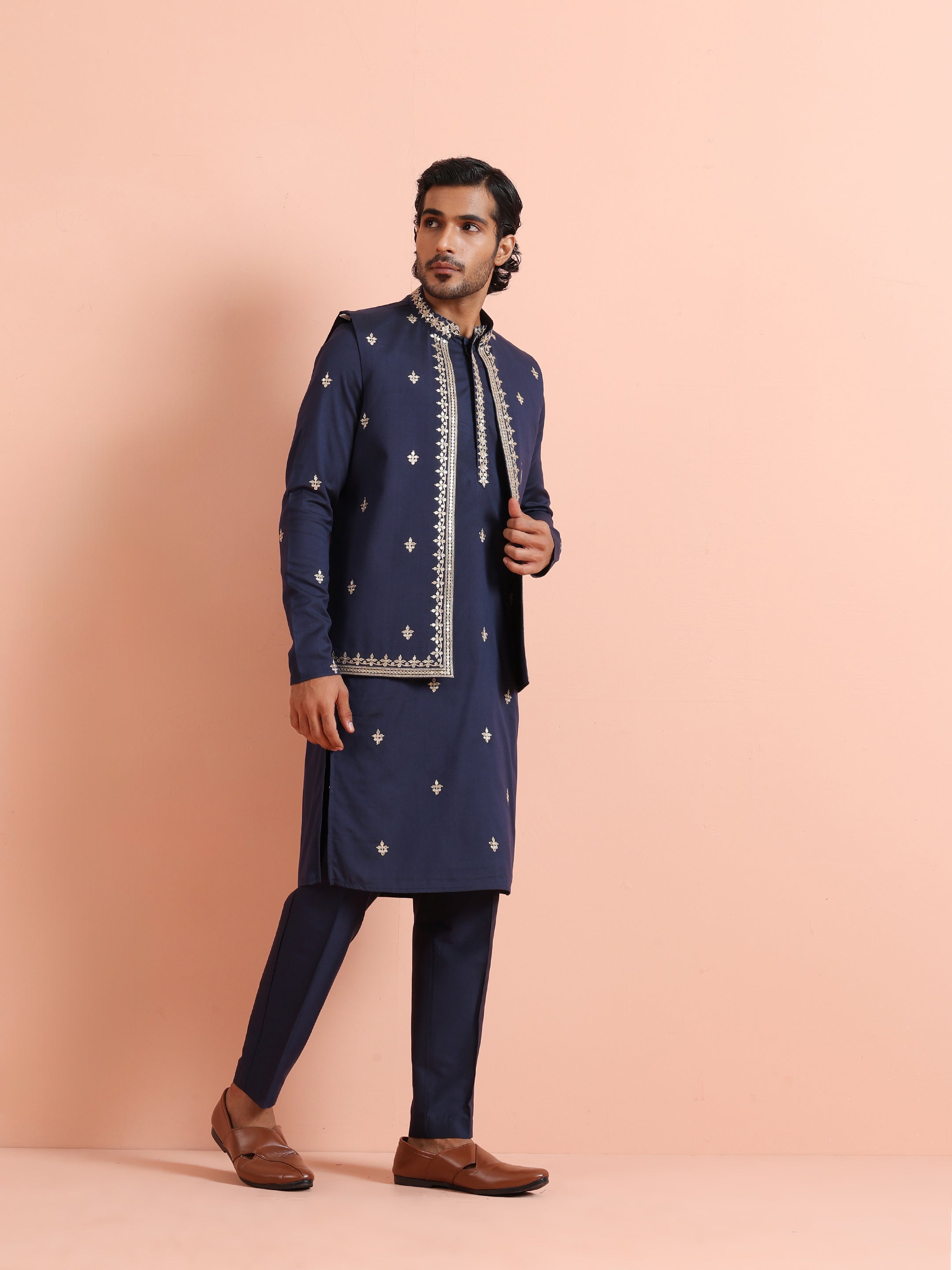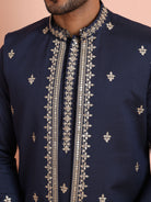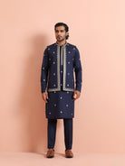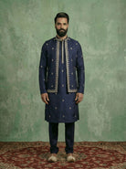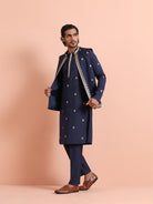 Navy Blue Silk Blend Kurta Front Open Jacket Trouser Set with Embroidered Detailing. Perfect for weddings and festive occasions. Ideal for Eid festival.