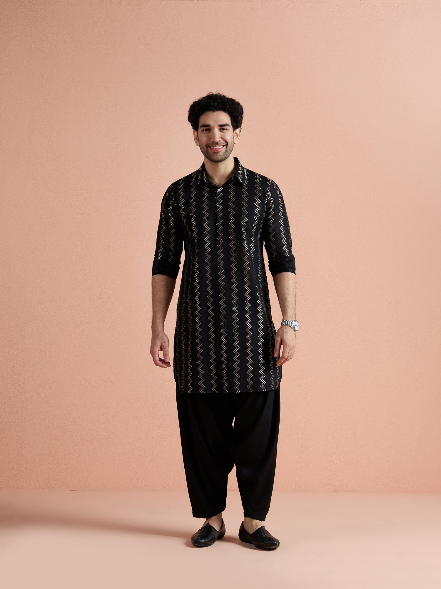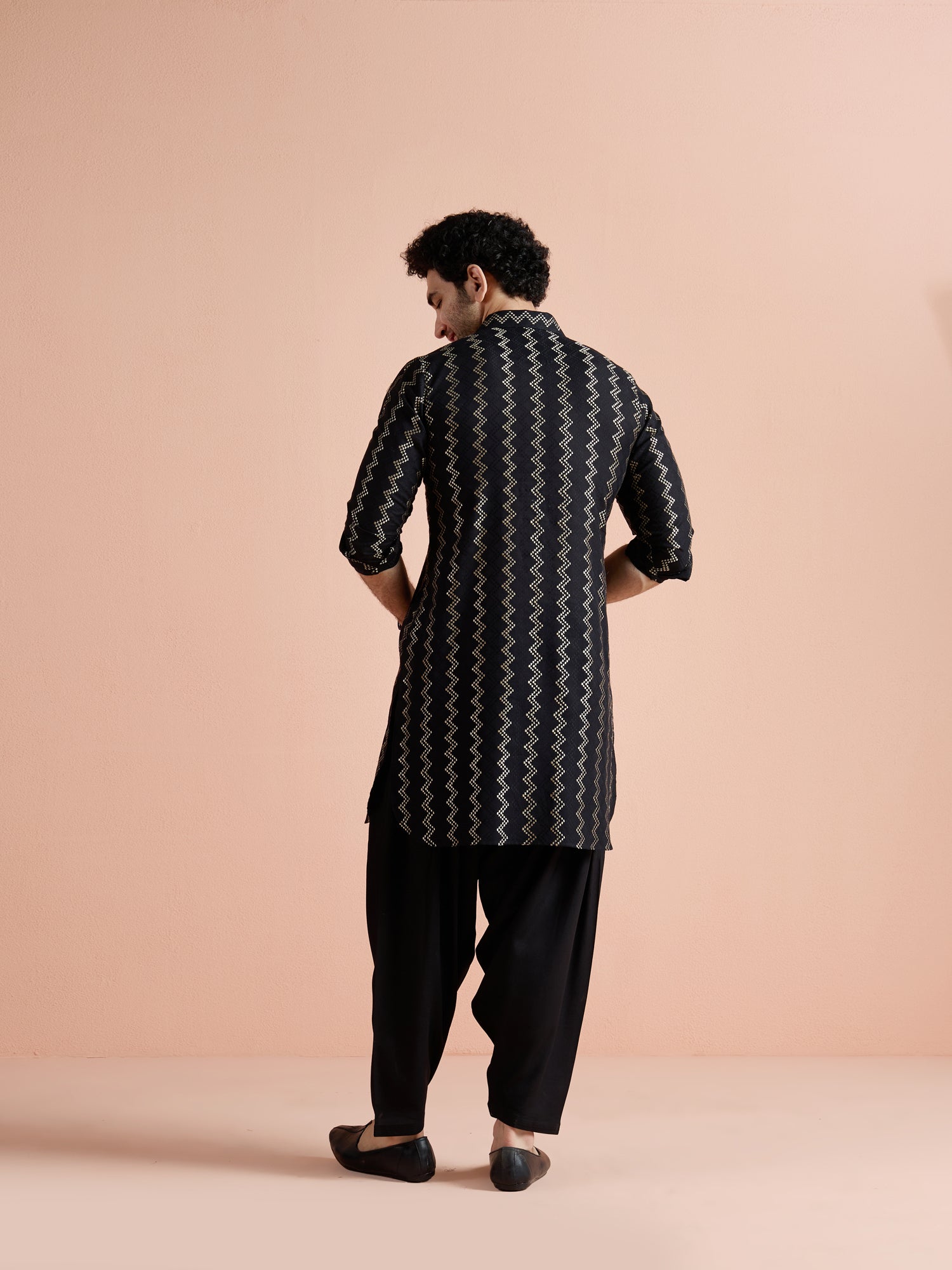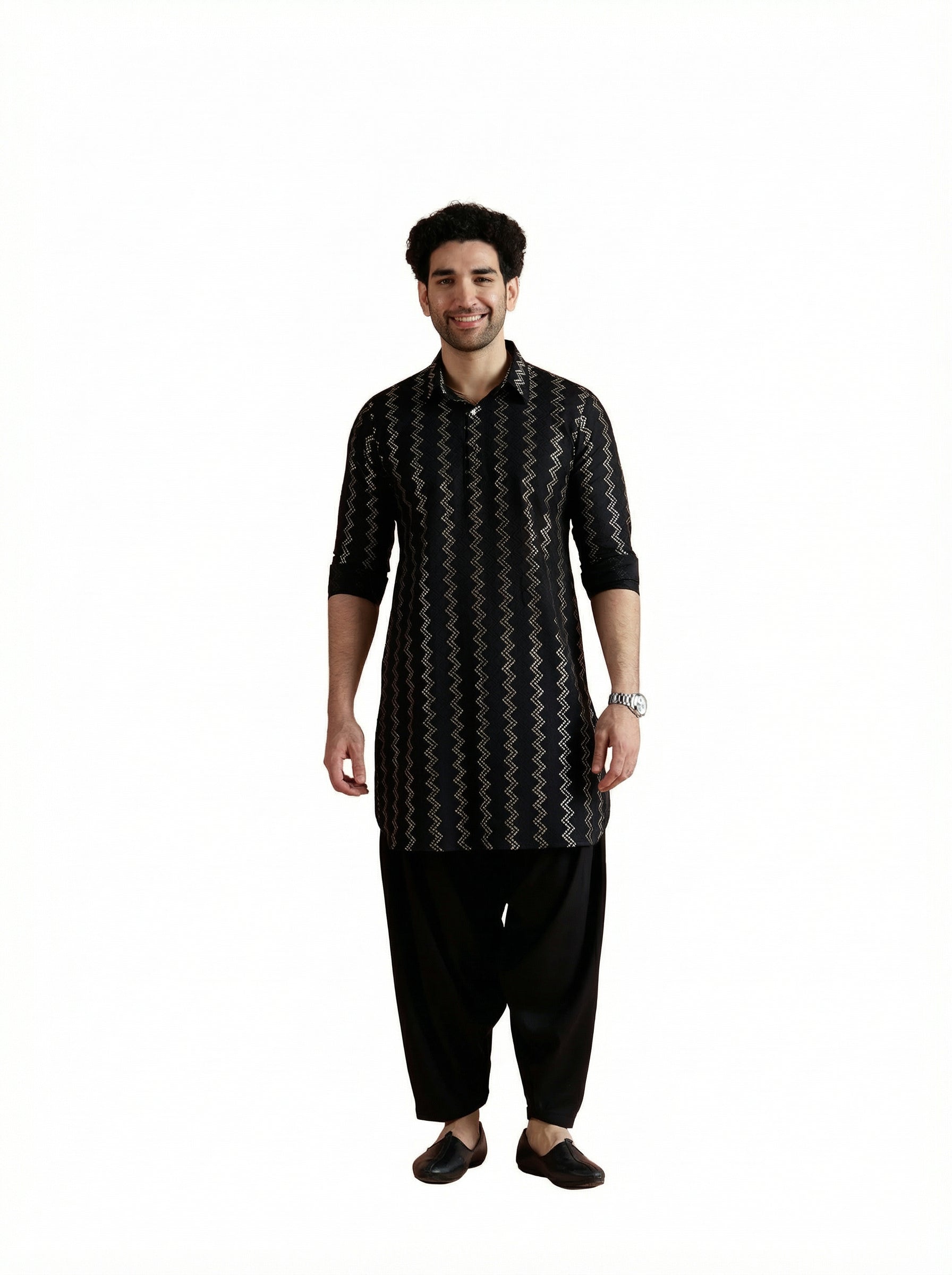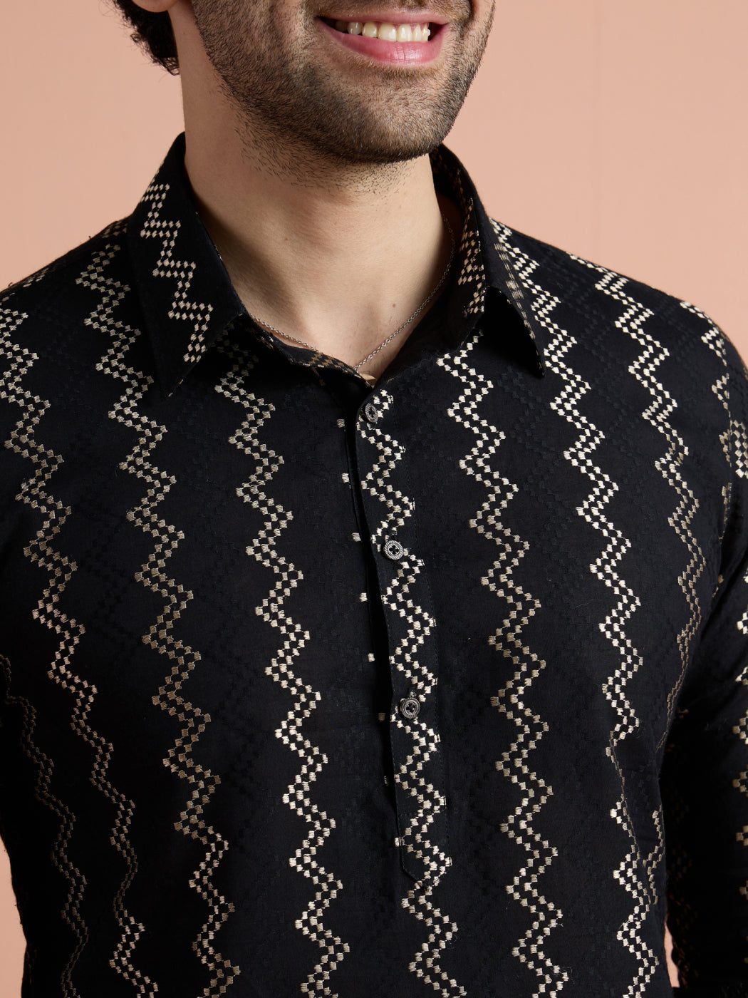 Black Cotton Jacquard Pathani Kurta Patiyala Set with a stylish zigzag pattern. Perfect for festive and traditional occasions.