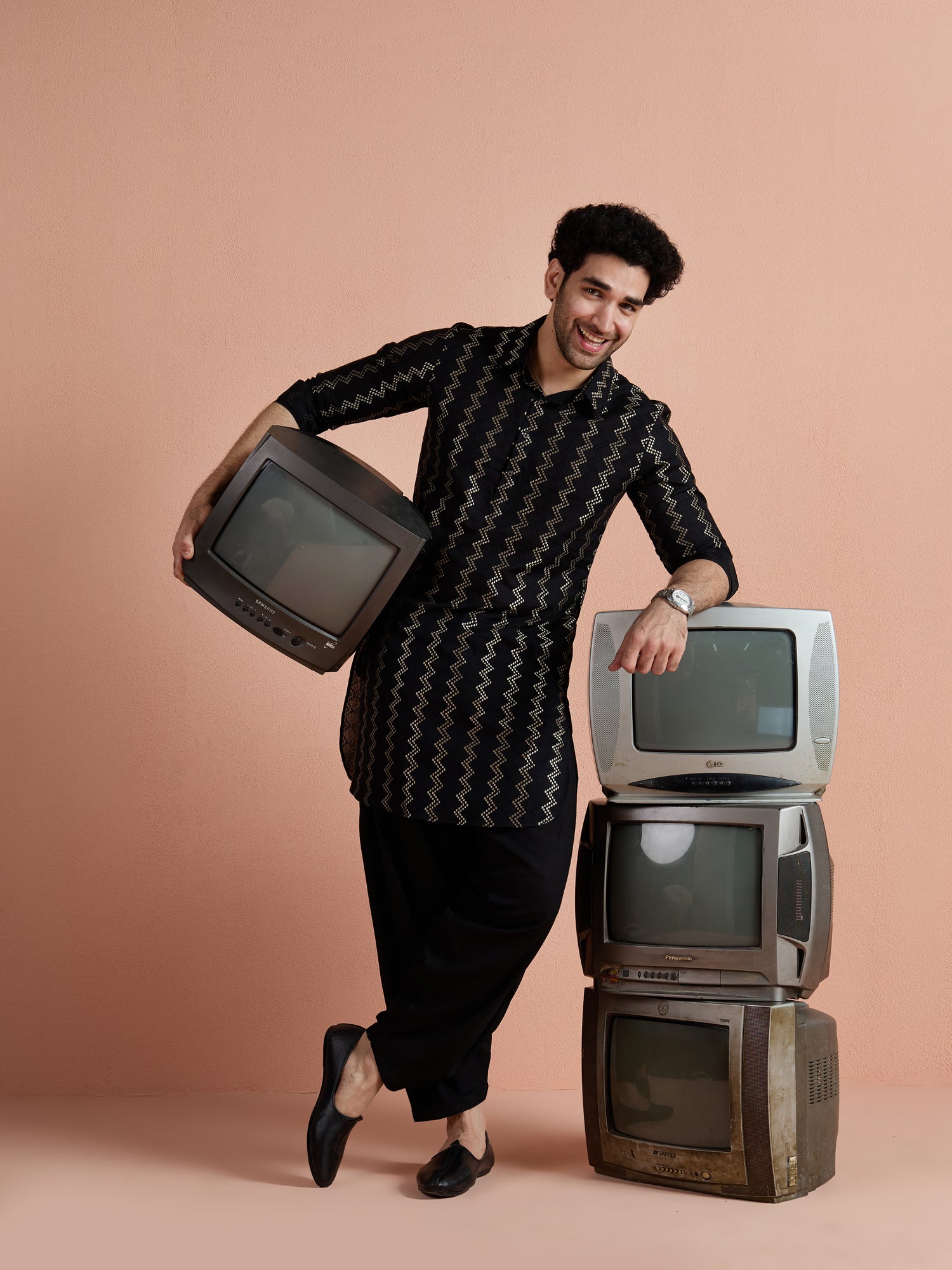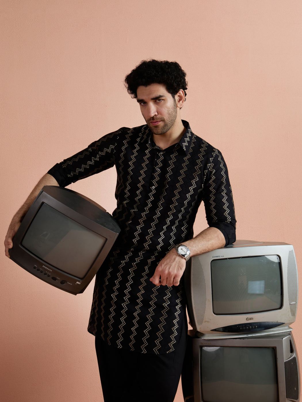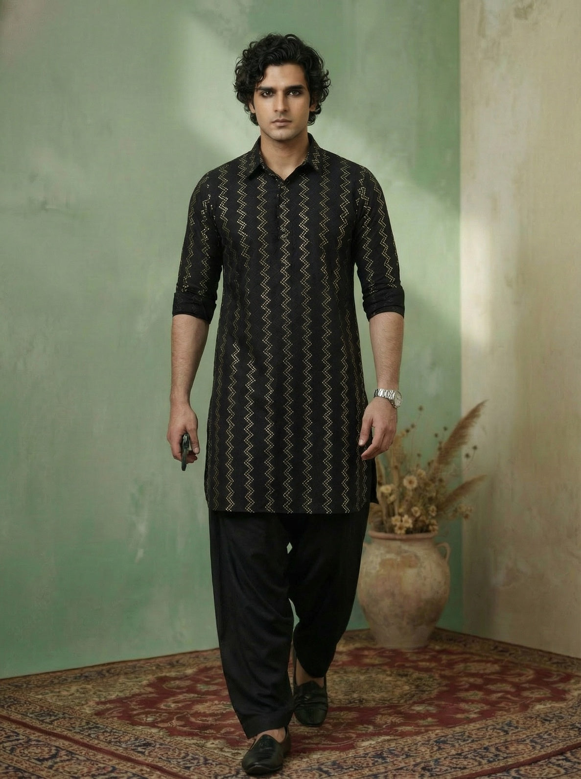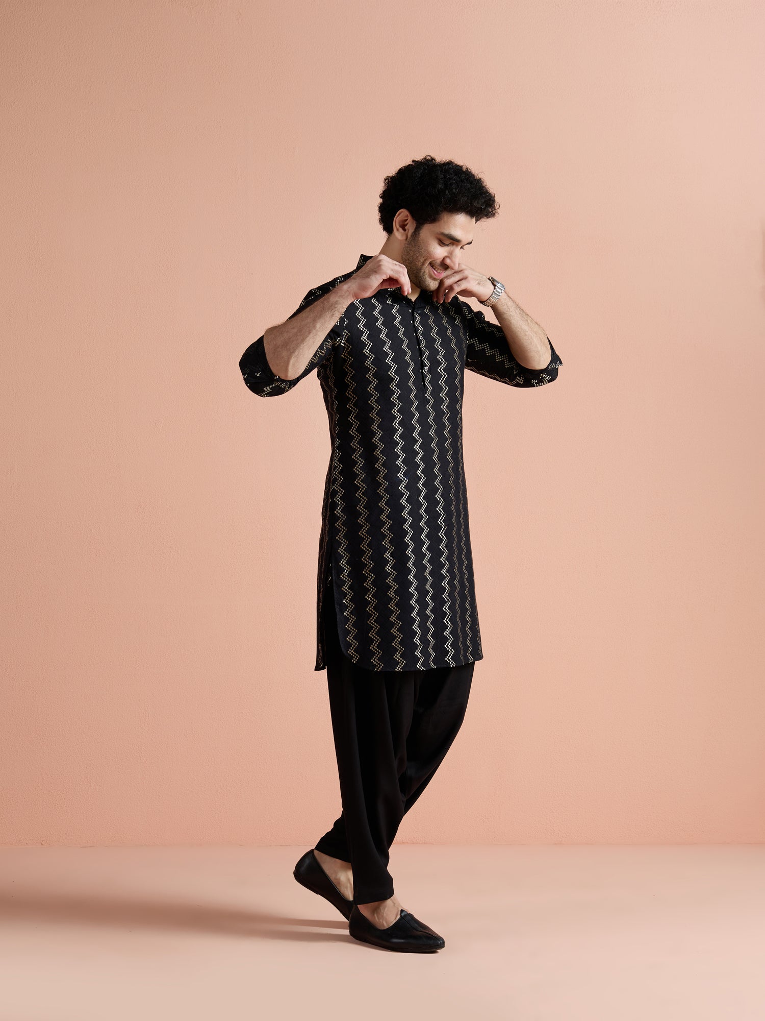 Black Cotton Jacquard Pathani Kurta Patiyala Set with a stylish zigzag pattern. Perfect for festive and traditional occasions.
