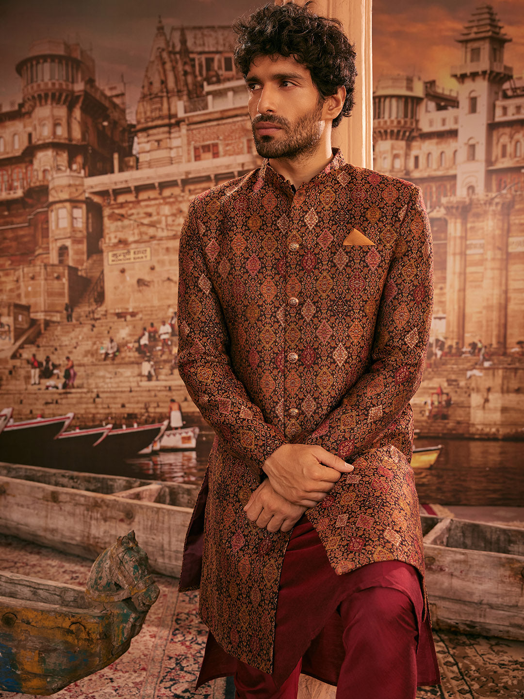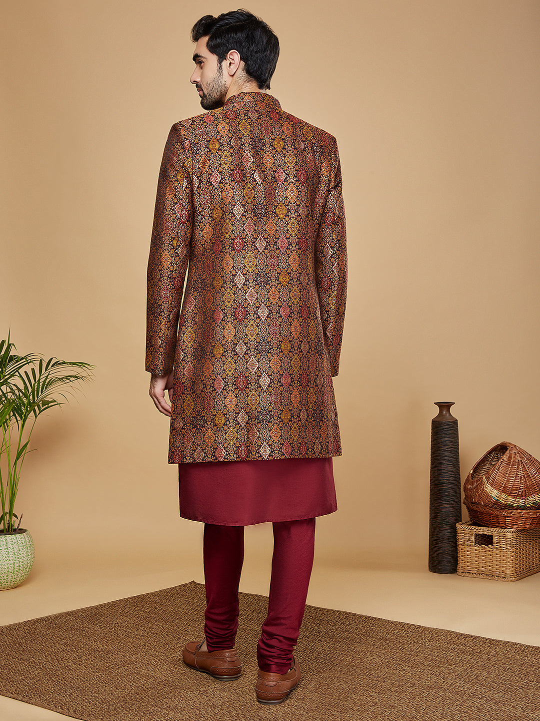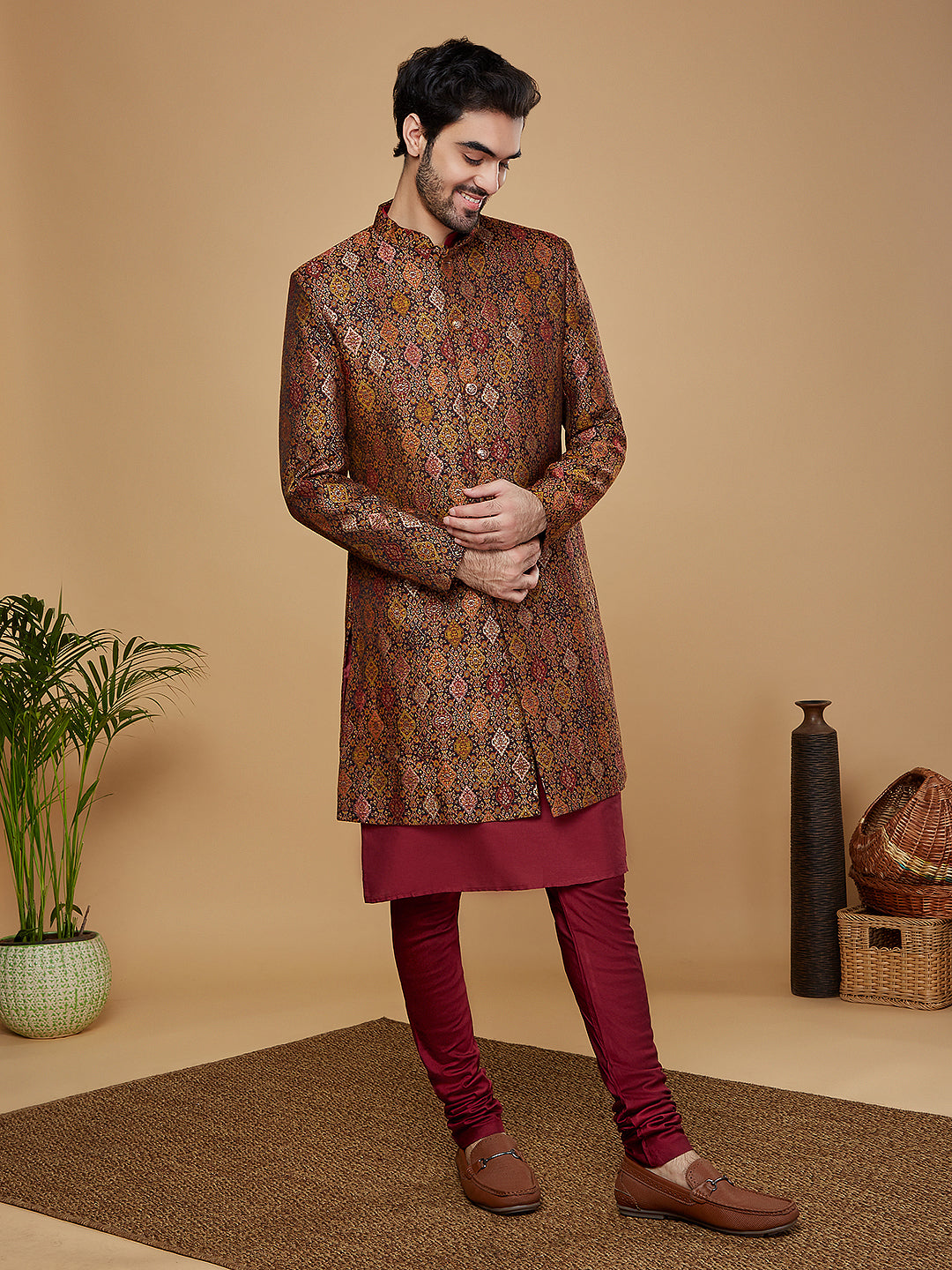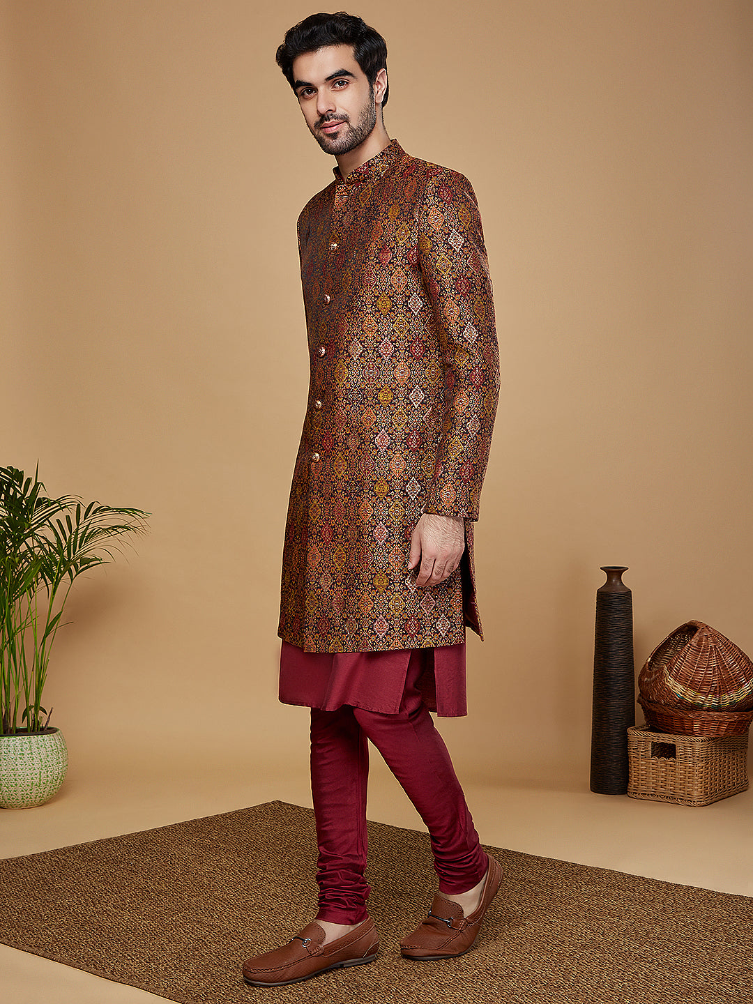 Flaunt your look in this Sherwani set crafted by the designers at Kisah. This Sherwani set is an exquisite set designed in Silk Blend Fabric in . The design all over the Sherwani sets a parting glamorous style.This is a look that satiates traditional fashion needs at its best..