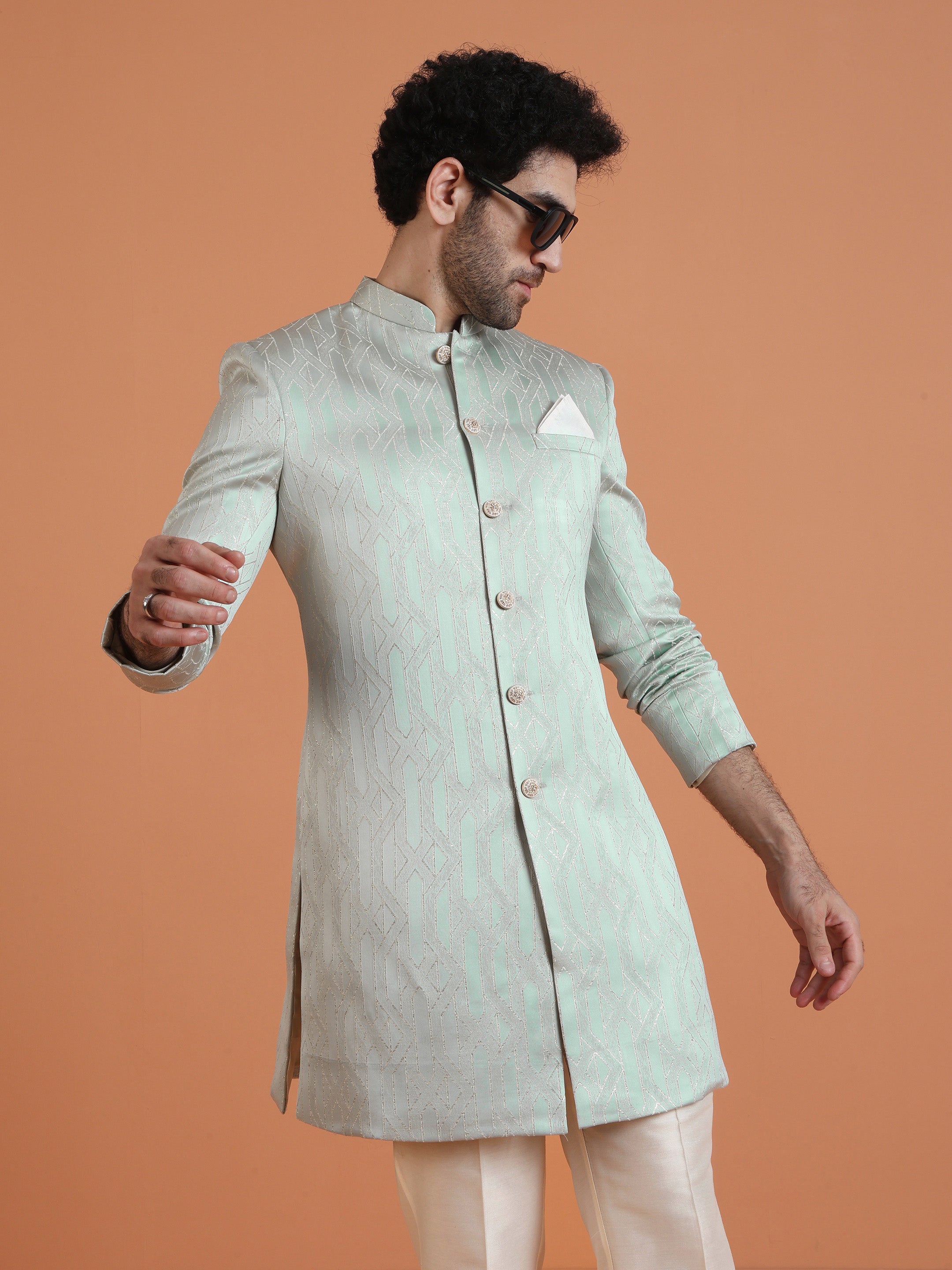 Mint Green Silk Blend Geometric Sherwani Jodhpuri Trouser Set