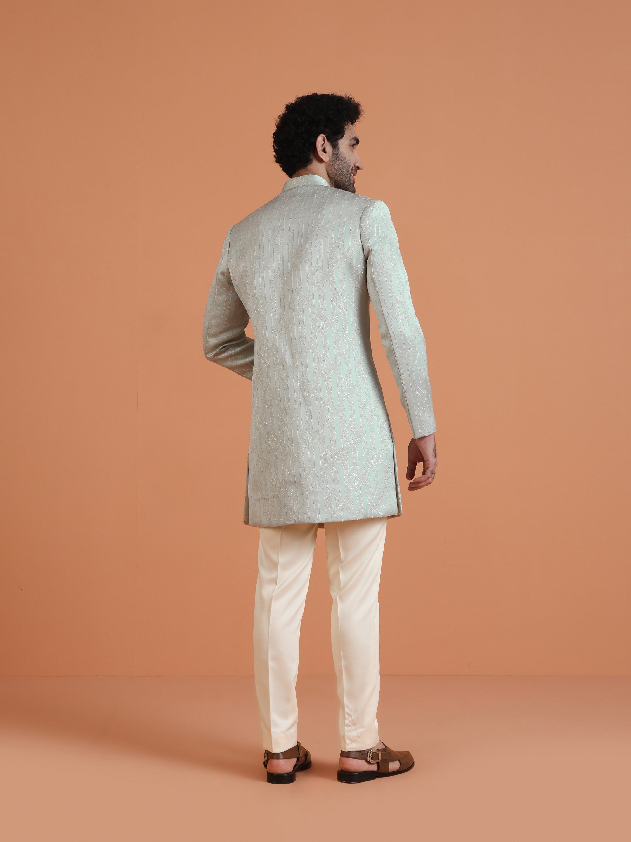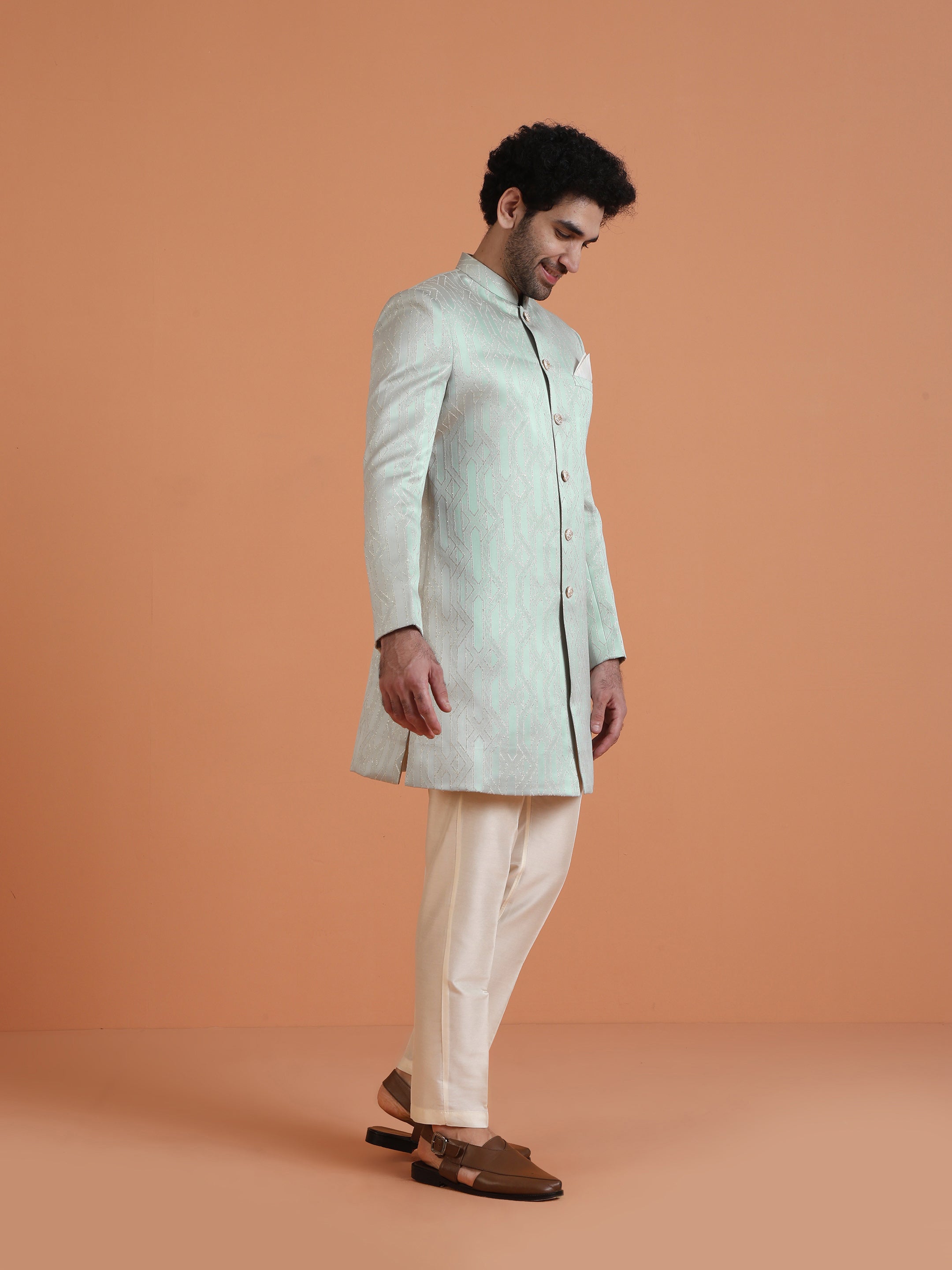 Mint green silk blend sherwani with geometric embroidery and cream trouser. A refined Achkan/Jodhpuri set for weddings and festive occasions.