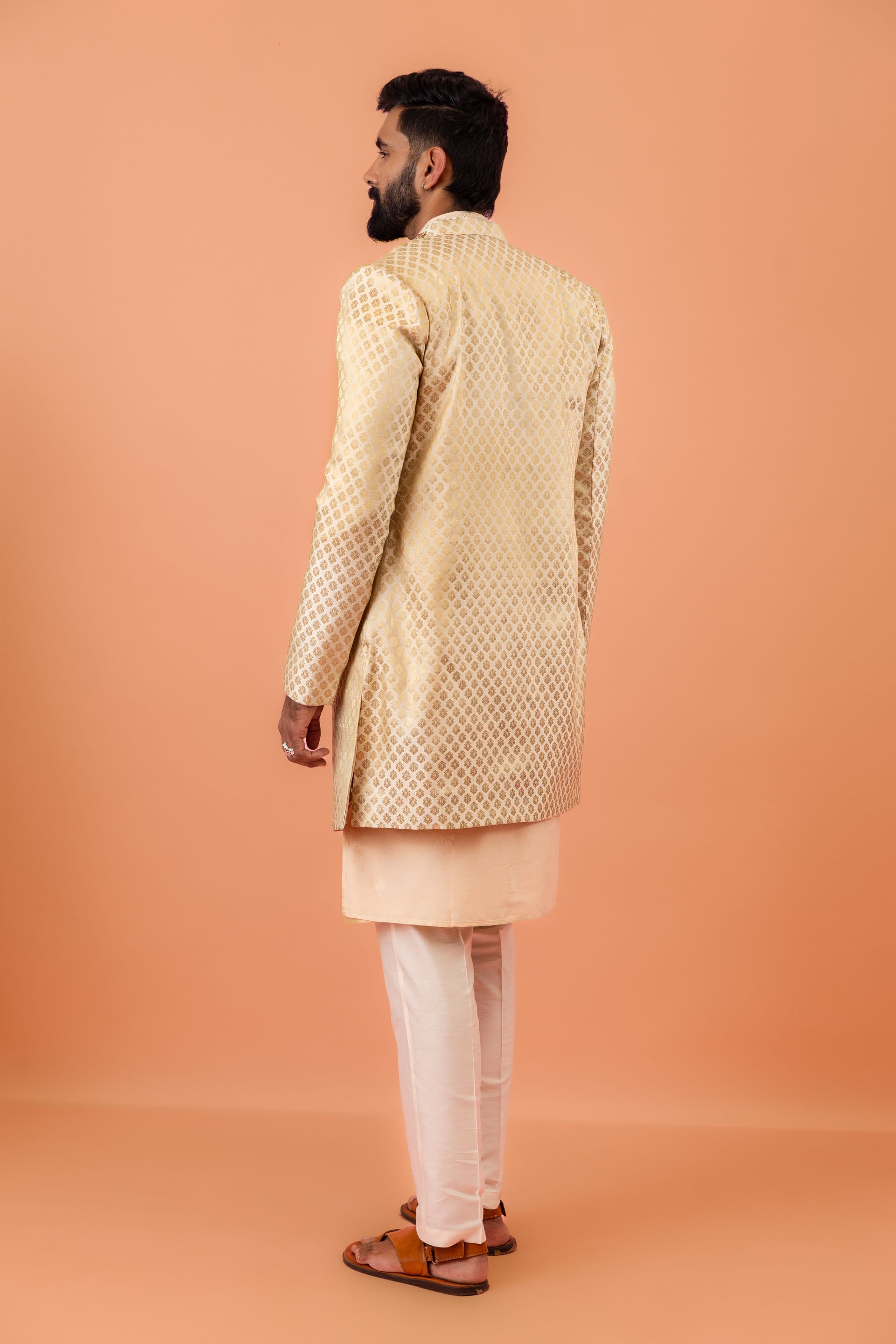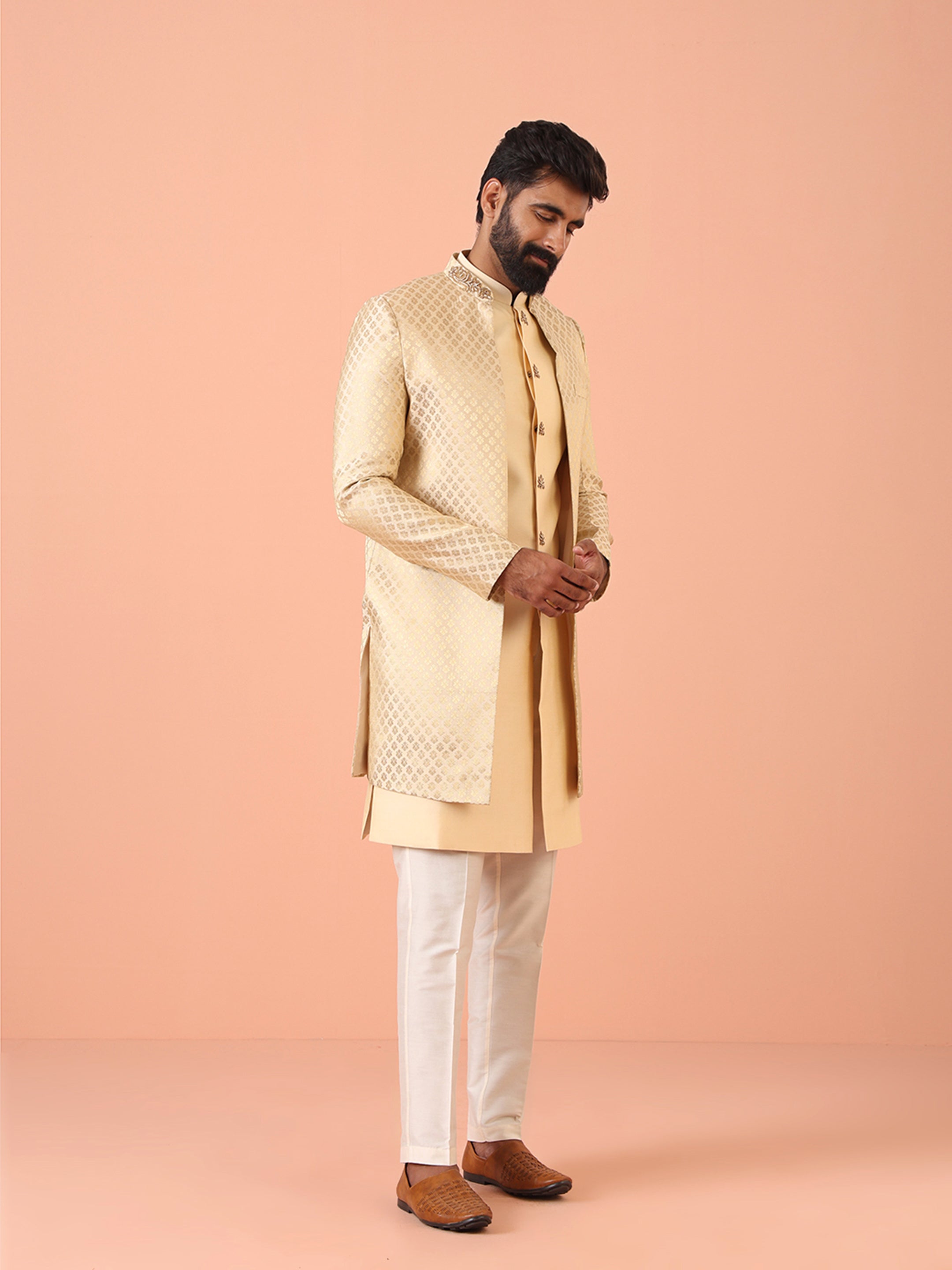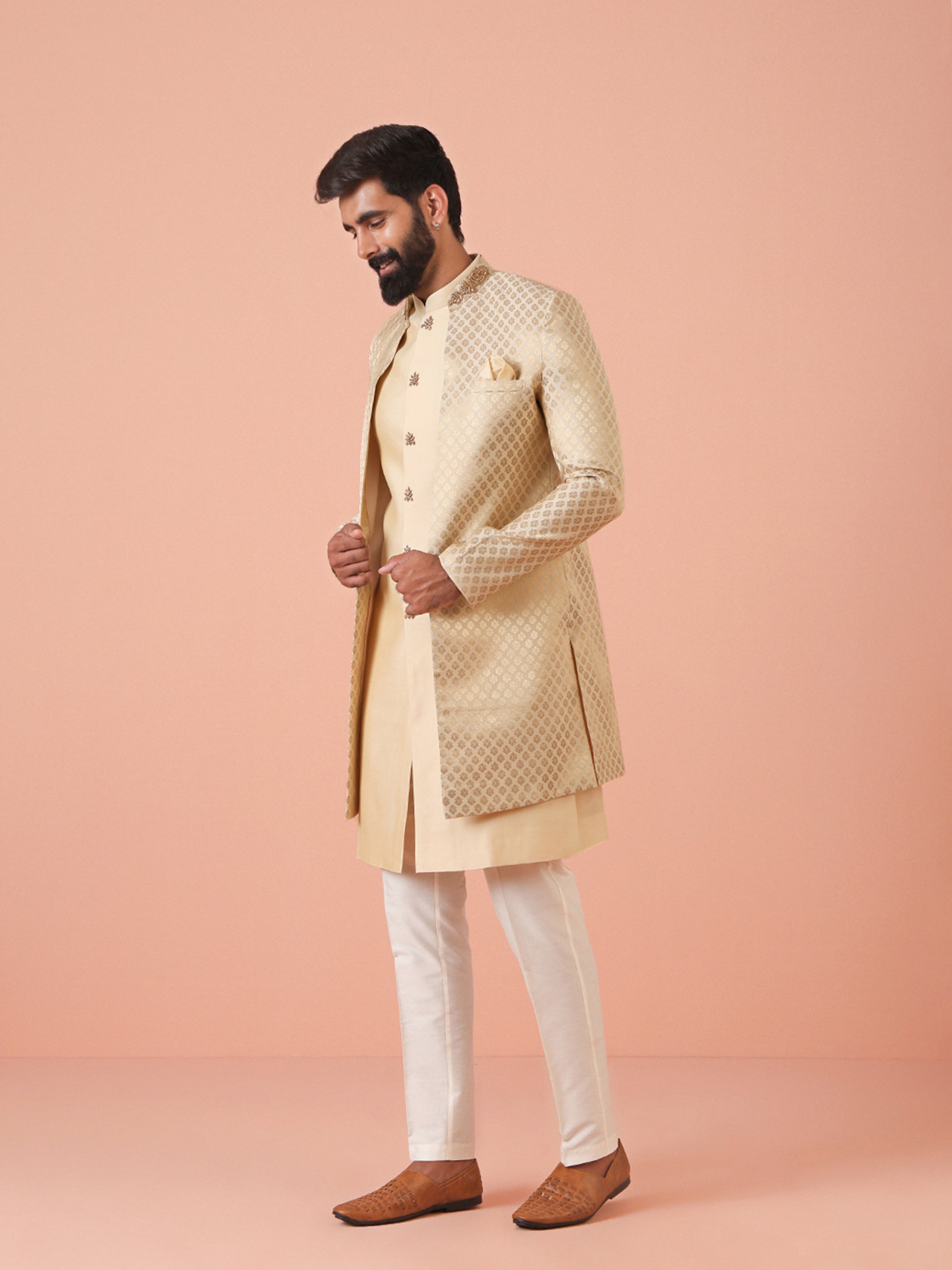 Experience classic elegance with this Men Cream Jacquard Jacket Indowestern Trouser Set with Ethnic Motifs. The breathable Silk Blend fabric ensures comfort throughout the day. Ideal for festive events or casual wear.