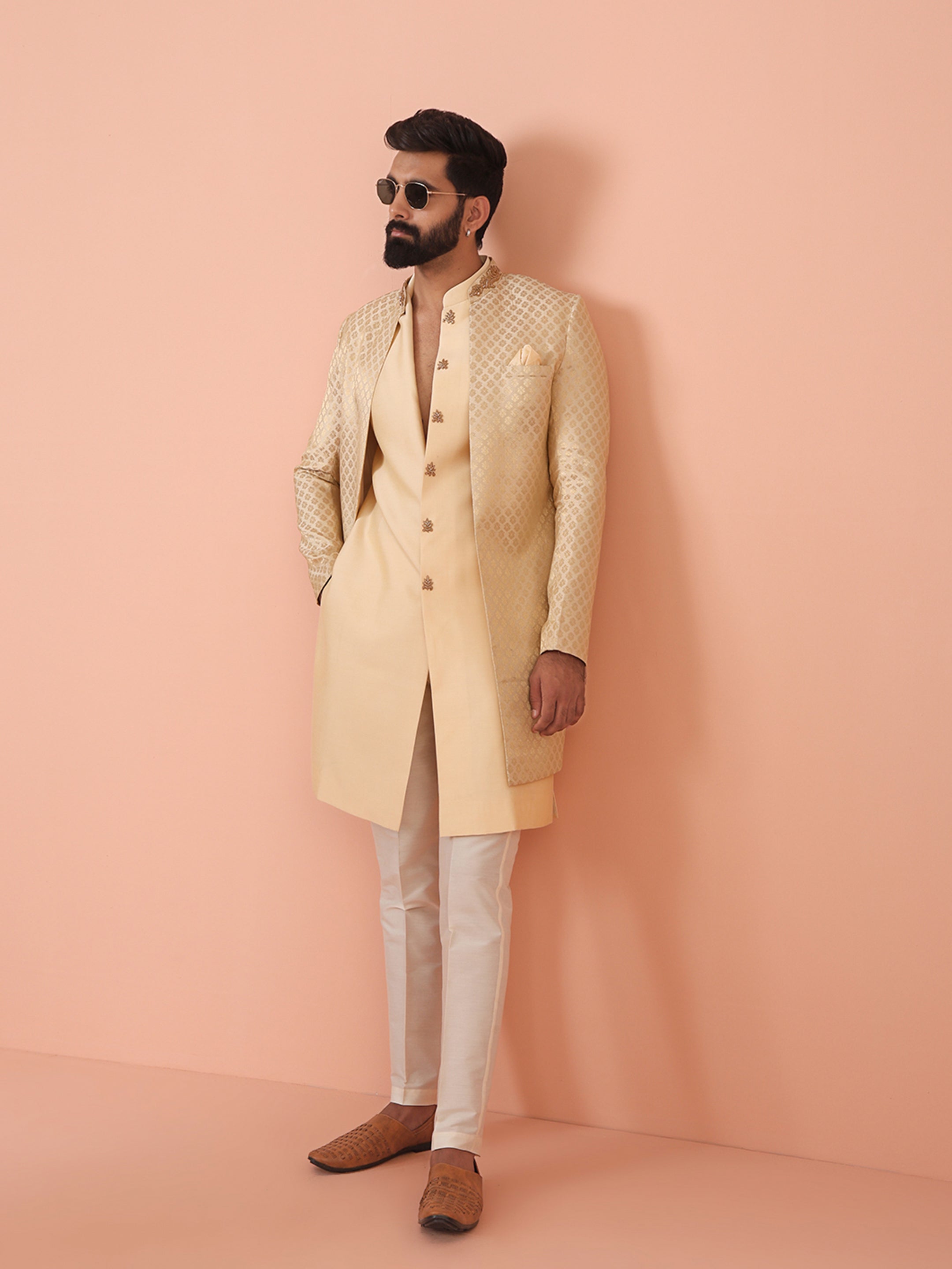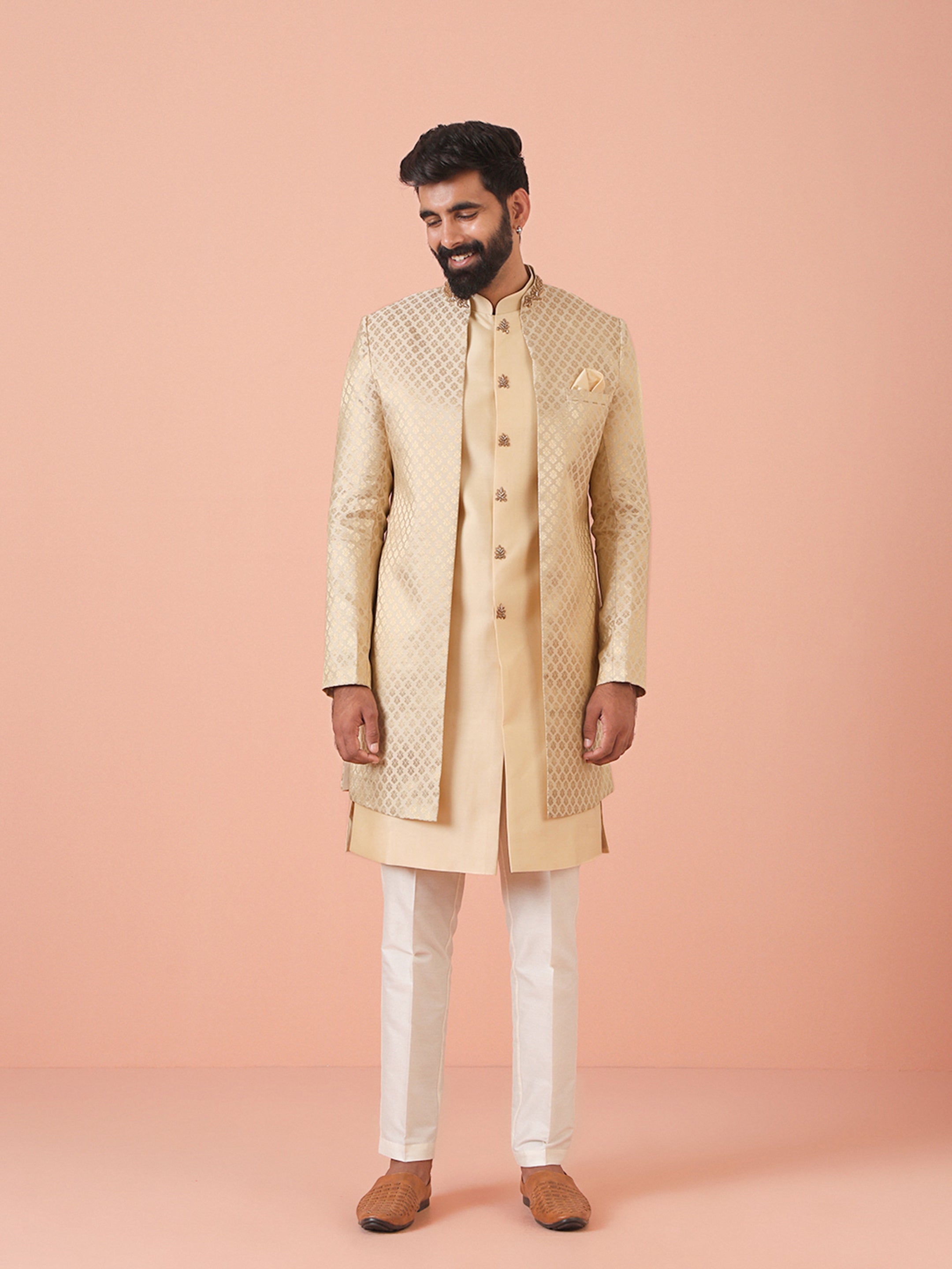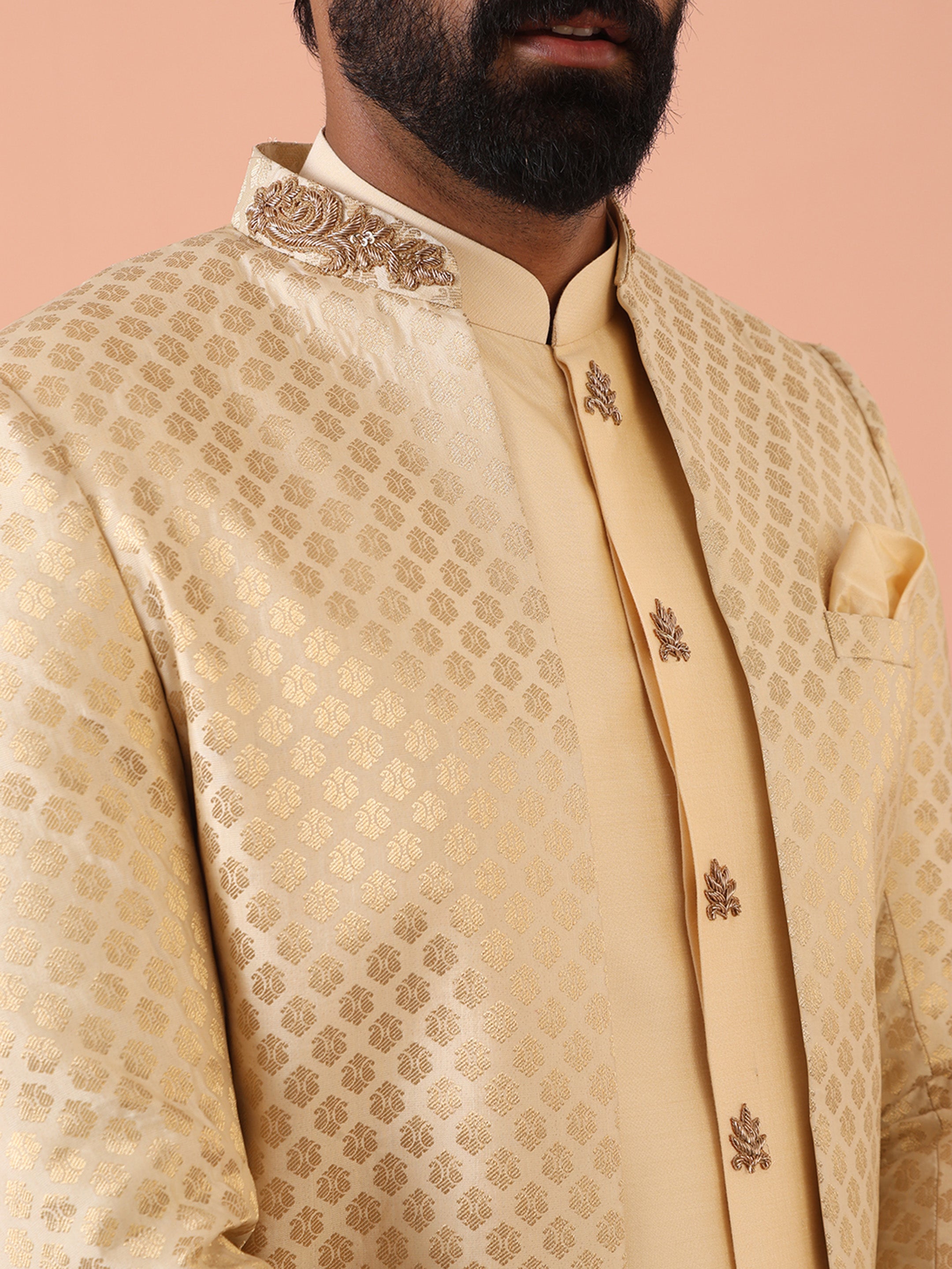 Experience classic elegance with this Men Cream Jacquard Jacket Indowestern Trouser Set with Ethnic Motifs. The breathable Silk Blend fabric ensures comfort throughout the day. Ideal for festive events or casual wear.