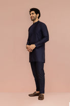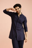 Men Navy Blue Yoke Design Pleating Mid Kurta Trouser Set