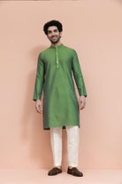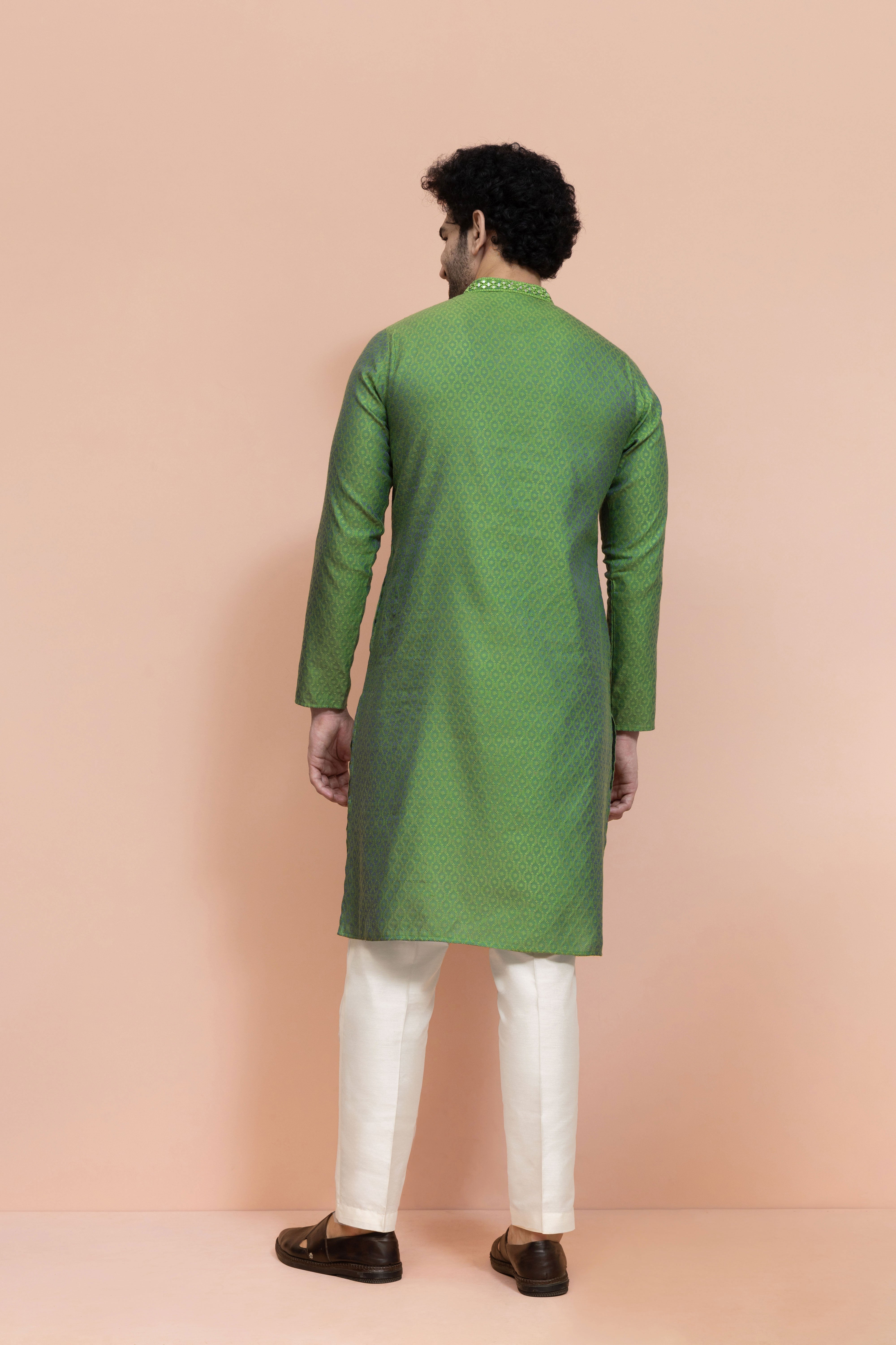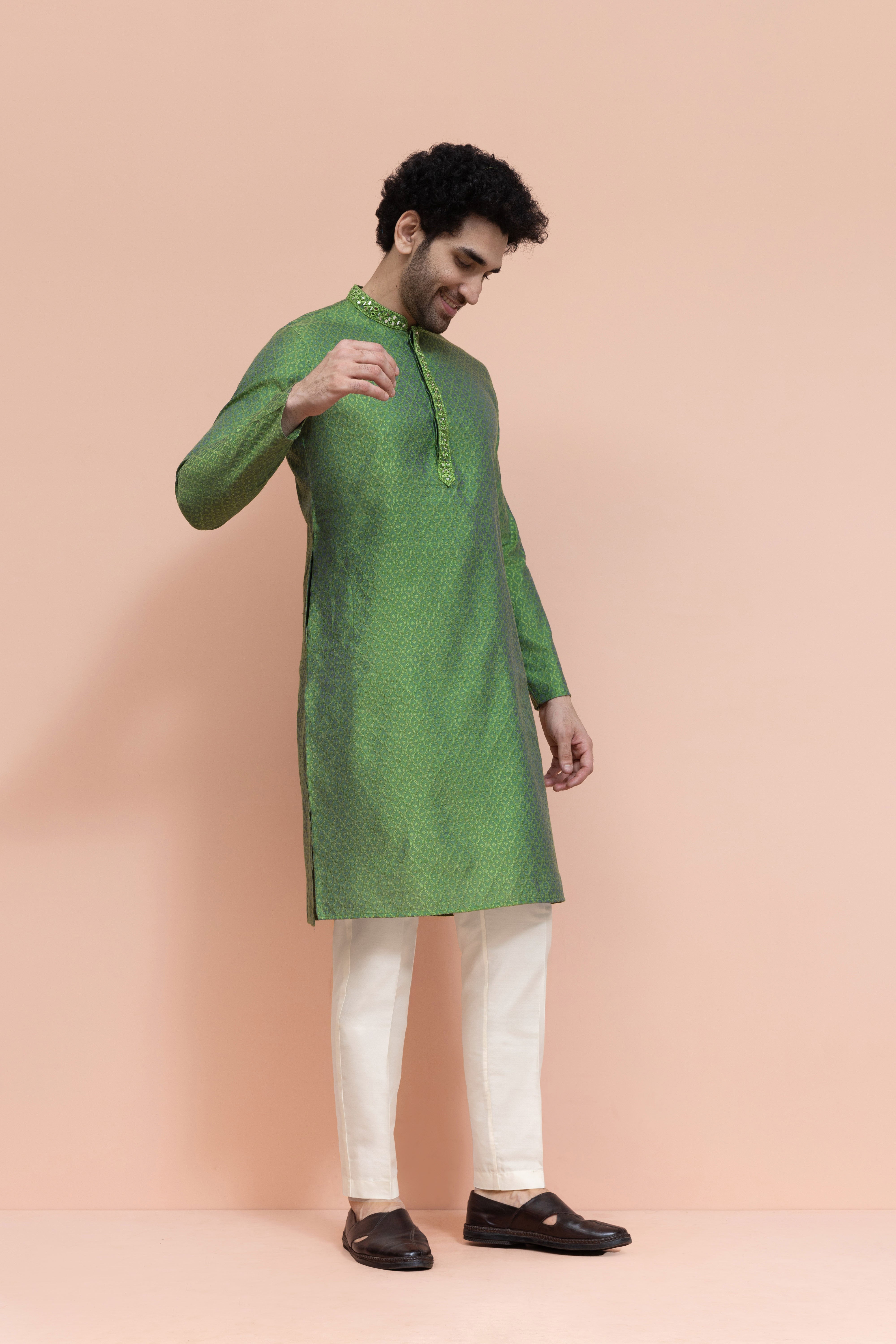 Make an unforgettable moment with this Green Mirror work Kurta, designed to bring elegance and charm to every celebration. The rich Silk Blend fabric adds Ethnic Motifs and depth, while the expertly tailored fit ensures a sharp, comfortable look. Whether it’s a wedding, festive gathering, or cultural event, this ensemble blends tradition with a modern edge, refined yet effortlessly stylish.