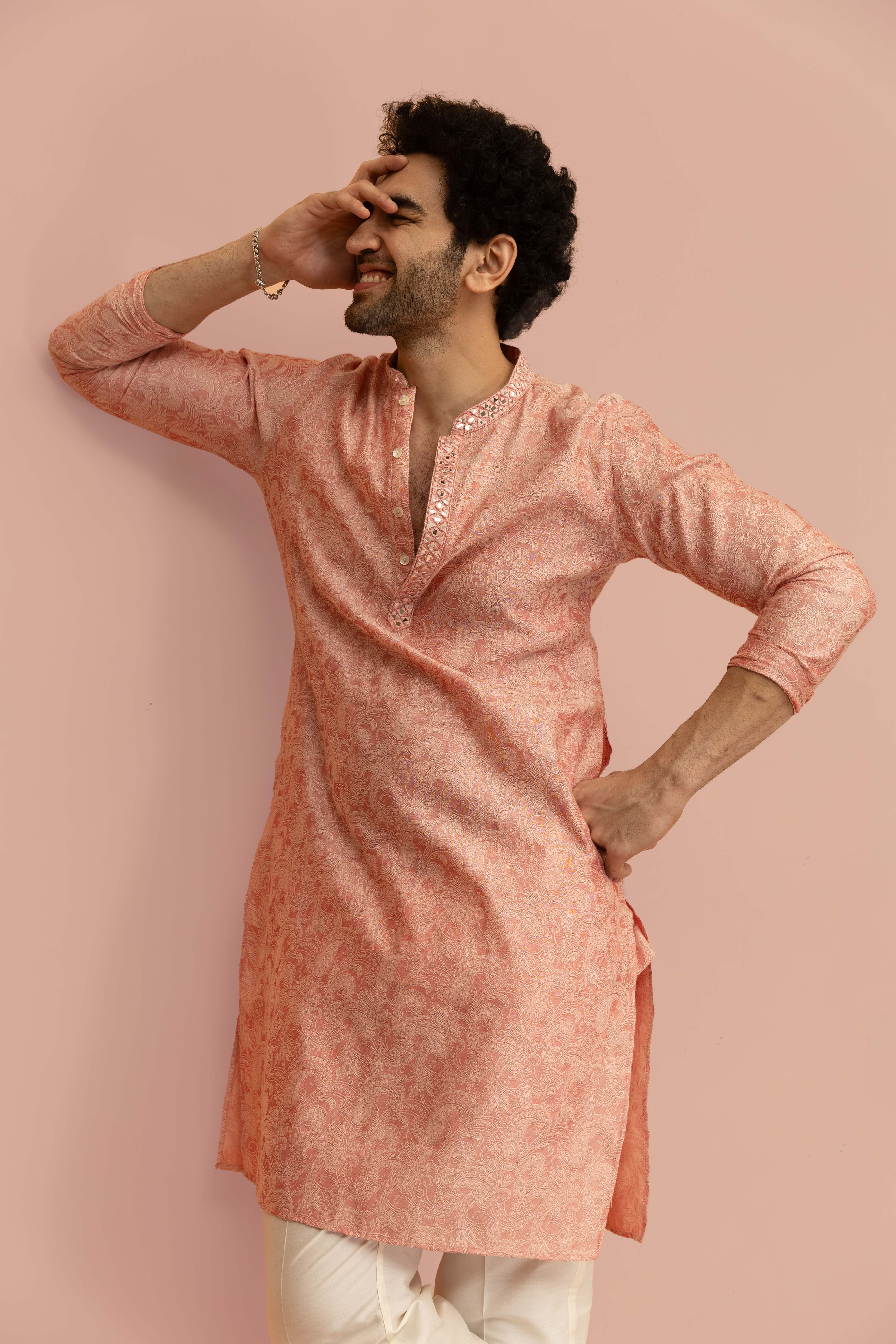Make an unforgettable moment with this Pink Mirror work Kurta, designed to bring elegance and charm to every celebration. The rich Silk Blend fabric adds Floral and depth, while the expertly tailored fit ensures a sharp, comfortable look. Whether it’s a wedding, festive gathering, or cultural event, this ensemble blends tradition with a modern edge, refined yet effortlessly stylish.