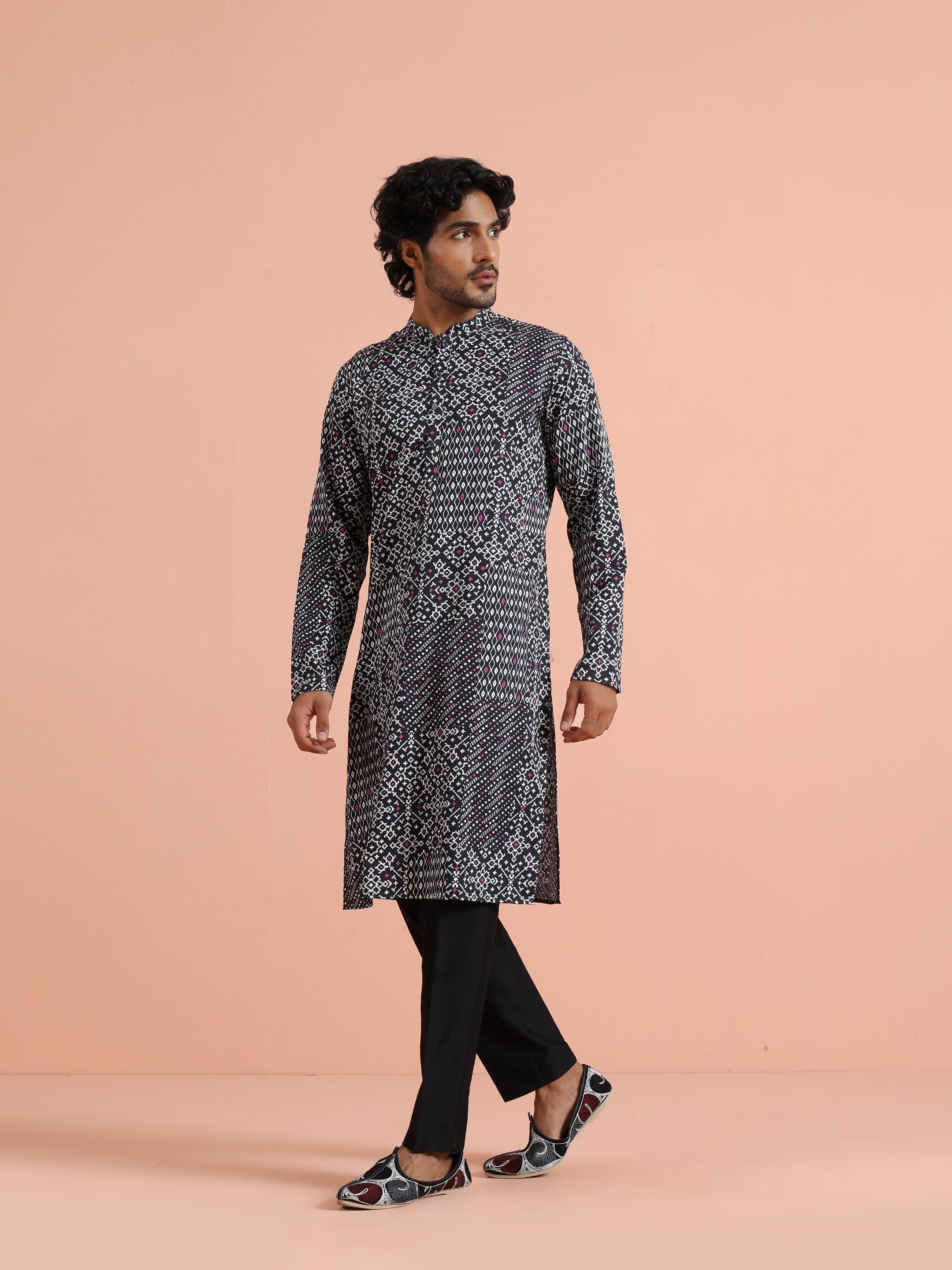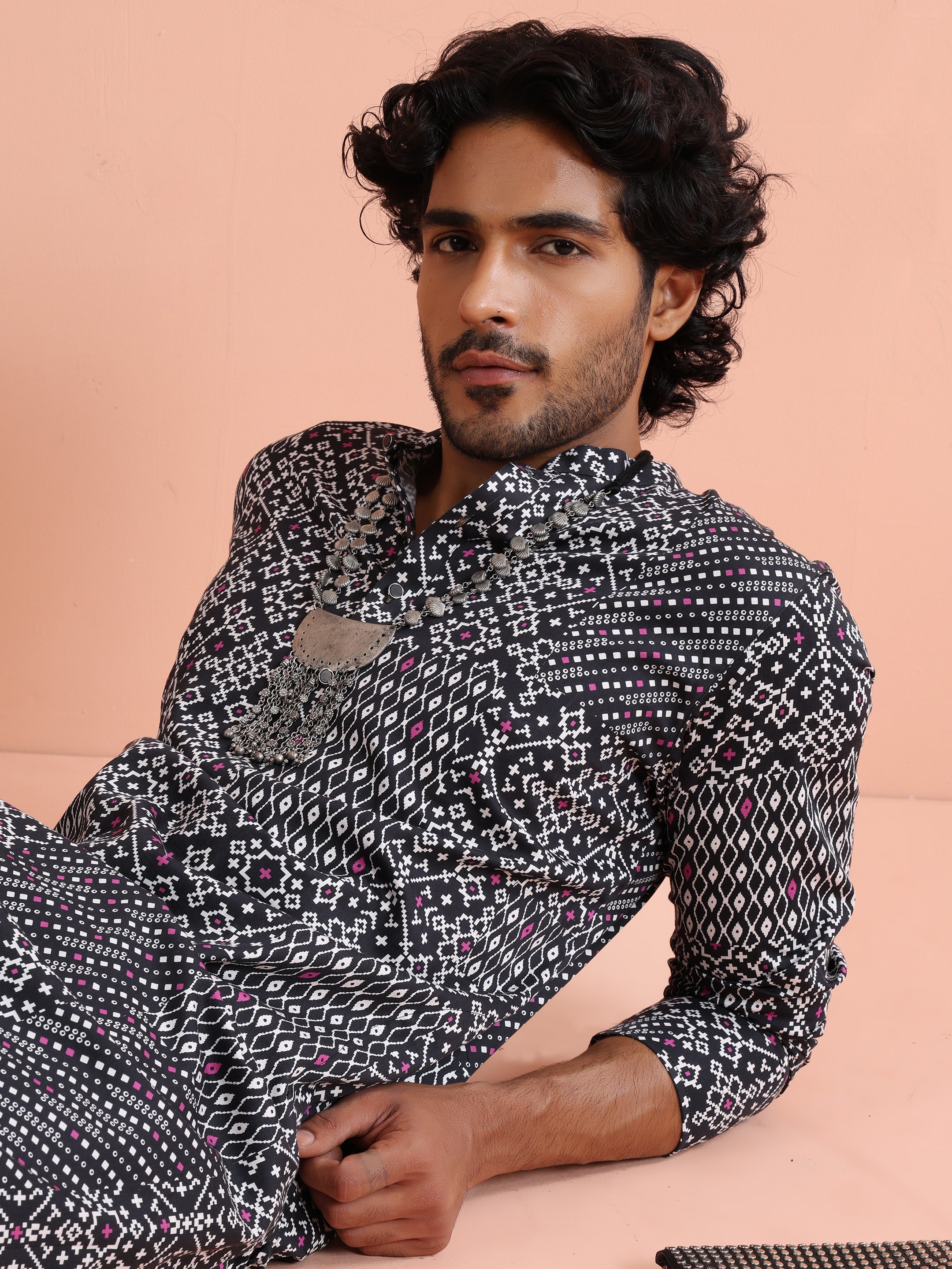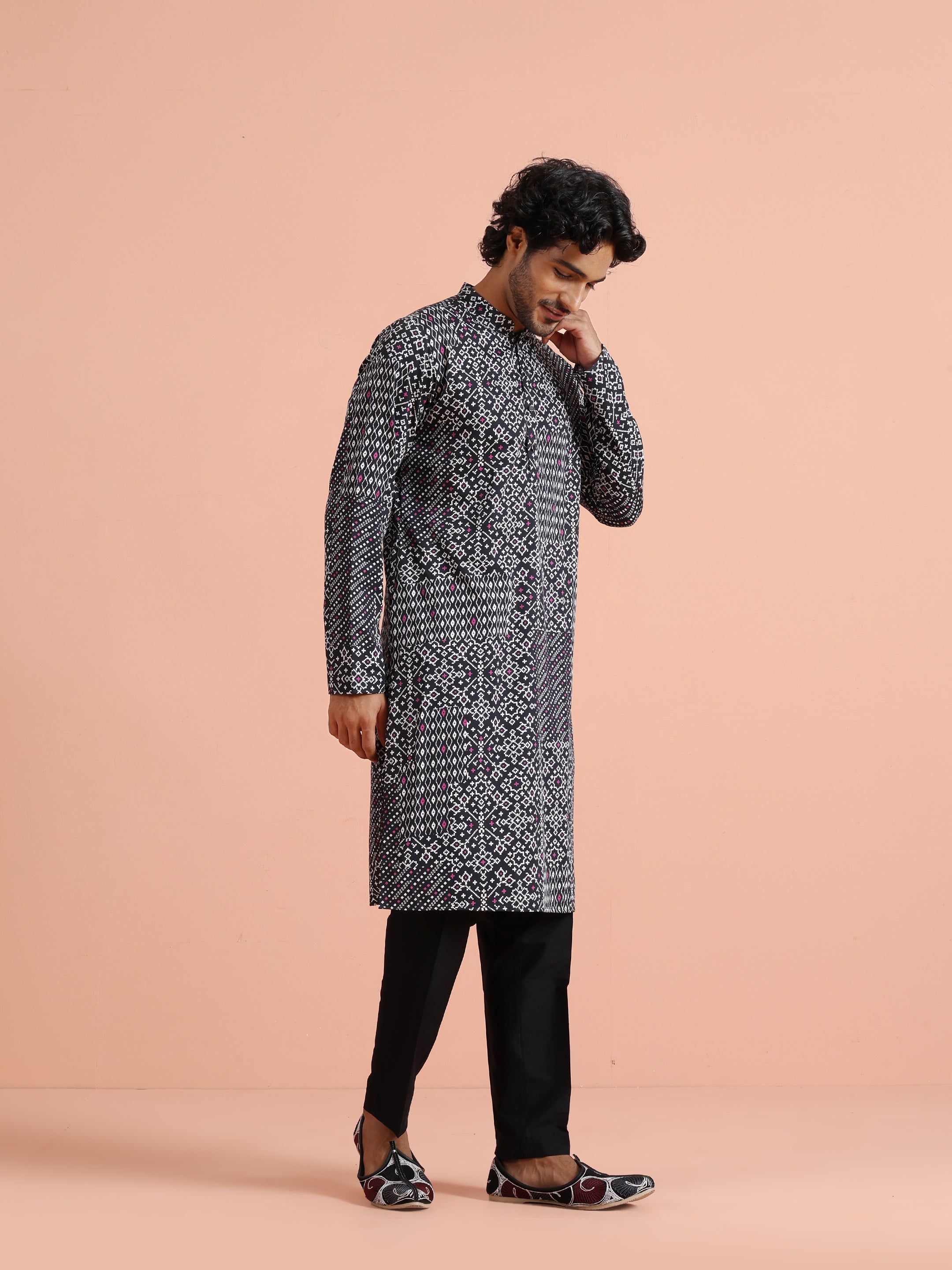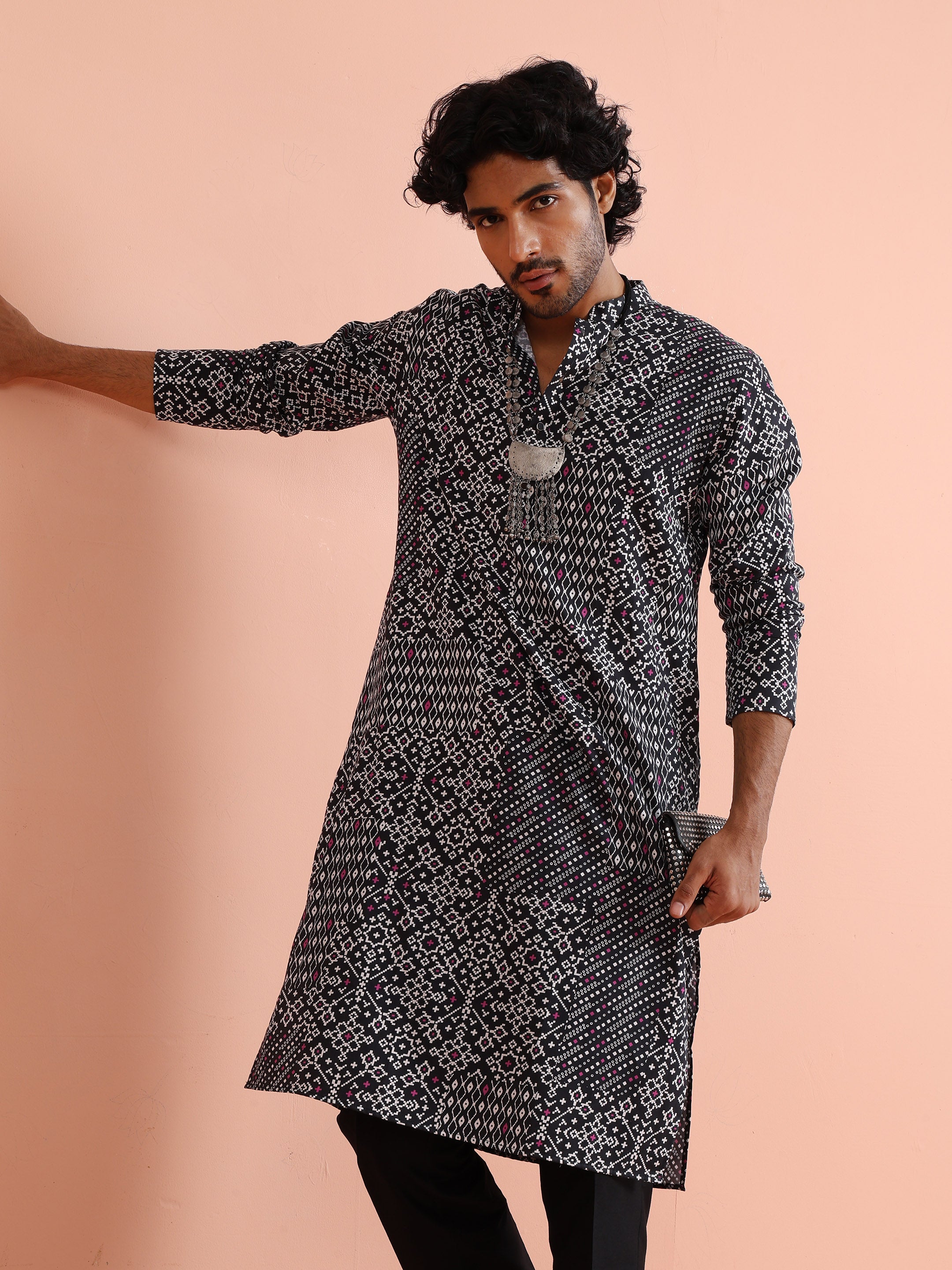 Kisah Menss Black Printed Kurta bold ethnic geometric design with modern fit. Perfect for festive occasions, parties, or casual gatherings with trousers or churidar.