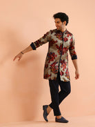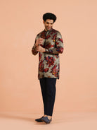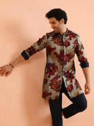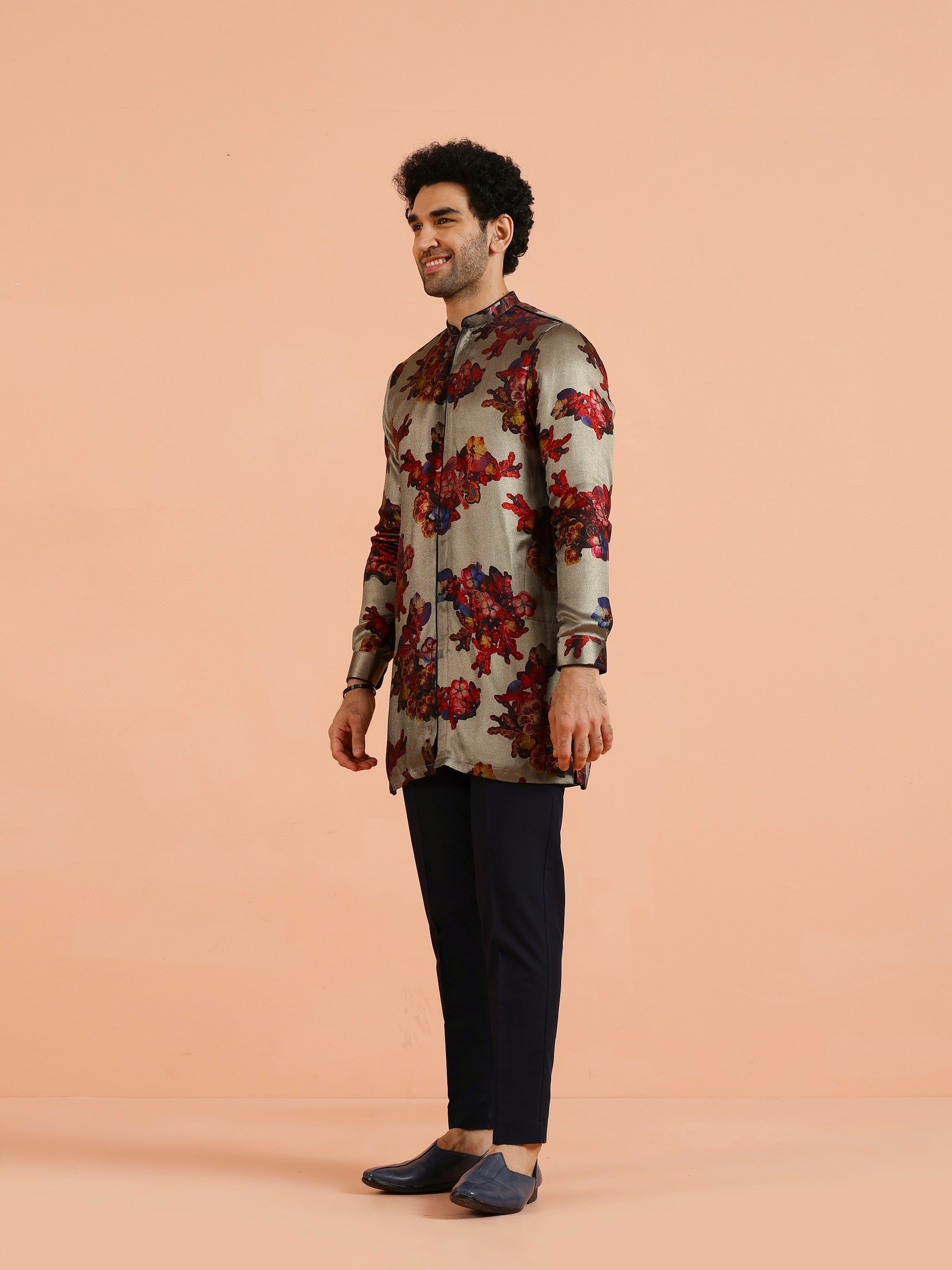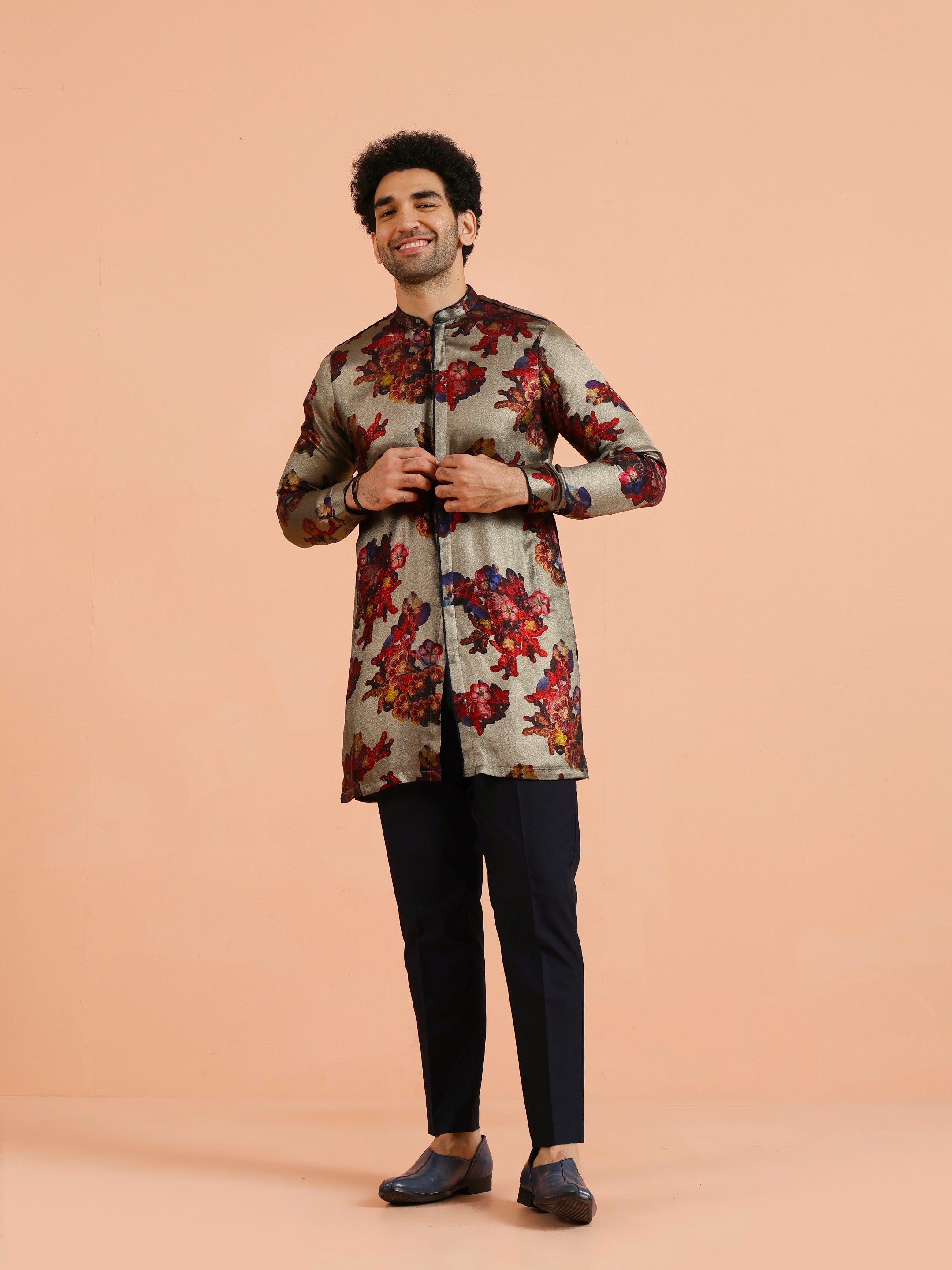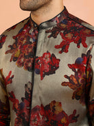 Kisah menss grey silk blend kurta set with floral motifs. Stylish, premium, and ideal for weddings, festive events, and evening occasions.