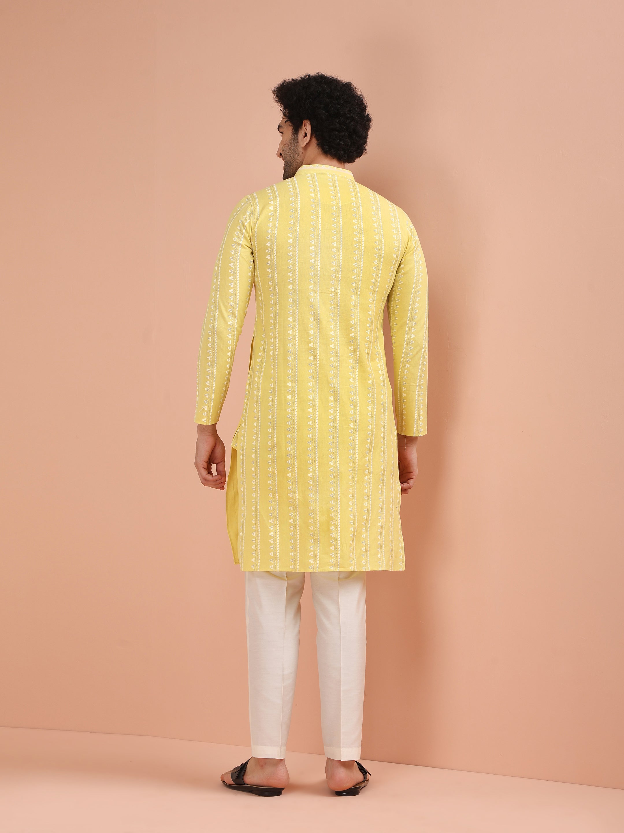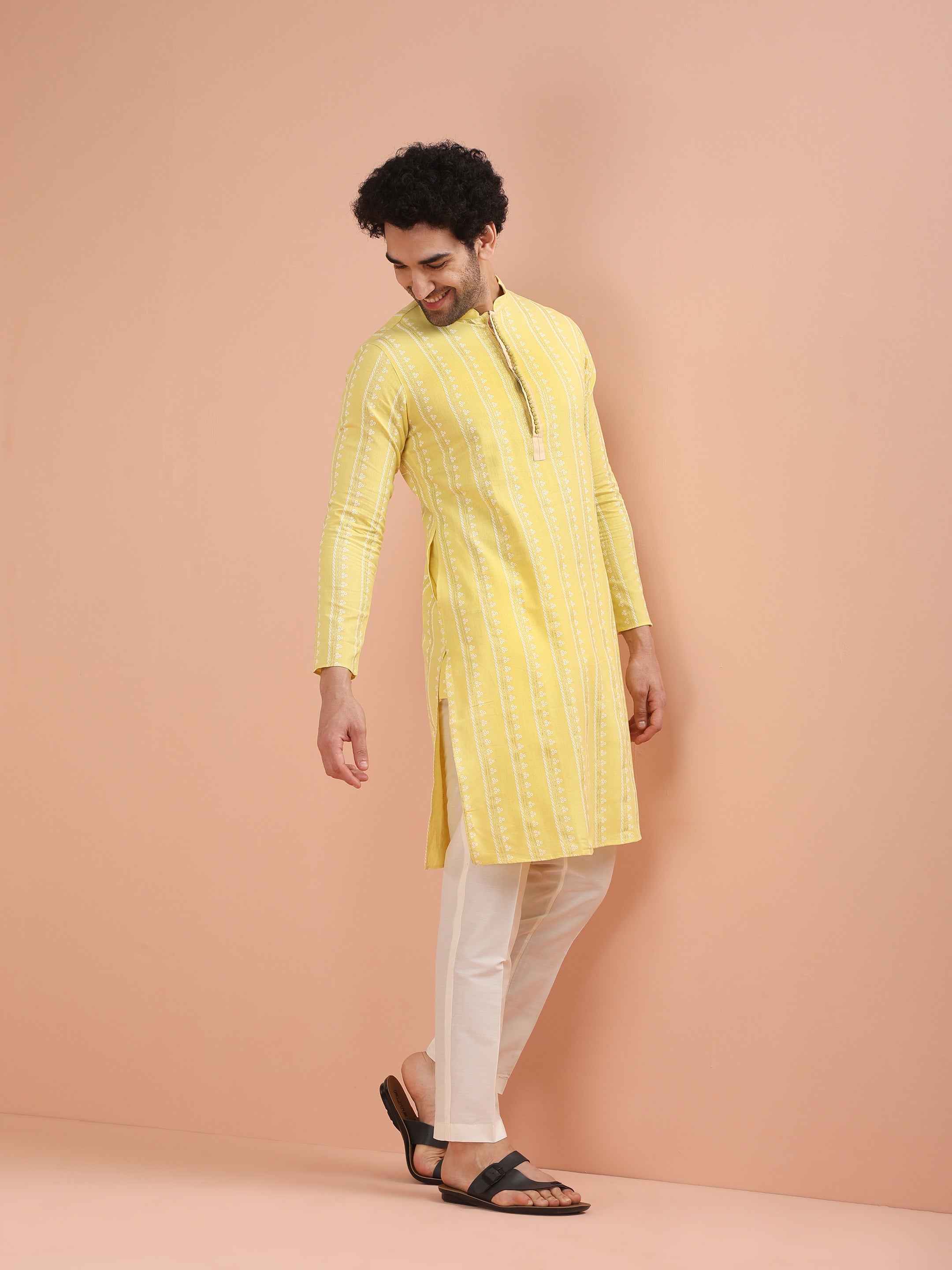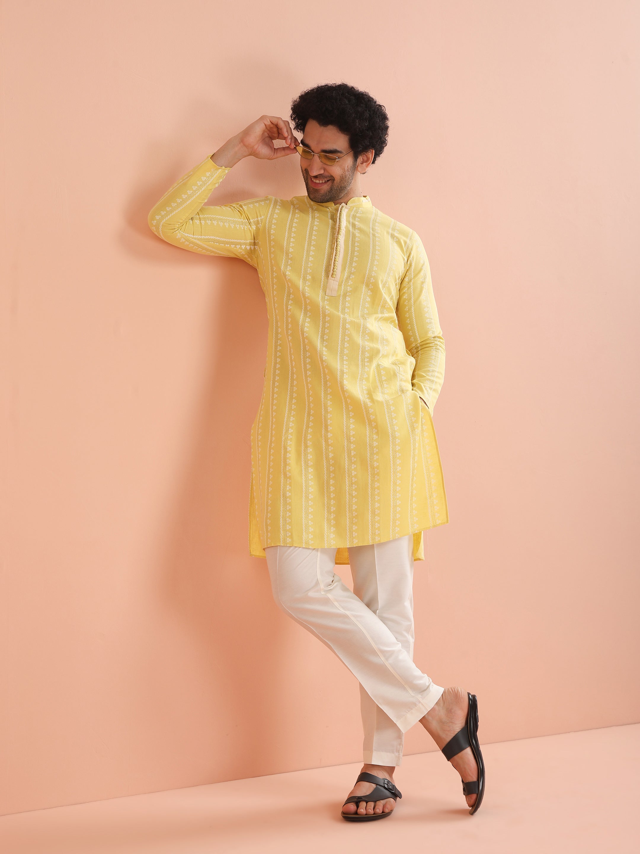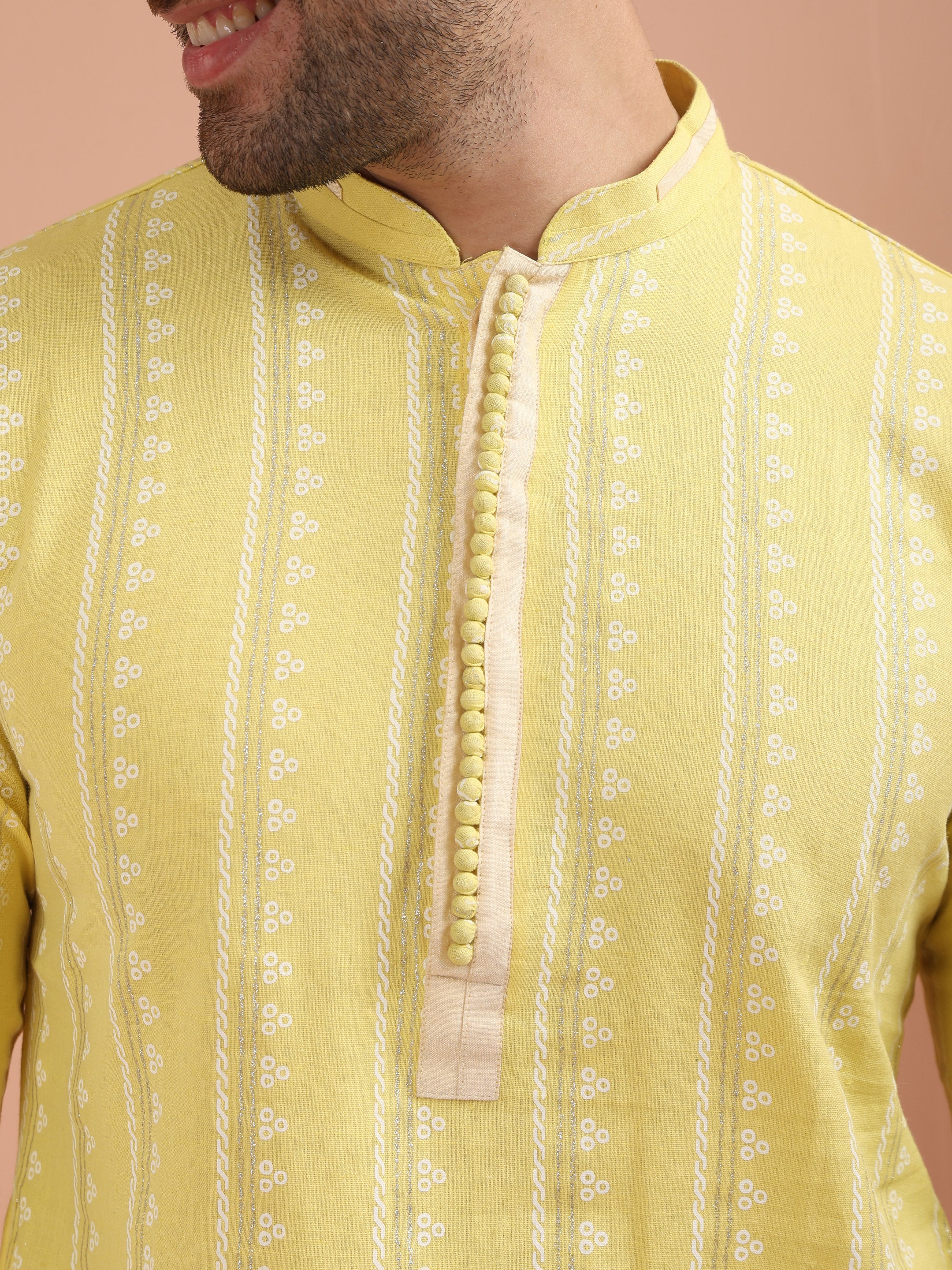 Men Yellow Printed Kurta Trouser Set with Gundi Buttons