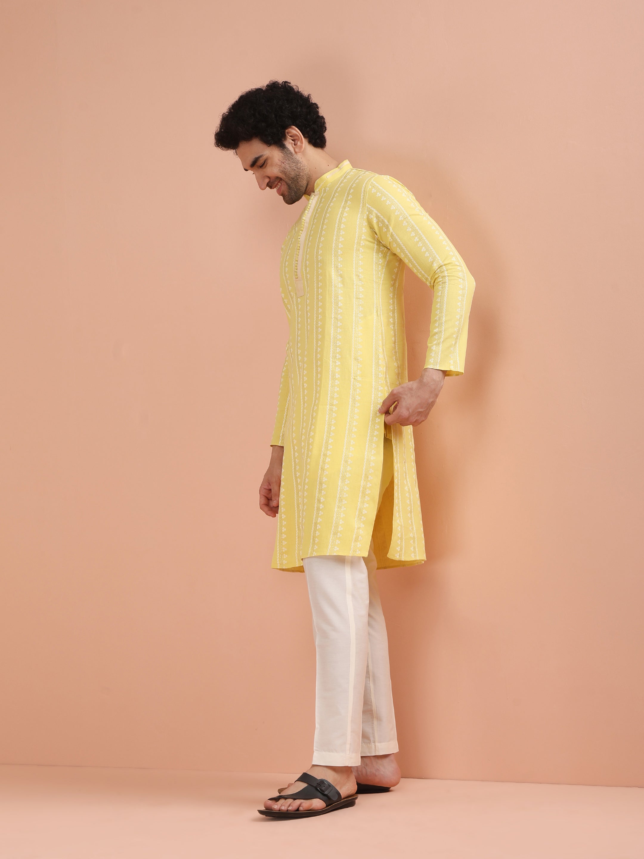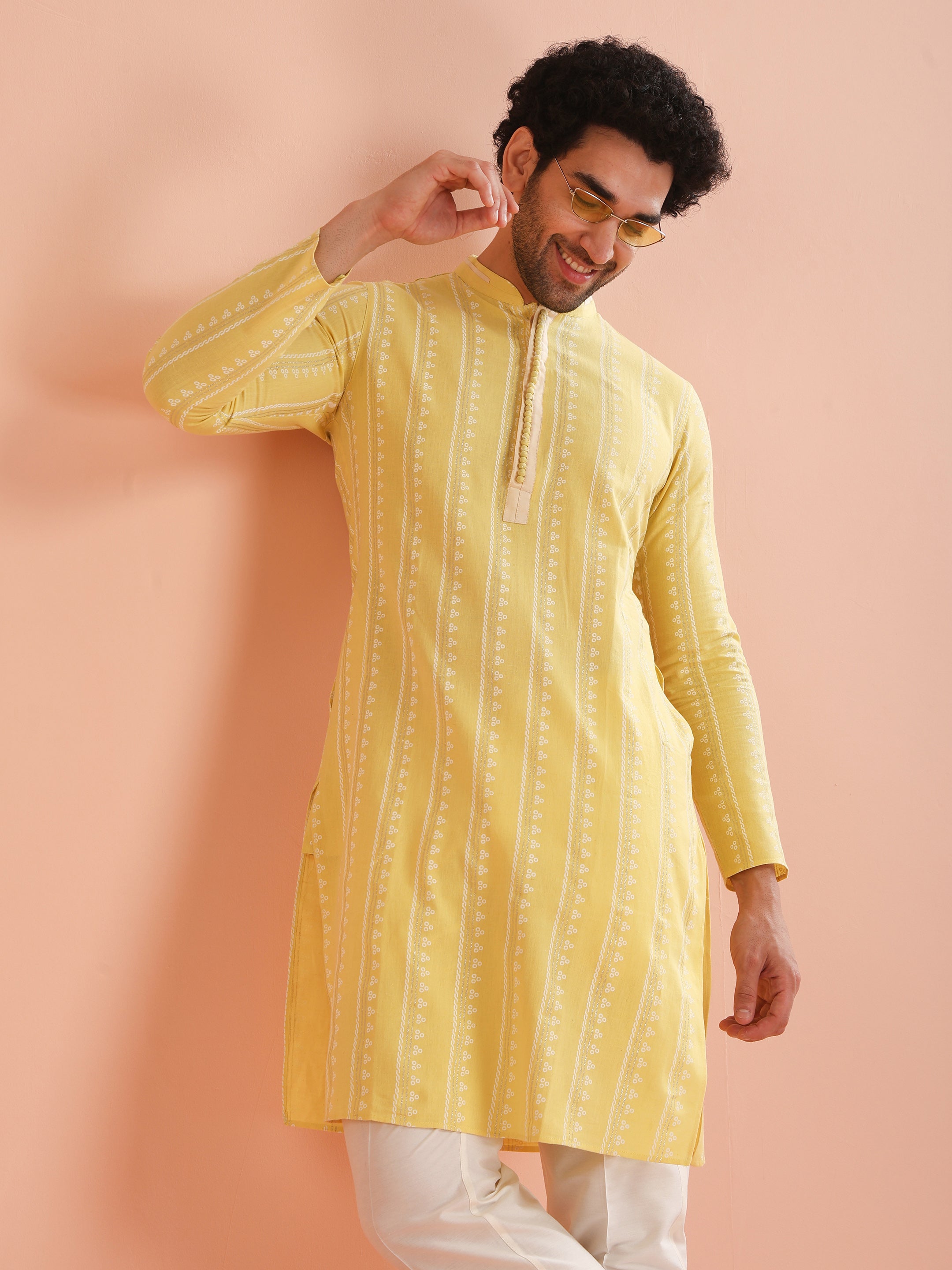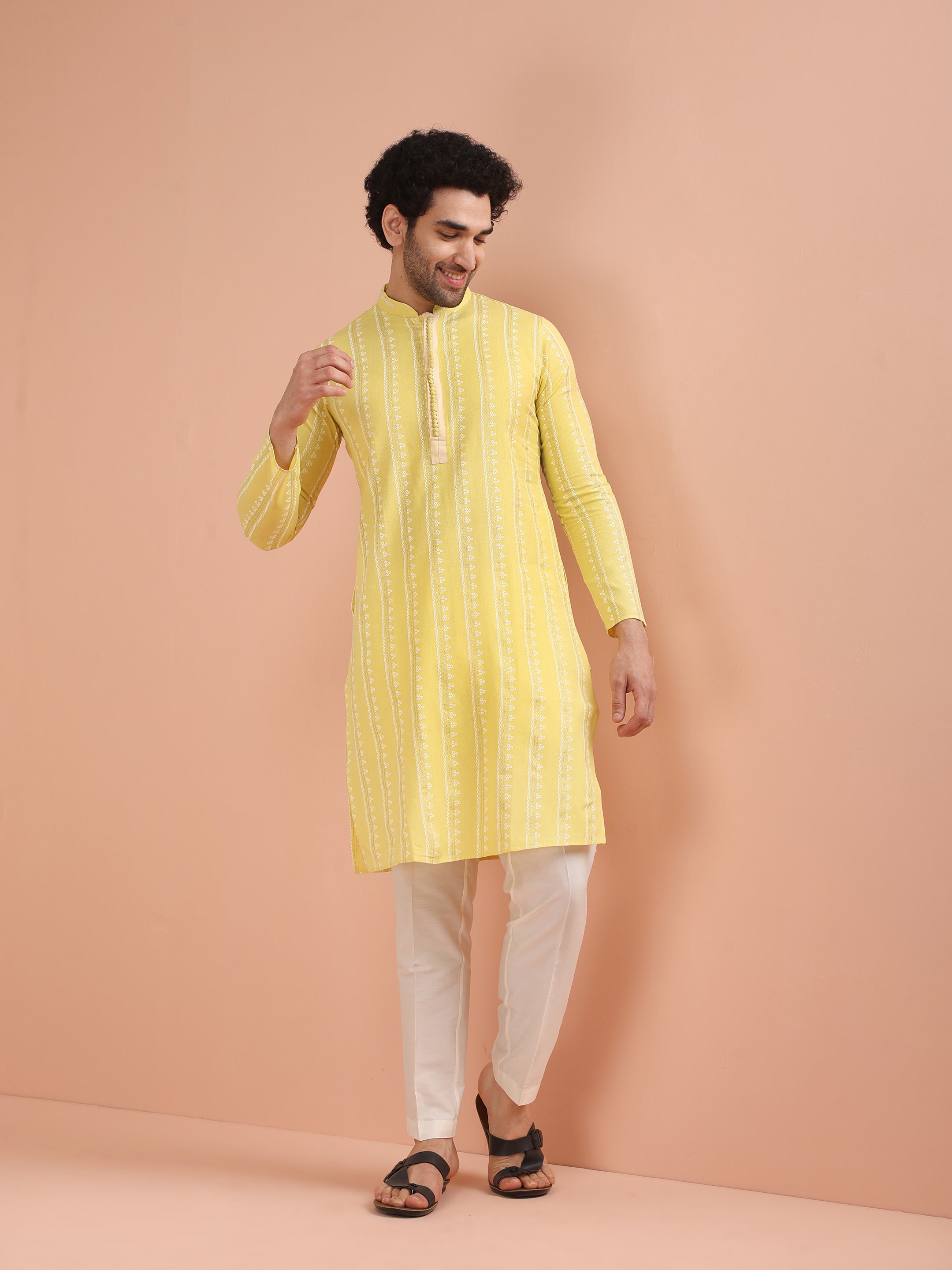 Experience classic elegance with this Men Yellow Printed Kurta Trouser Set with Gundi Buttons. The breathable Silk Blend fabric ensures comfort throughout the day. Ideal for festive events or casual wear.