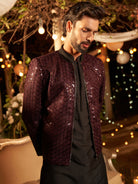 Men Wine Embellished Kurta Bomber Jacket Trouser Set with Sequence