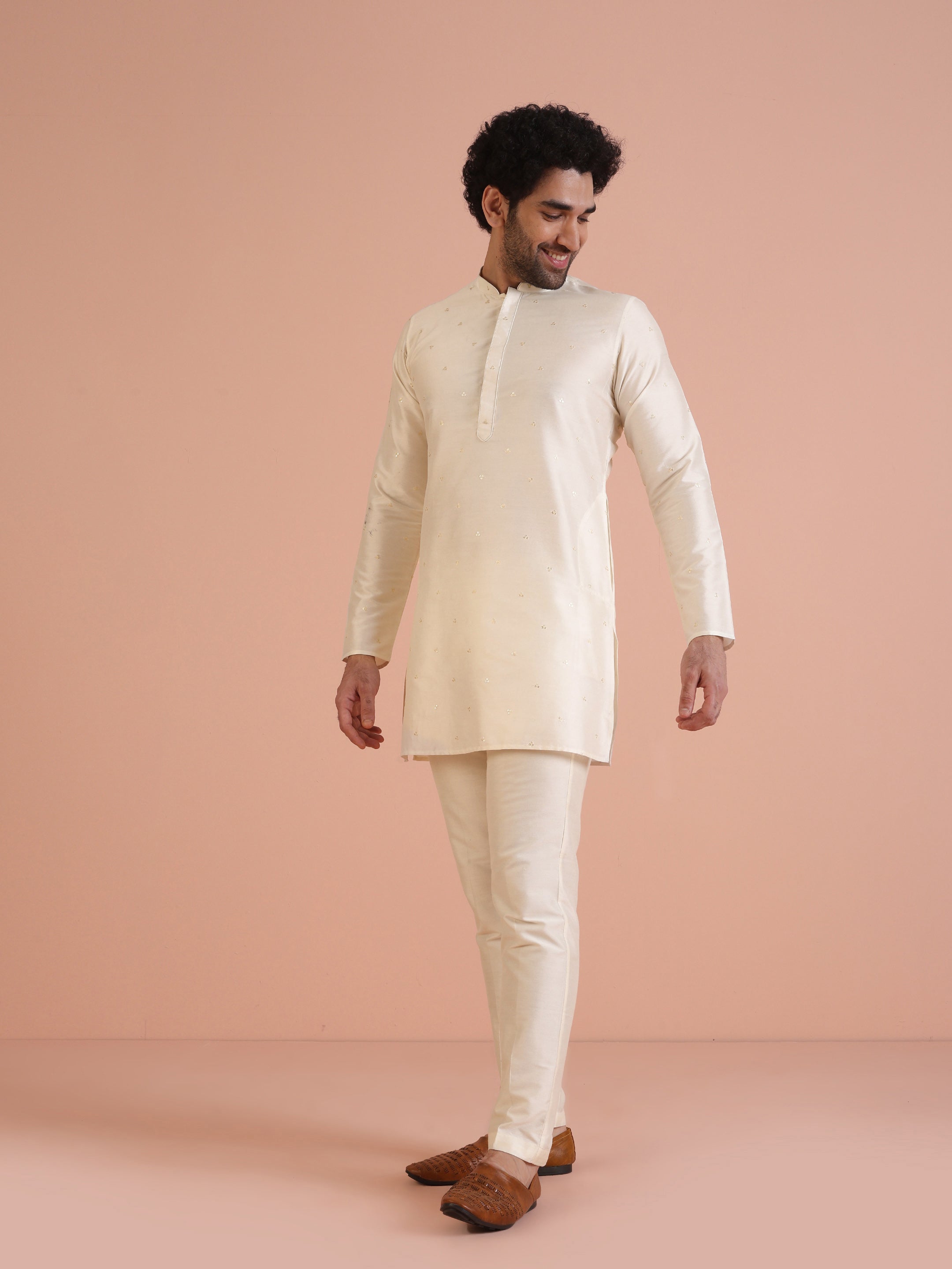 Experience classic elegance with this Men Off White Embroidered Kurta with Sequinned. The breathable Cotton Blend fabric ensures comfort throughout the day. Ideal for festive events or casual wear.