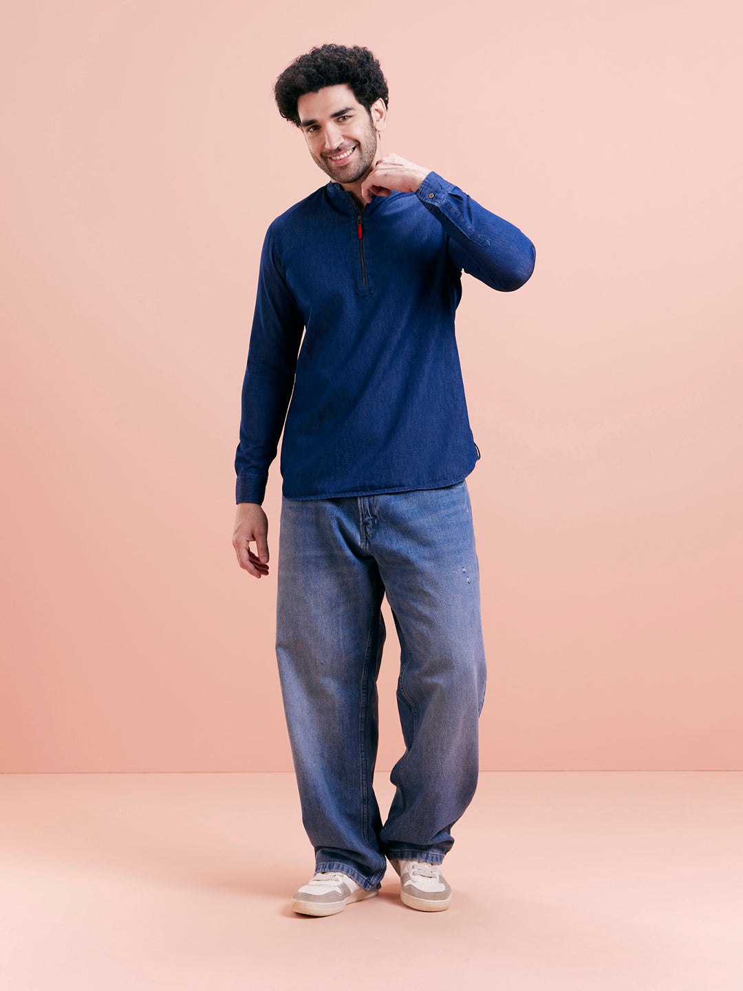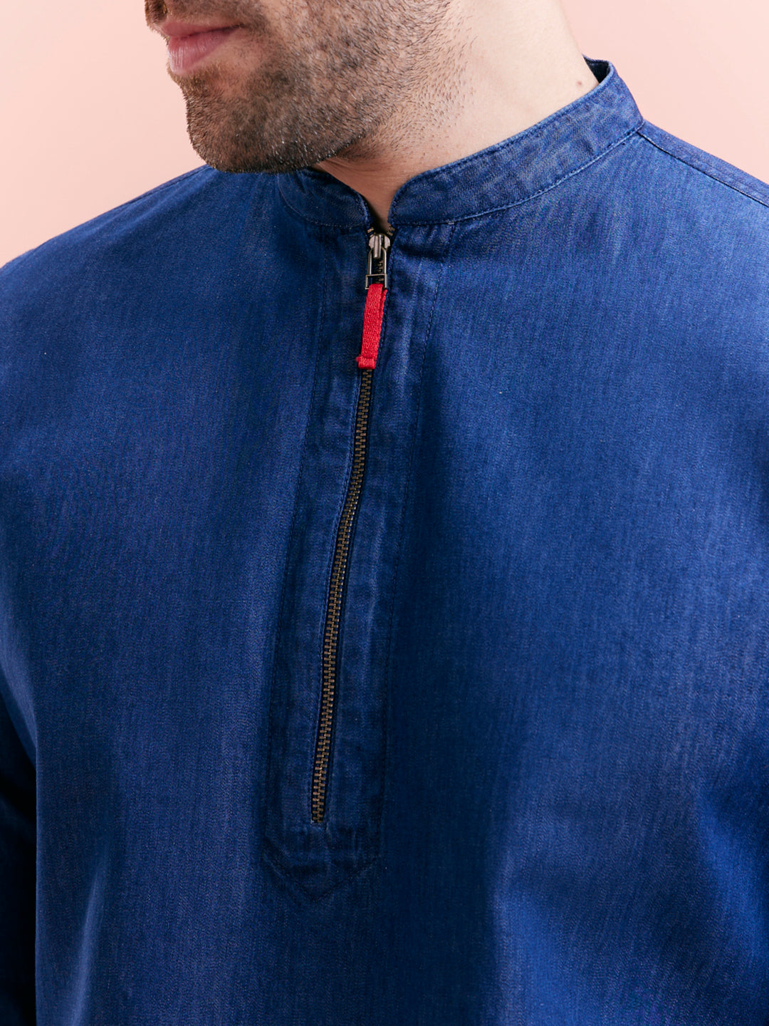 Tailored denim short kurta in breathable cotton with contrast zipper tab, ideal for casual weekend or outdoor dressing.