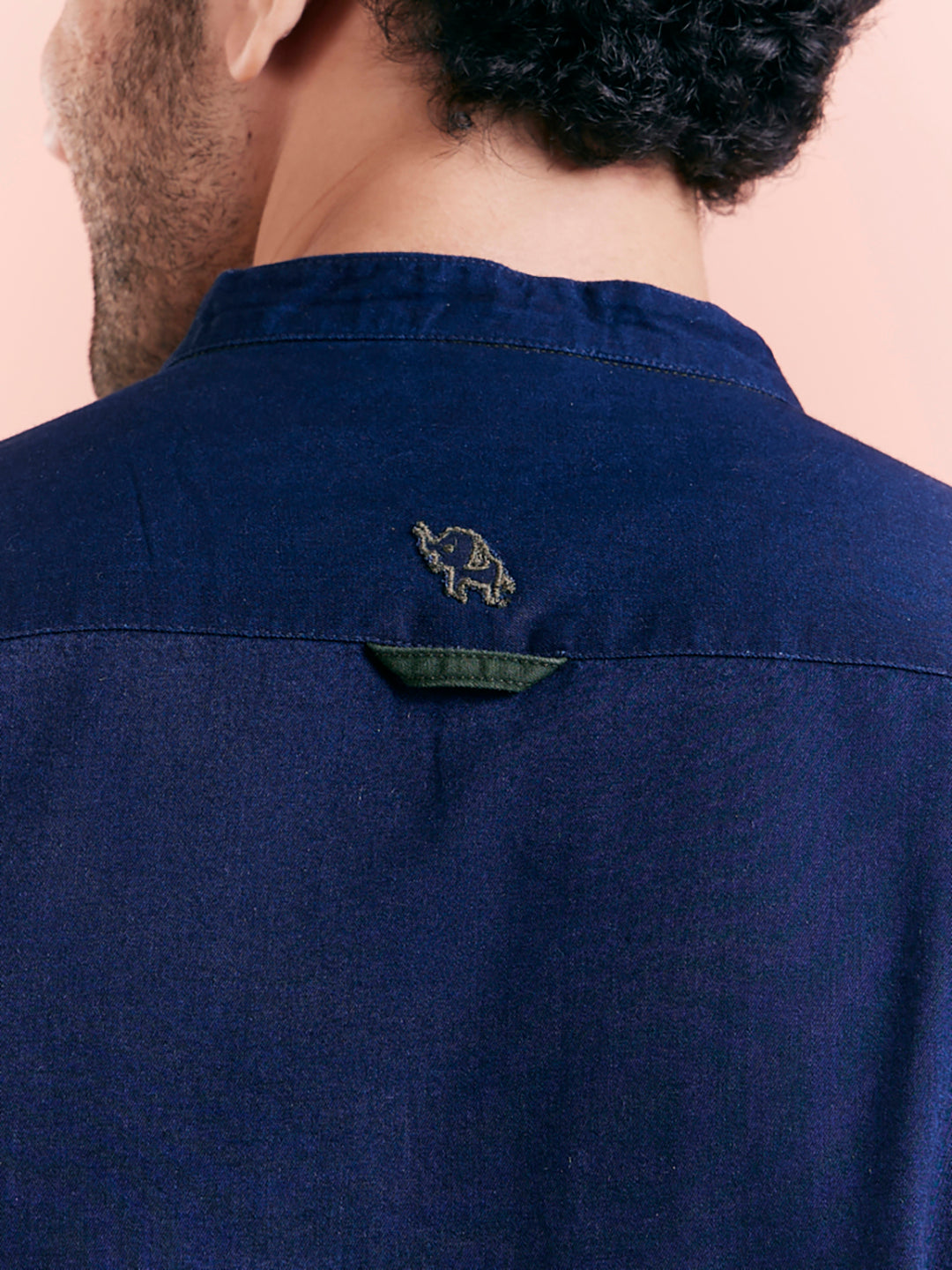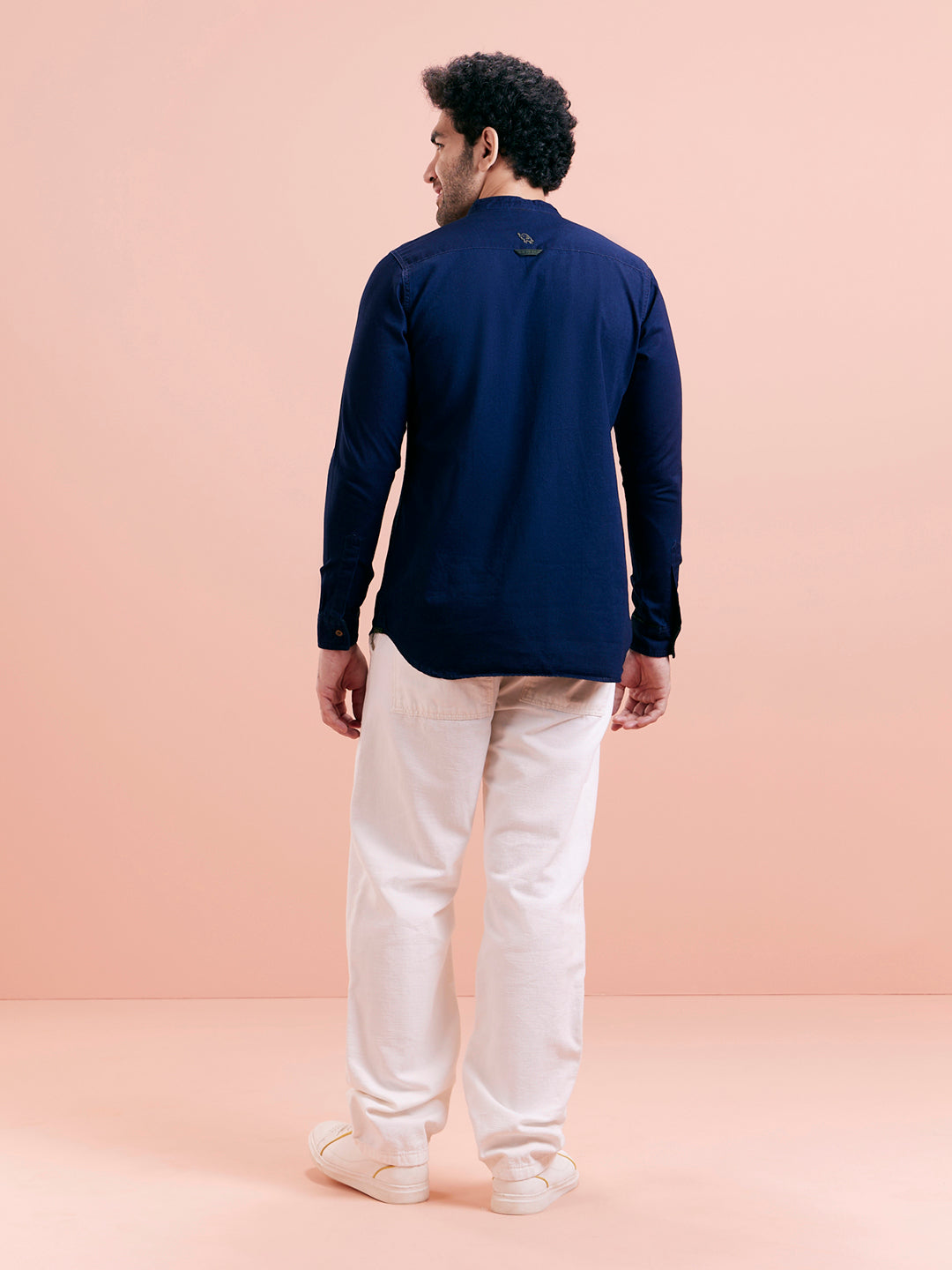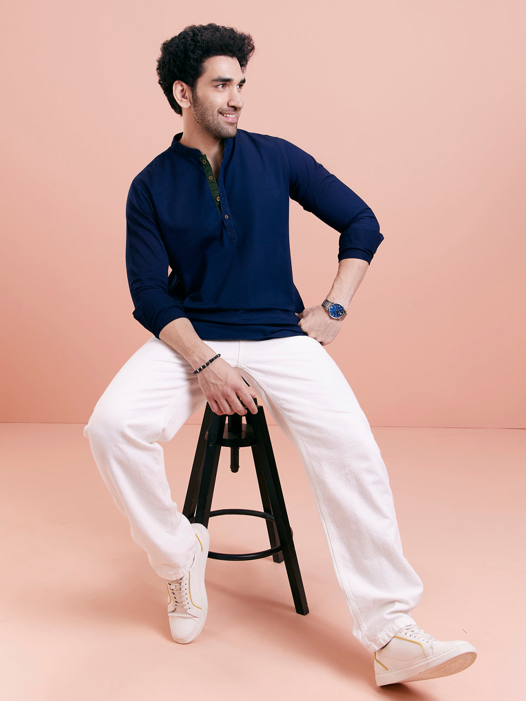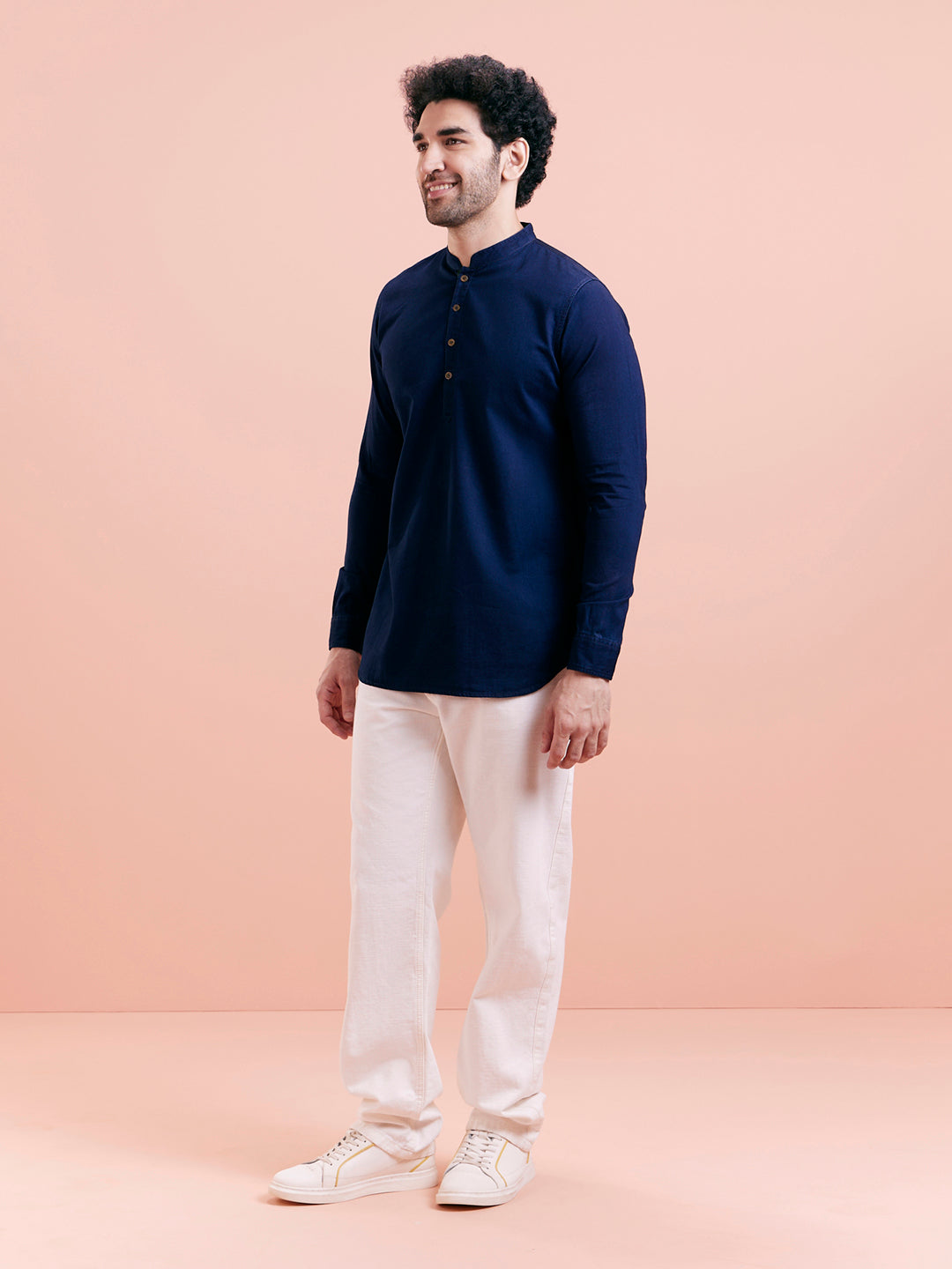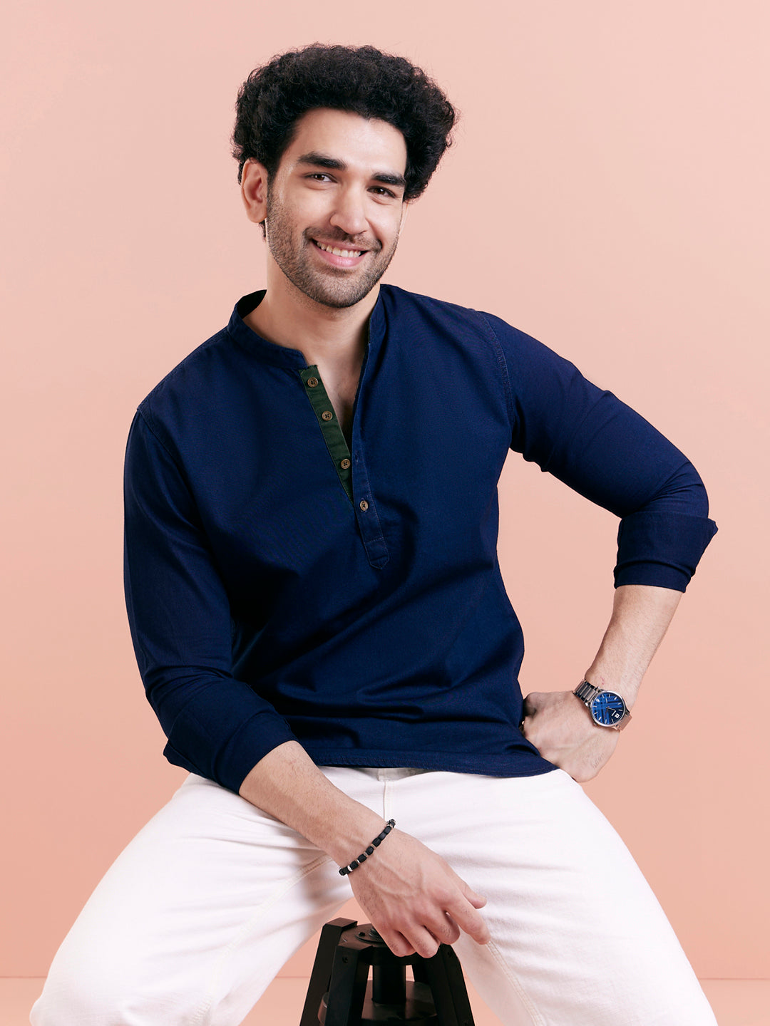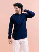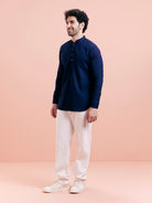 Structured short kurta in navy cotton blend with a contrast inner placket, perfect for casual dressing with refined flair.