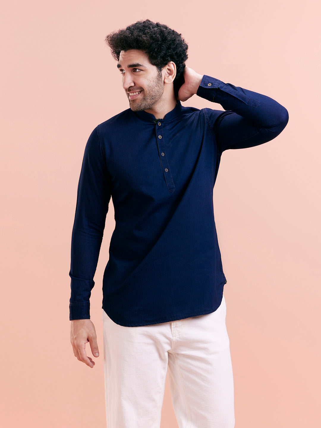Navy Blue Denim Solid Short Kurta