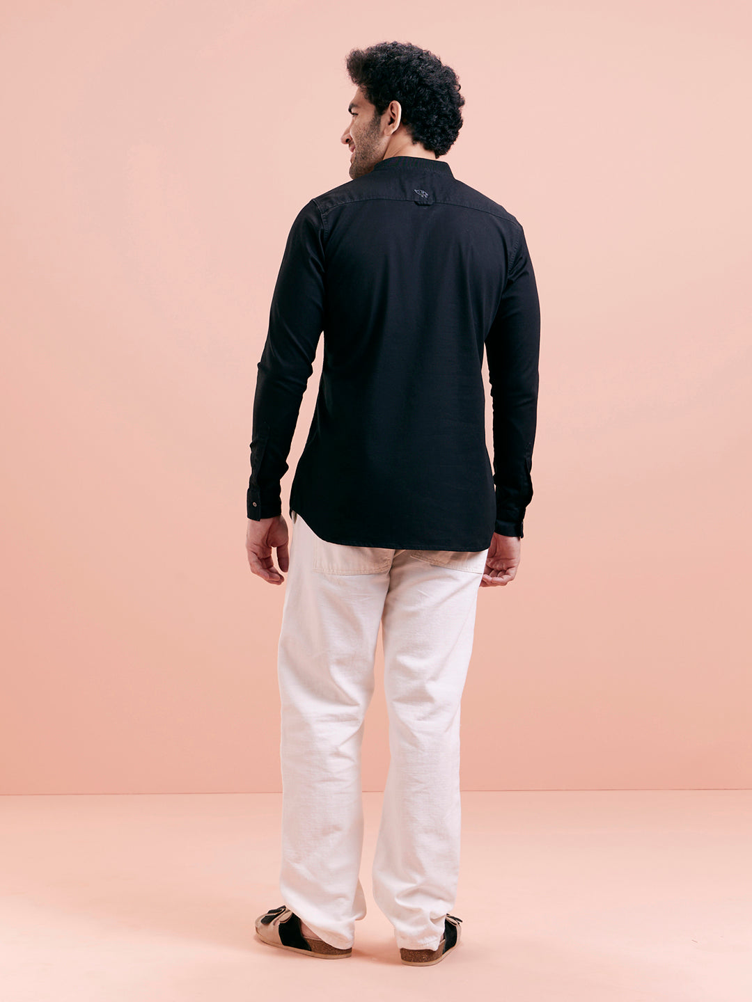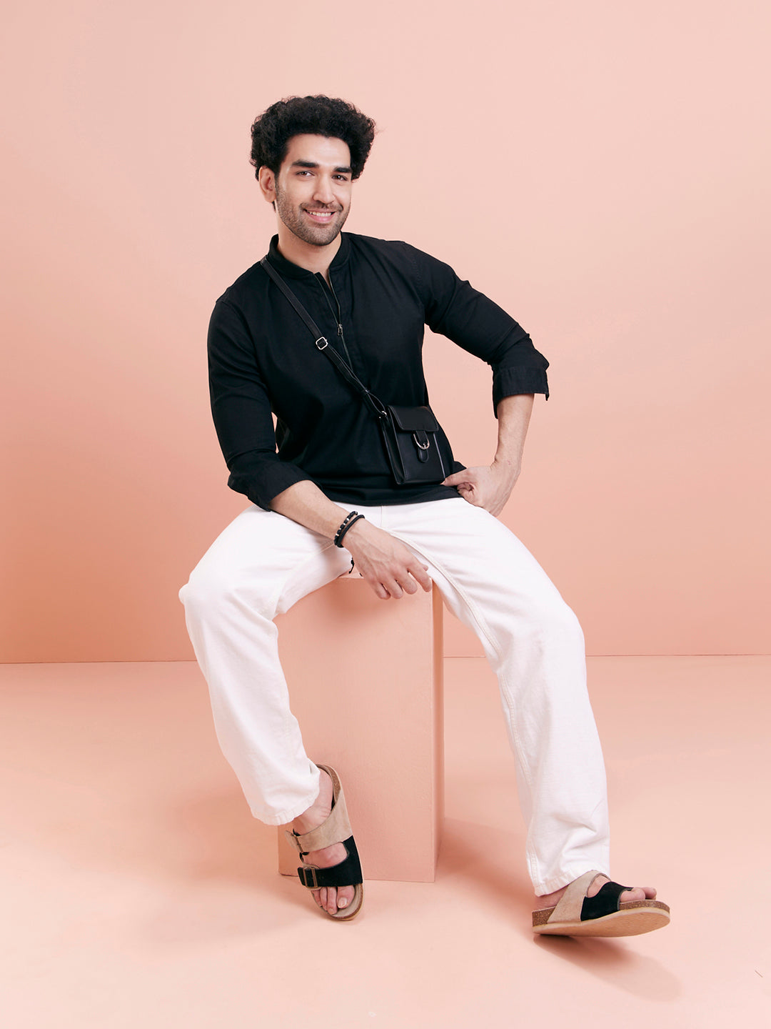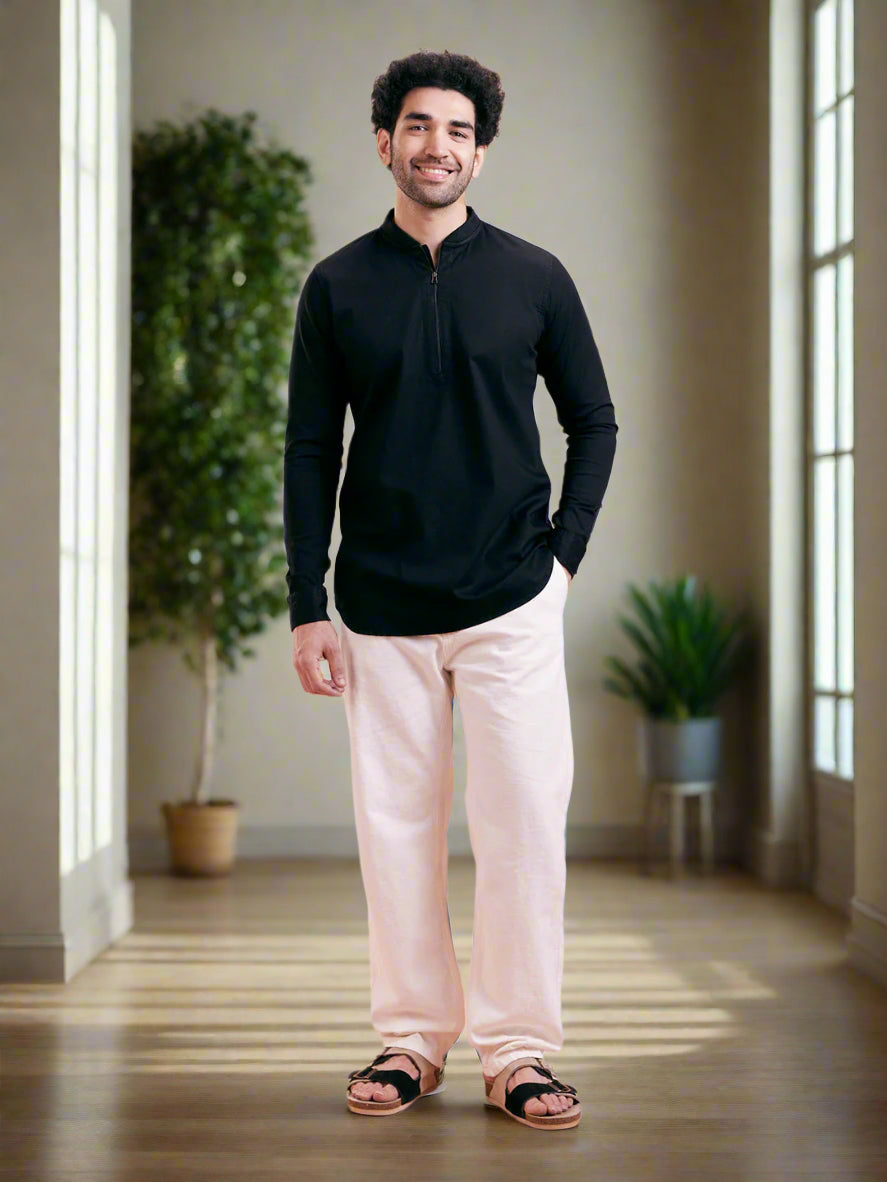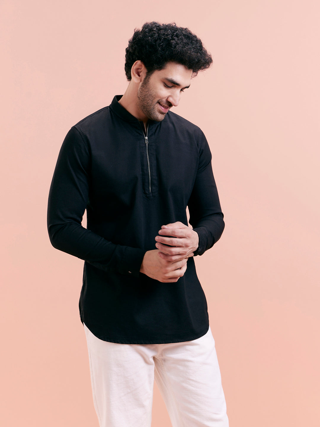 A black denim short kurta featuring a front zip and mandarin collar, crafted for clean, minimal styling across casual occasions.