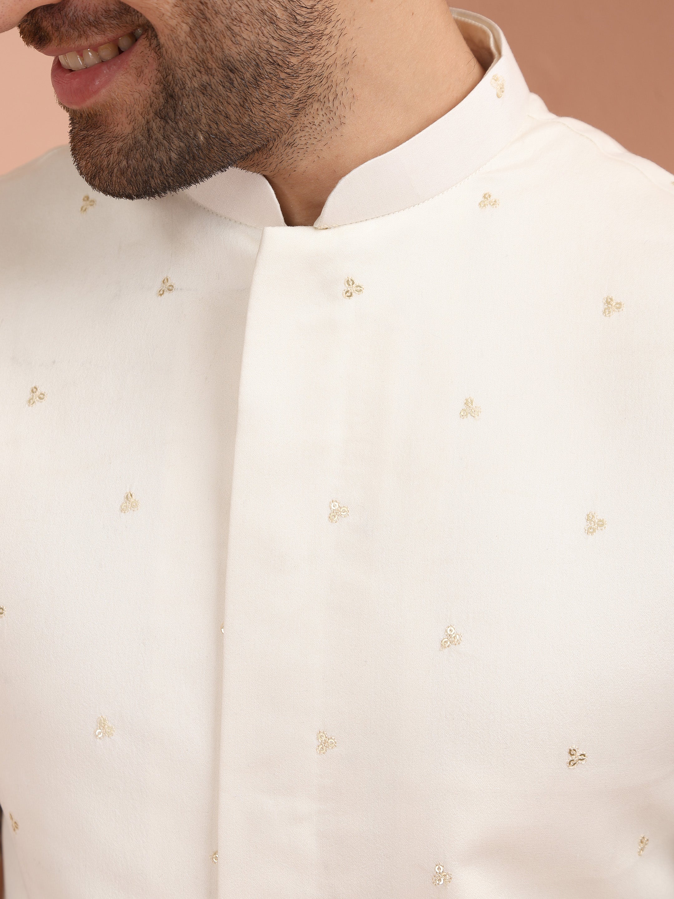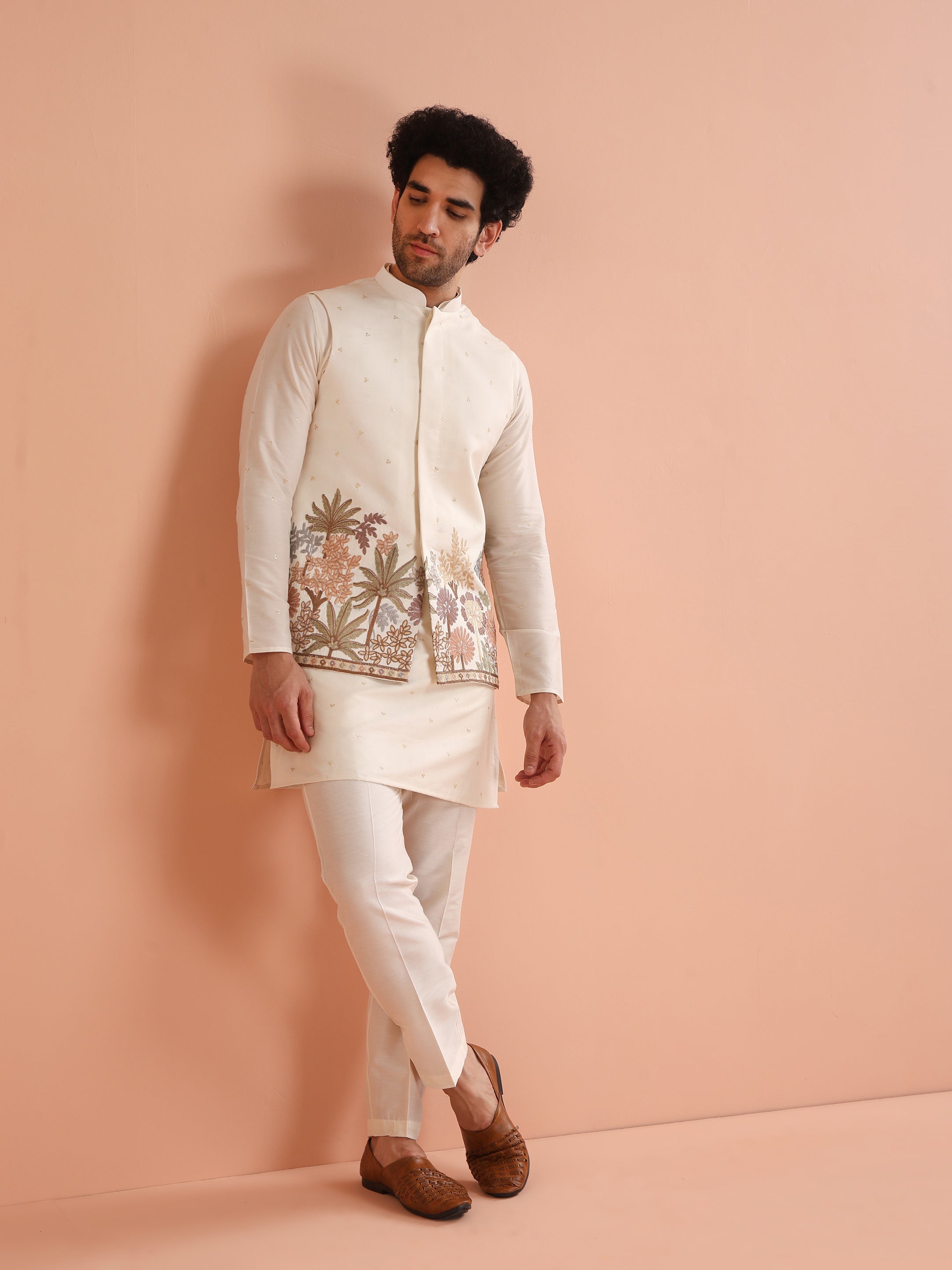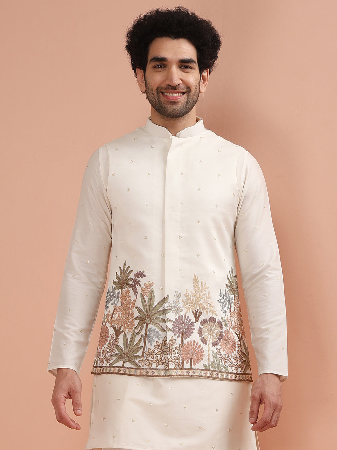 Experience classic elegance with this Men Off White Embroidered Jacket with Floral. The breathable Silk Blend fabric ensures comfort throughout the day. Ideal for festive events or casual wear.