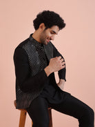 Experience classic elegance with this Men Black Embroidered Nehru Jacket with Thread Work. The breathable Silk Blend fabric ensures comfort throughout the day. Ideal for festive events or casual wear.