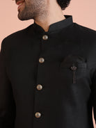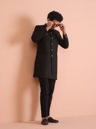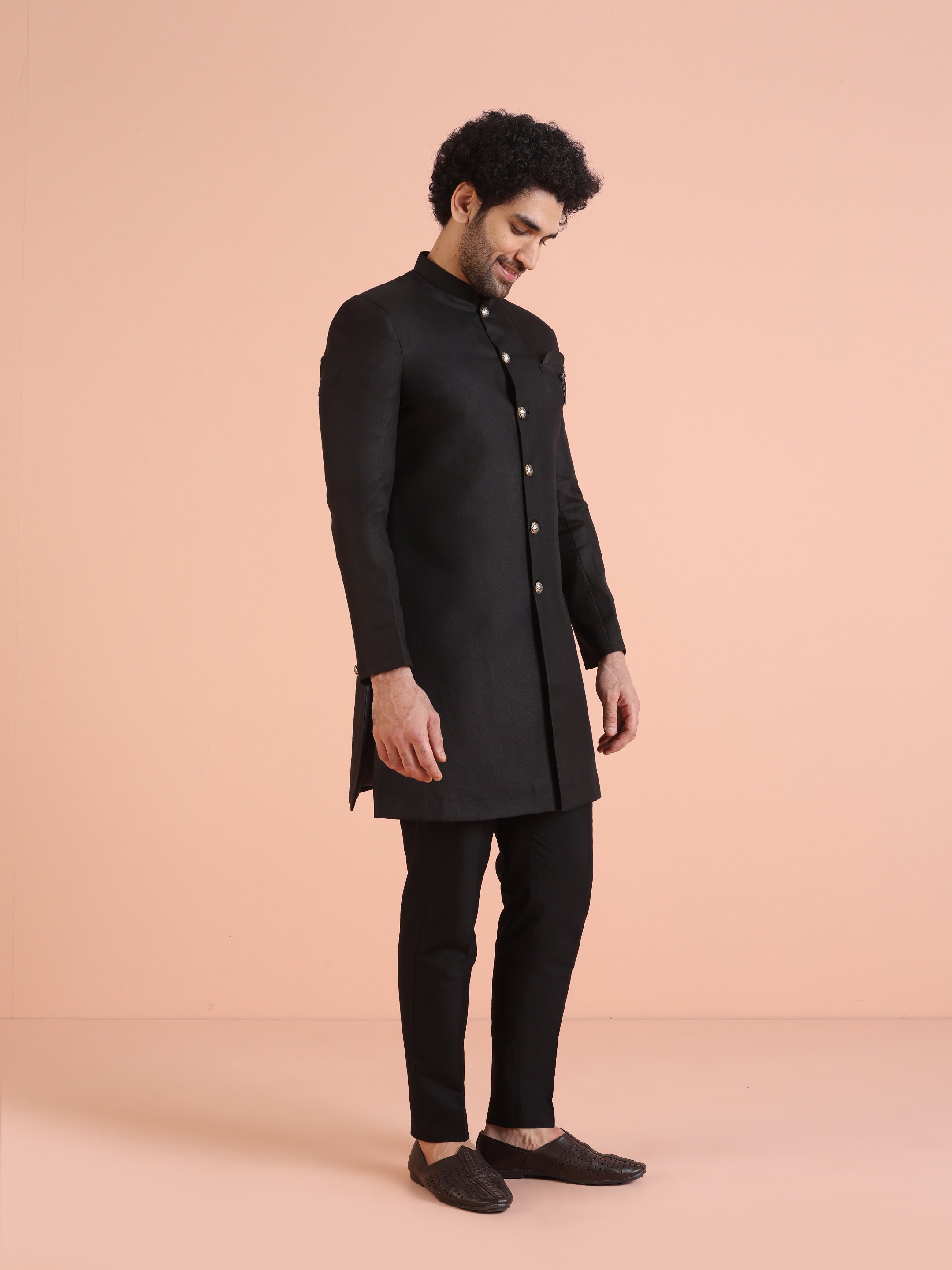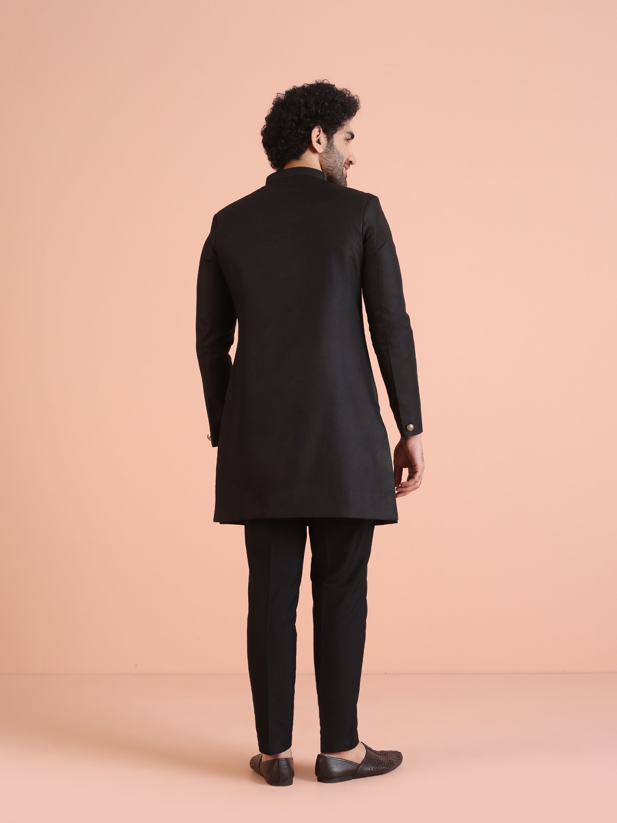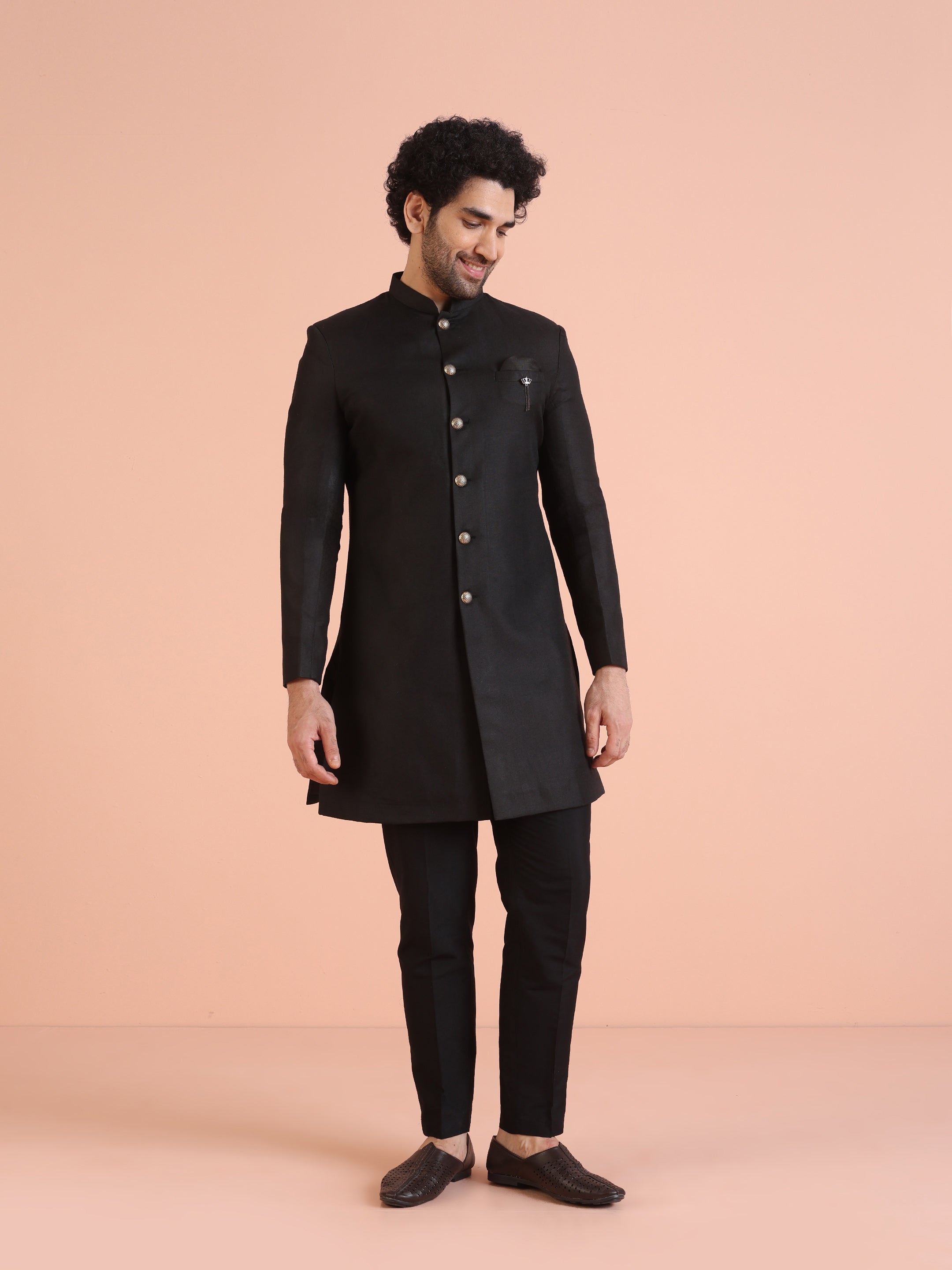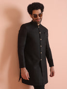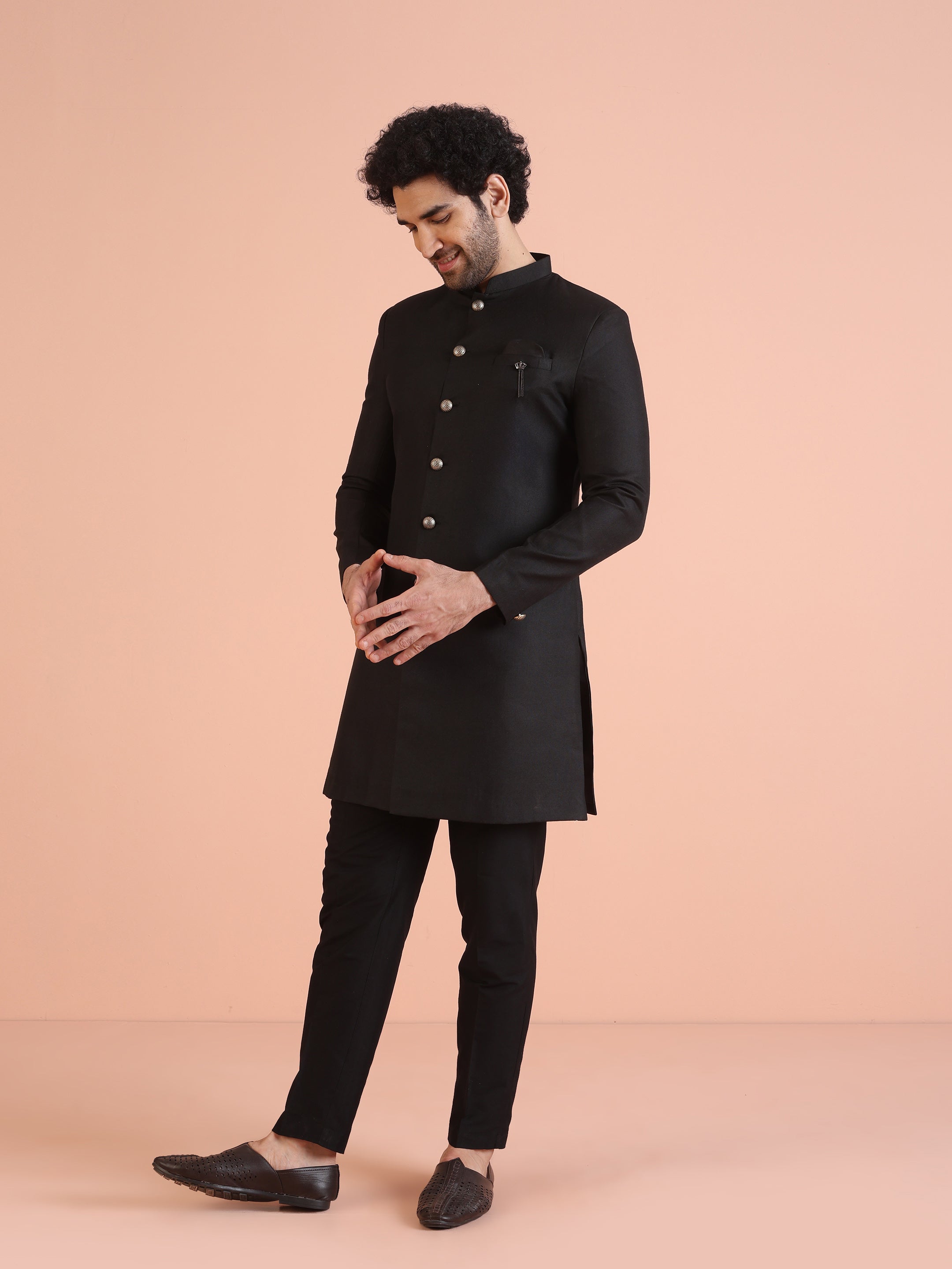 Experience classic elegance with this Men's Black Solid Dyed Indowestern Trouser Set. The breathable fabric ensures comfort throughout the day. Ideal for any festive events.