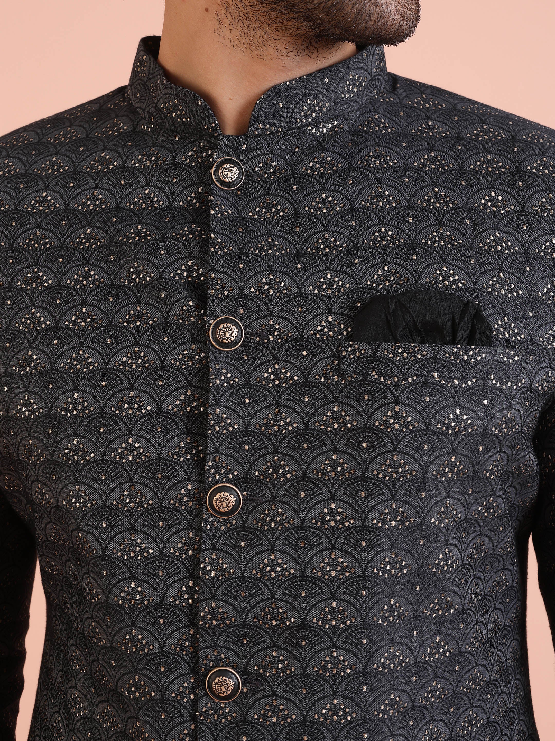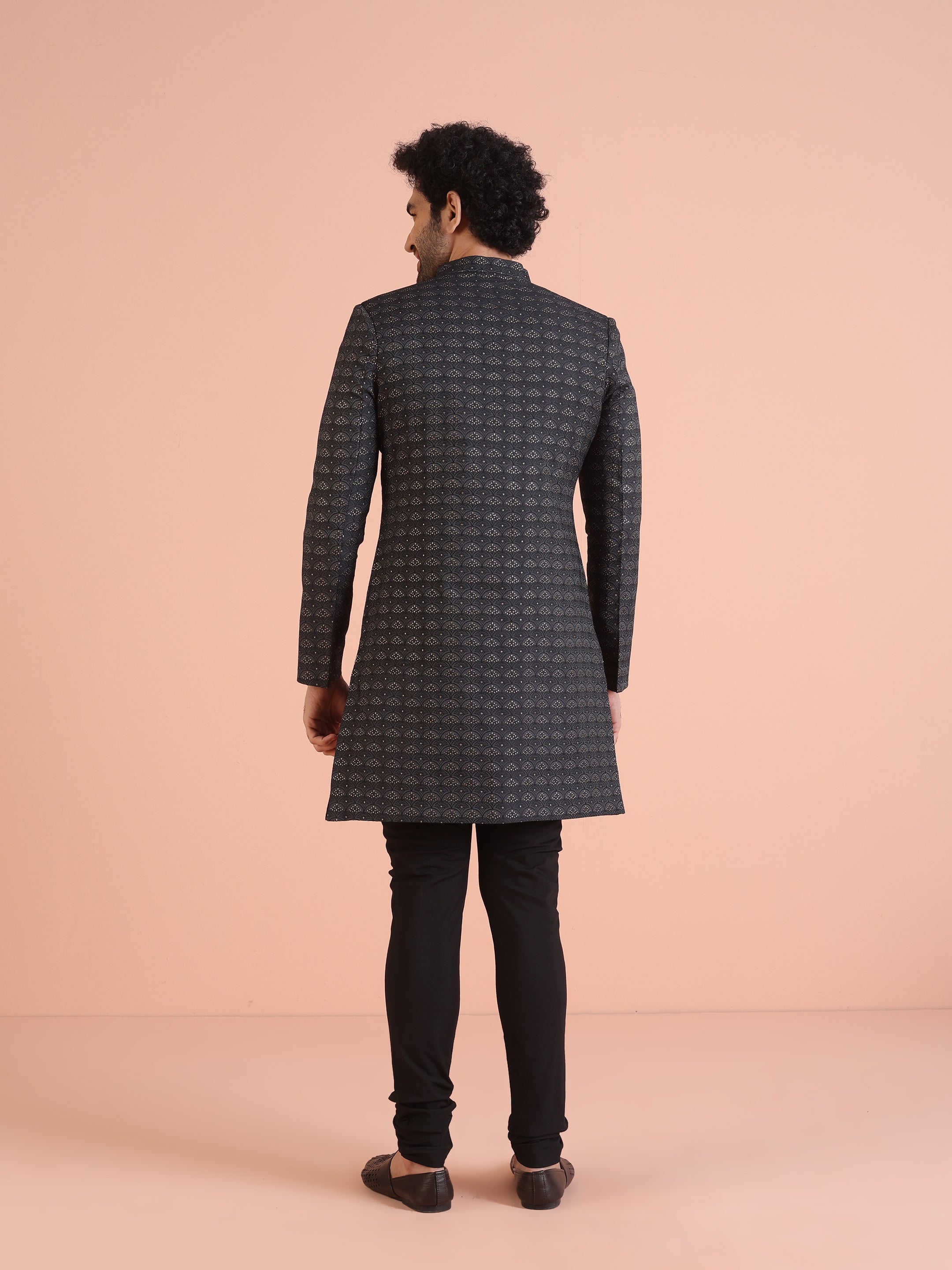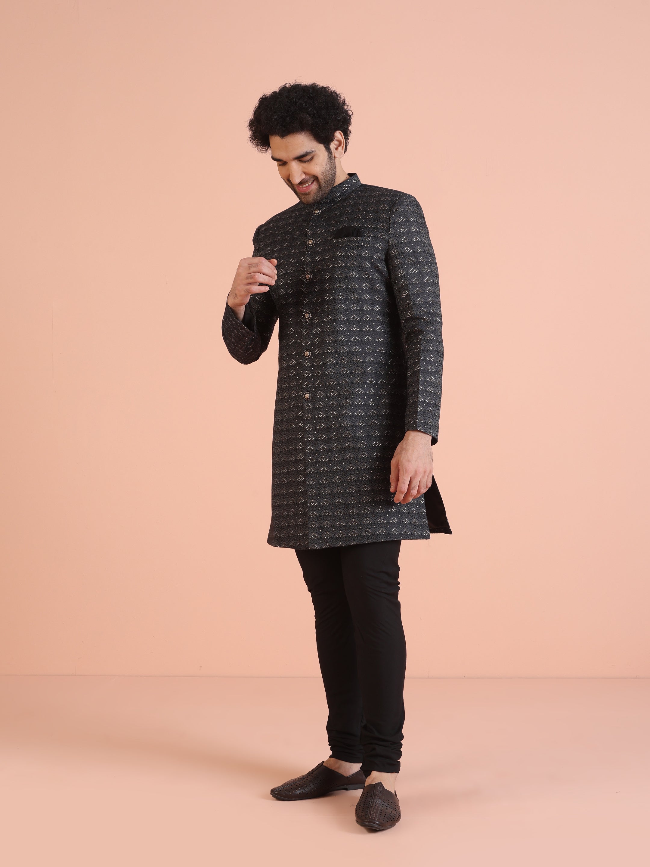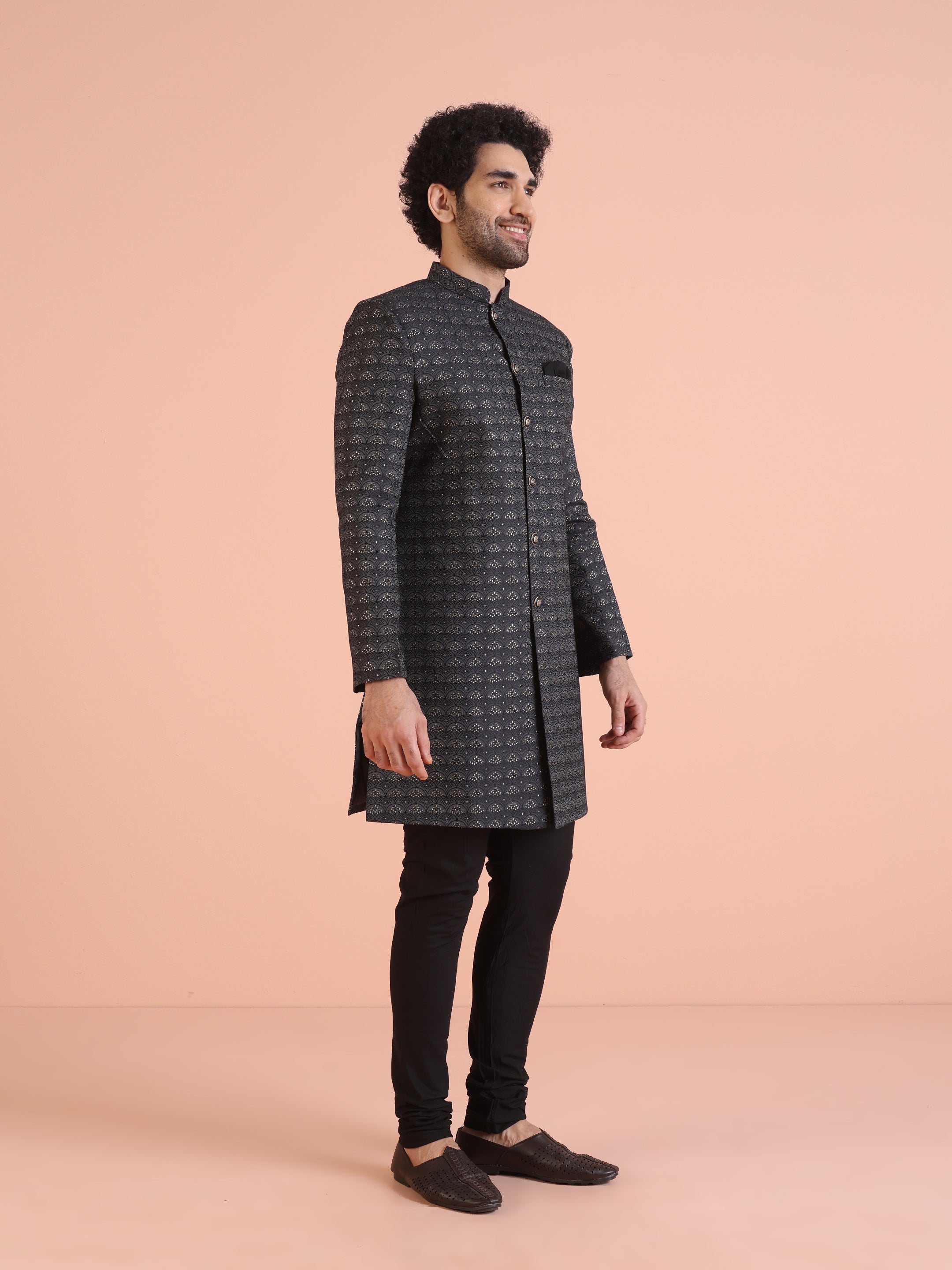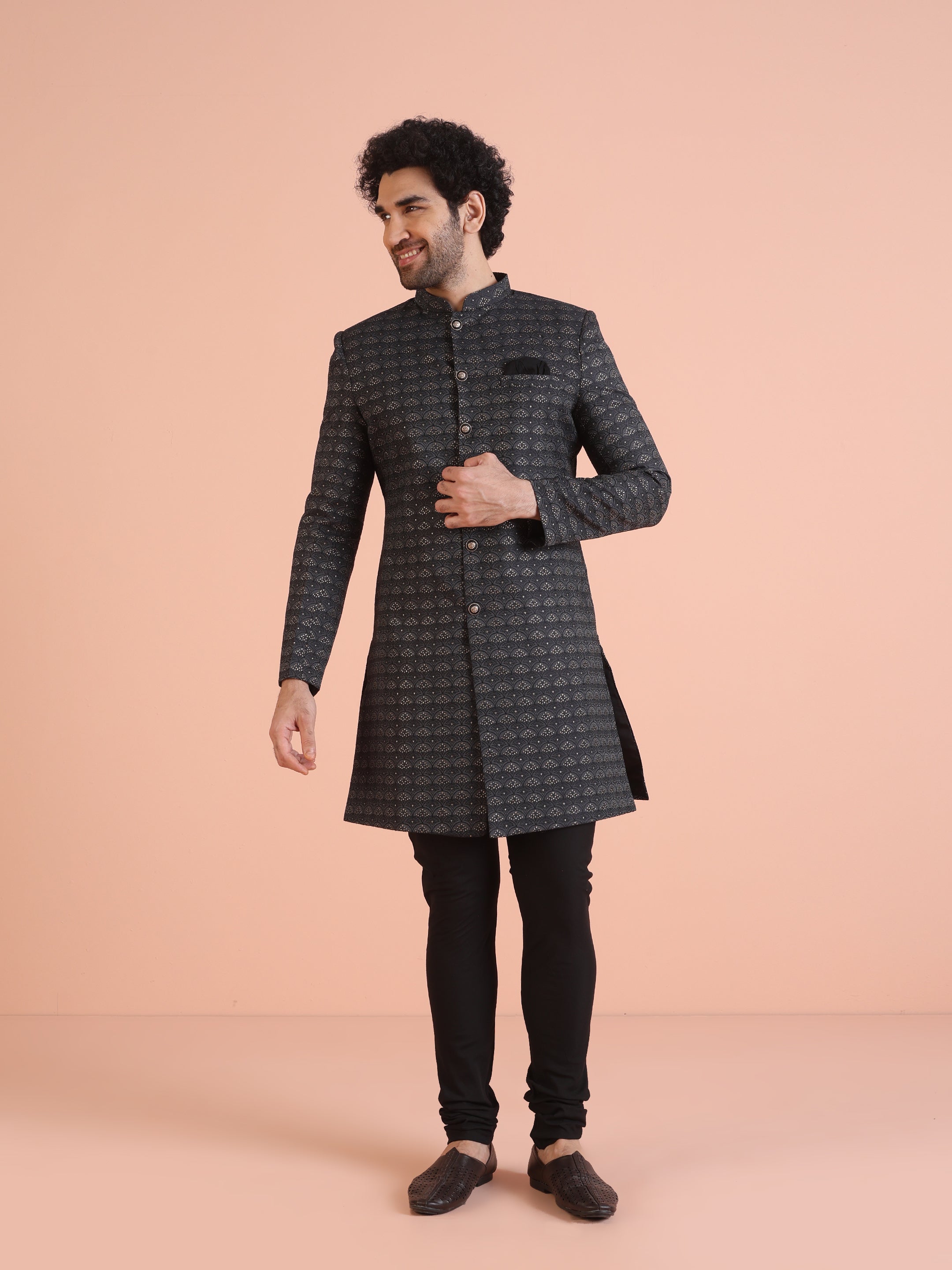 Experience classic elegance with this Men Black Jacquard Indowestern Sherwani Churidar Set. The Jacquard Pattern adds a refined touch, while the breathable fabric ensures comfort throughout the day. Ideal for festive events or casual wear.