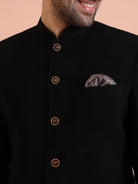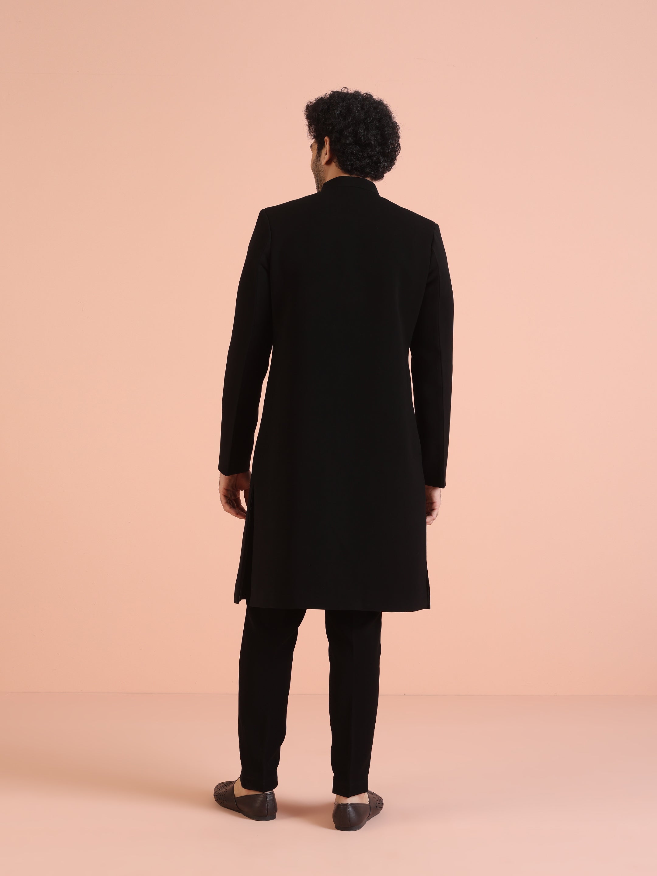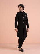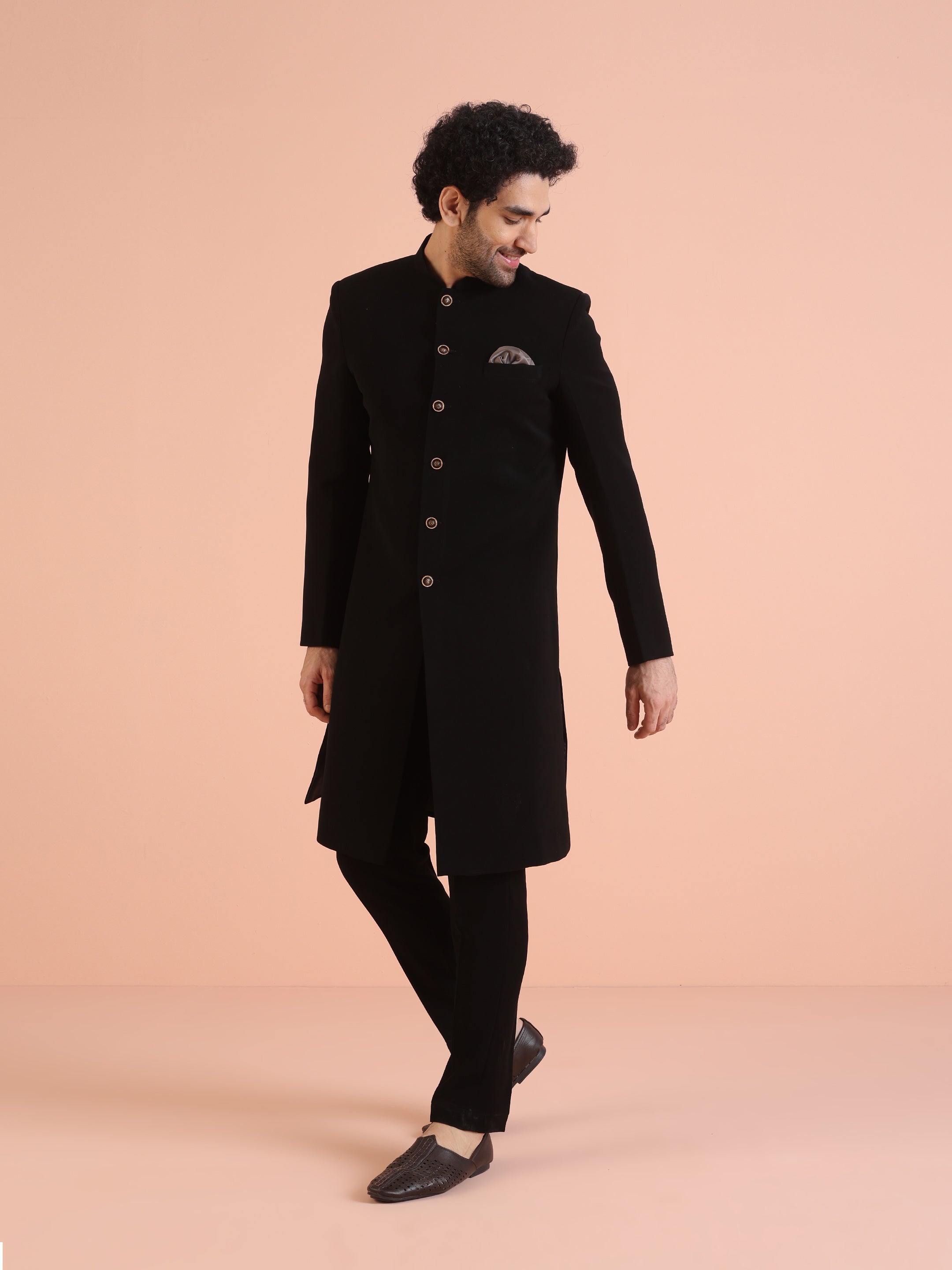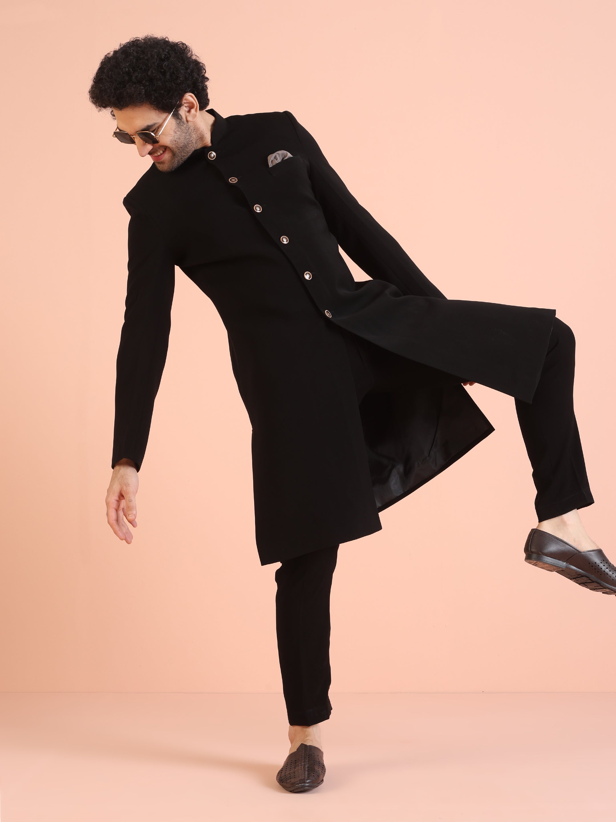 Experience classic elegance with this Men Black Solid Indowestern Sherwani Trouser Set. The Solid Pattern adds a refined touch, while the breathable fabric ensures comfort throughout the day. Ideal for festive events or casual wear.