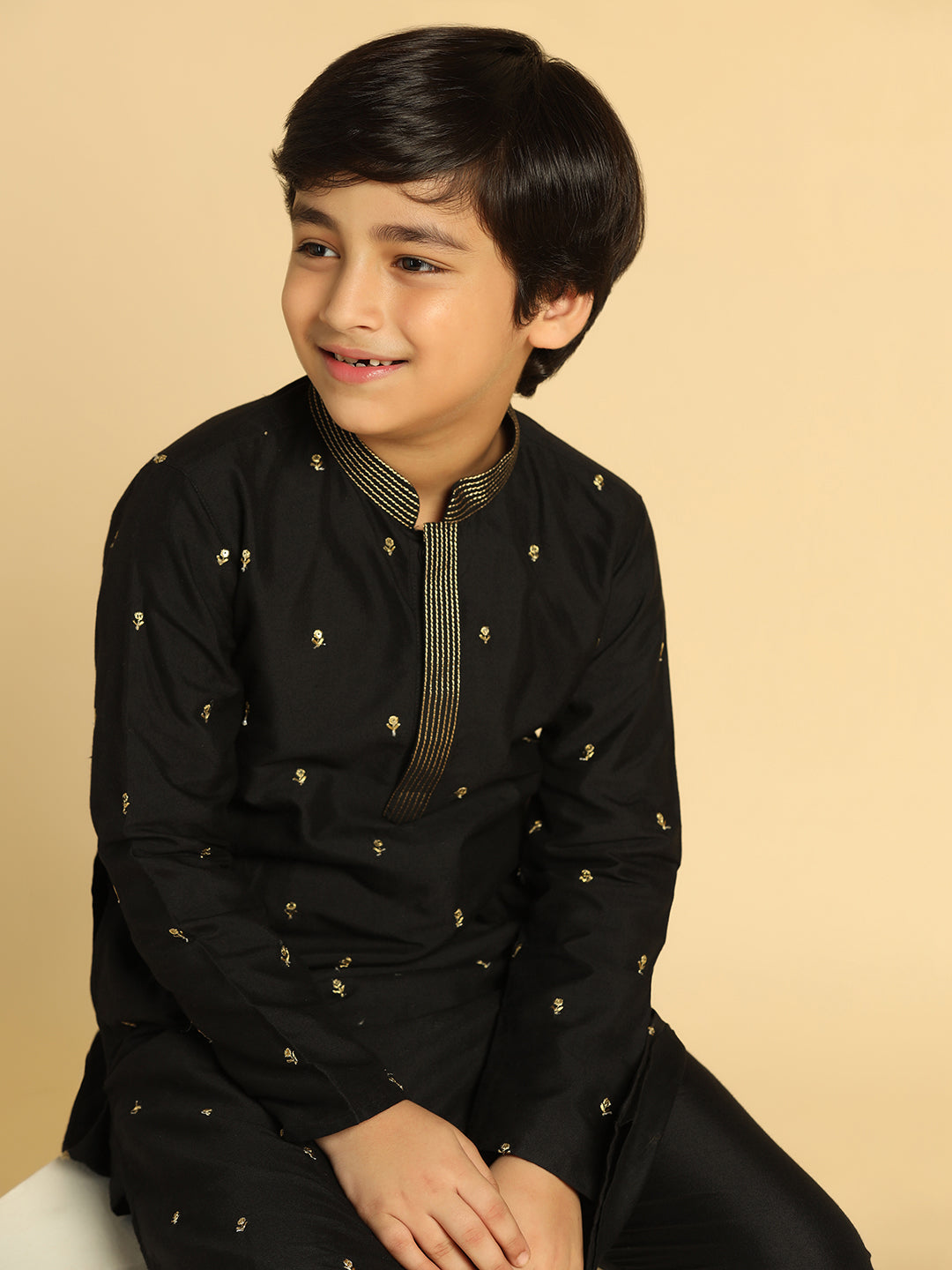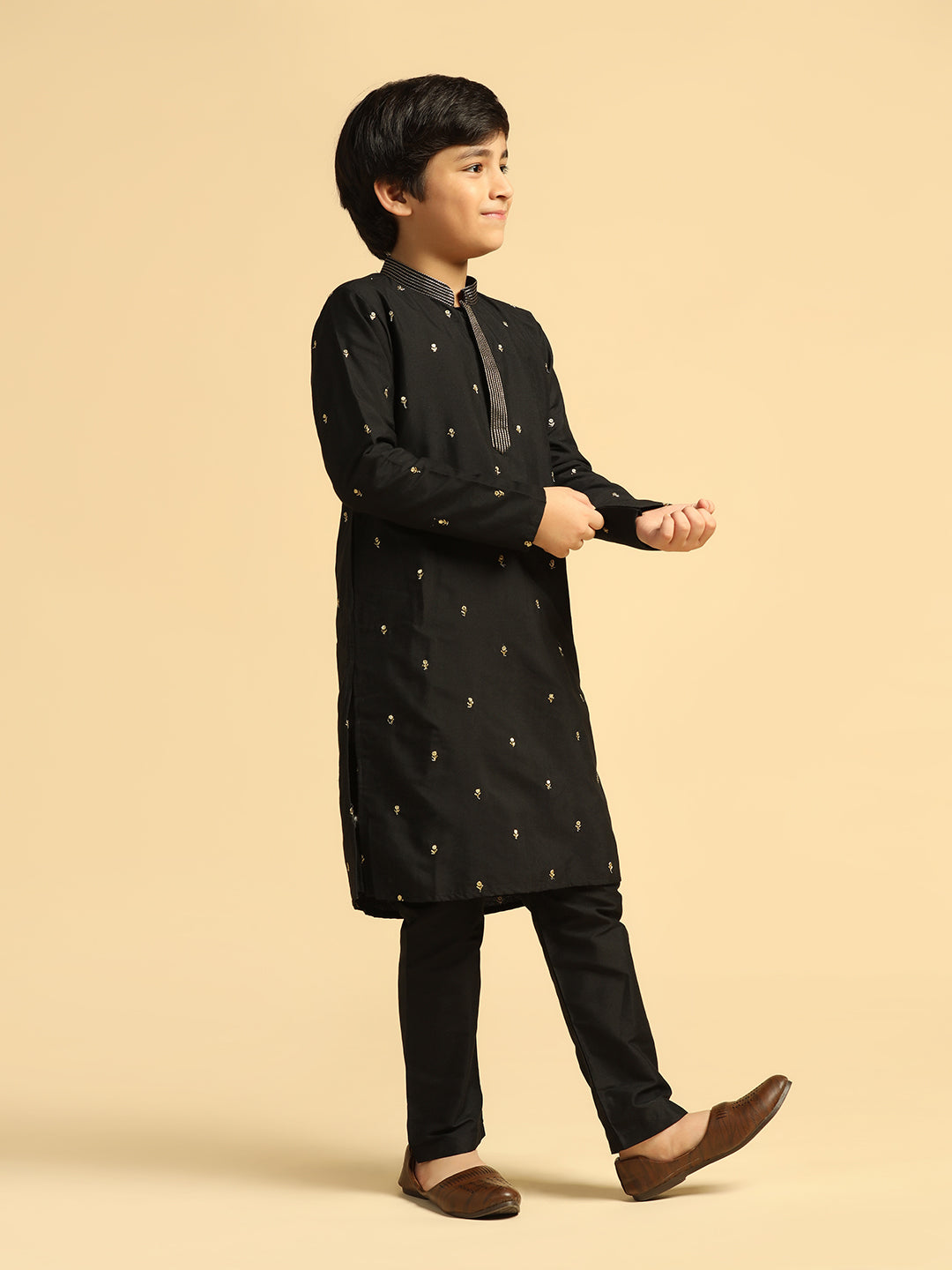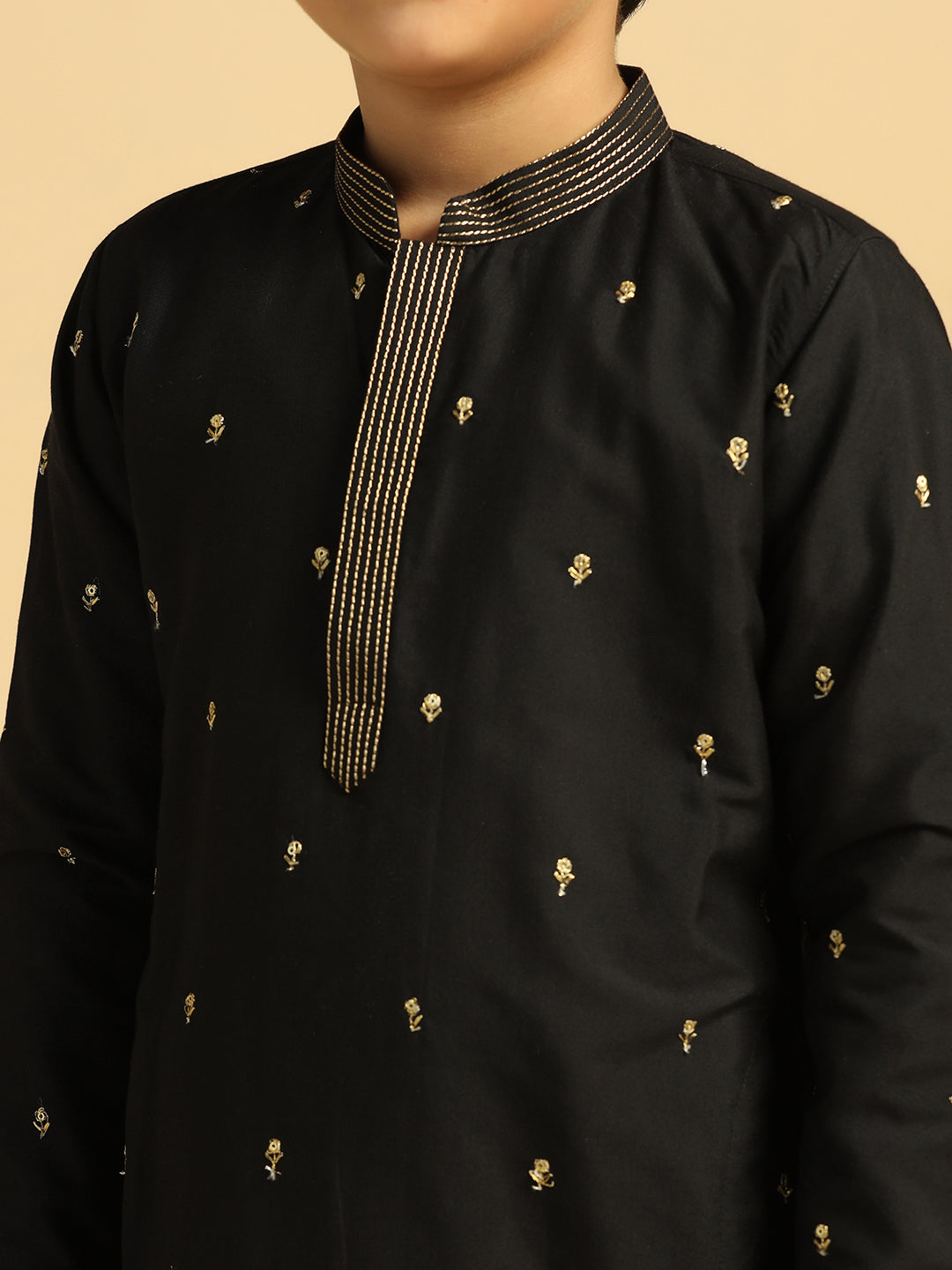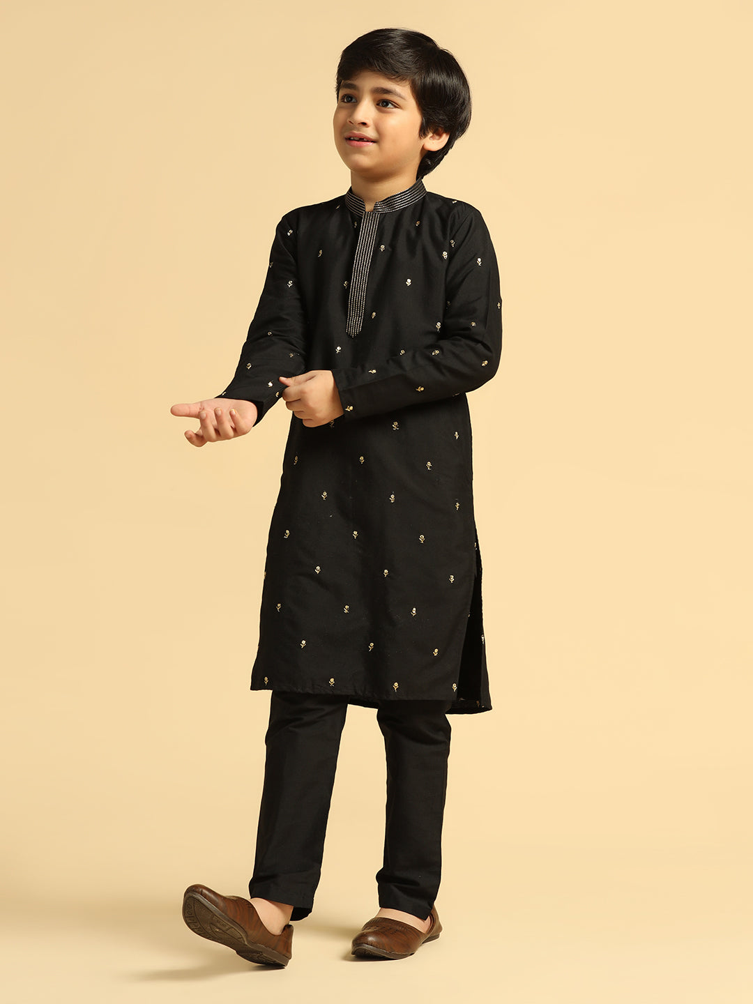 Experience classic elegance with this Kisah Boy's Black Embroidered Kurta. The breathable fabric ensures comfort throughout the day. Ideal for festive events or casual wear.