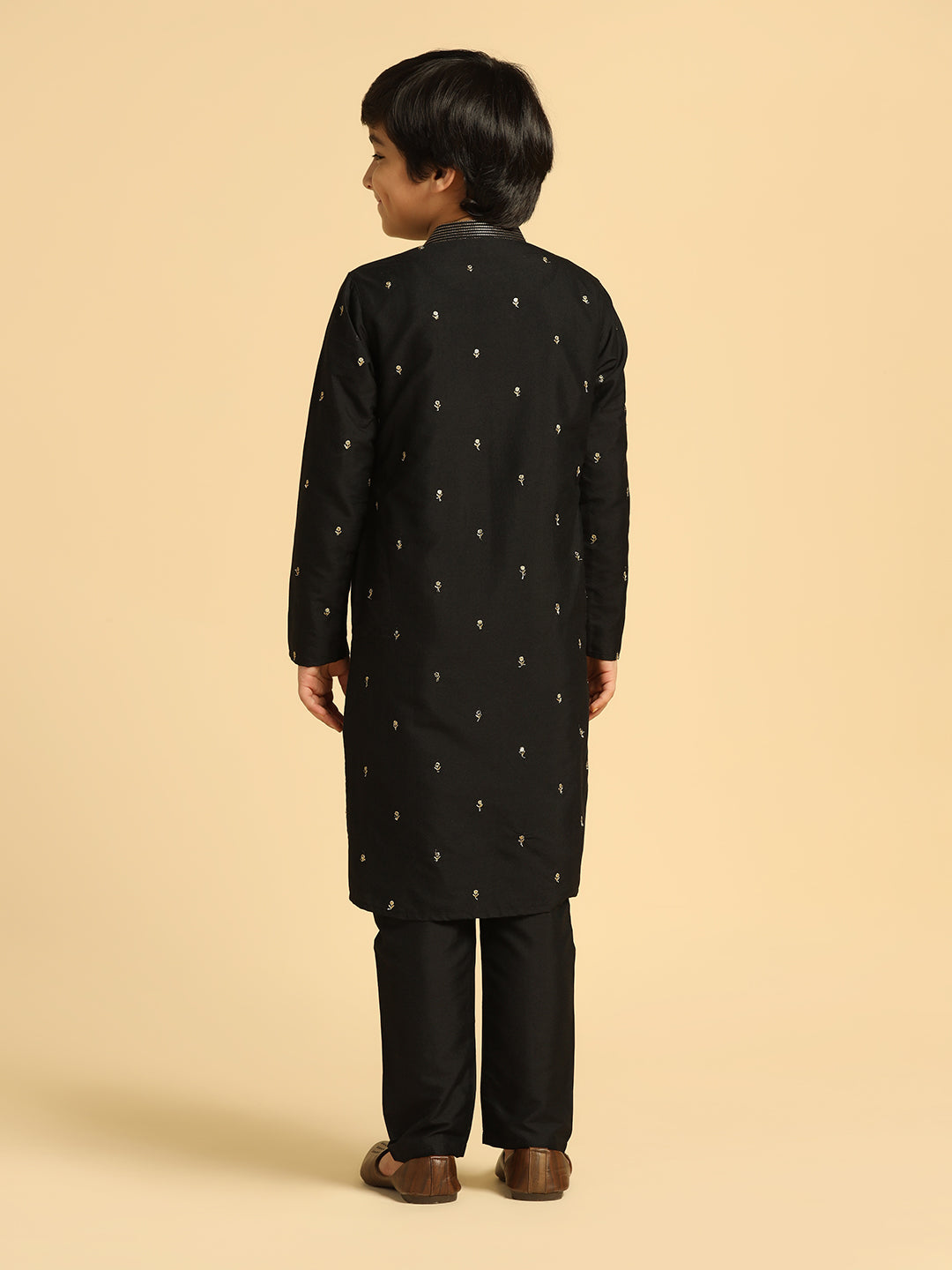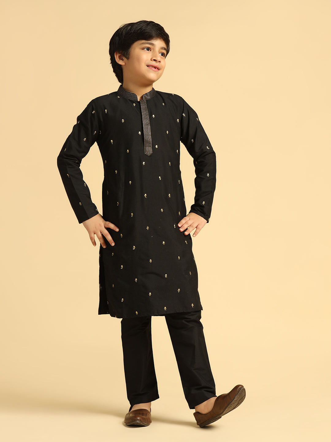 Experience classic elegance with this Kisah Boy's Black Embroidered Kurta Pyjama Set. The breathable fabric ensures comfort throughout the day. Ideal for festive events or casual wear.