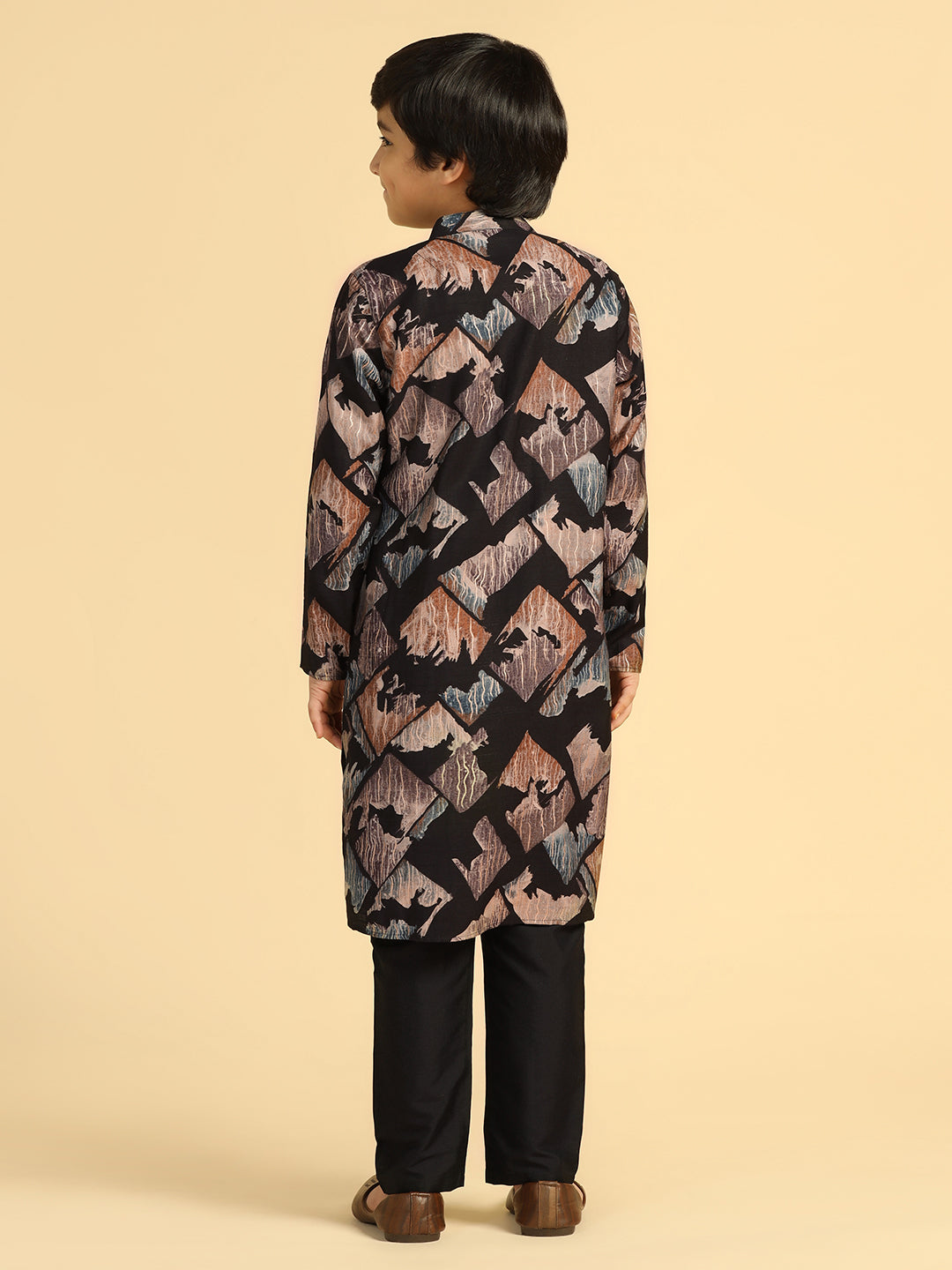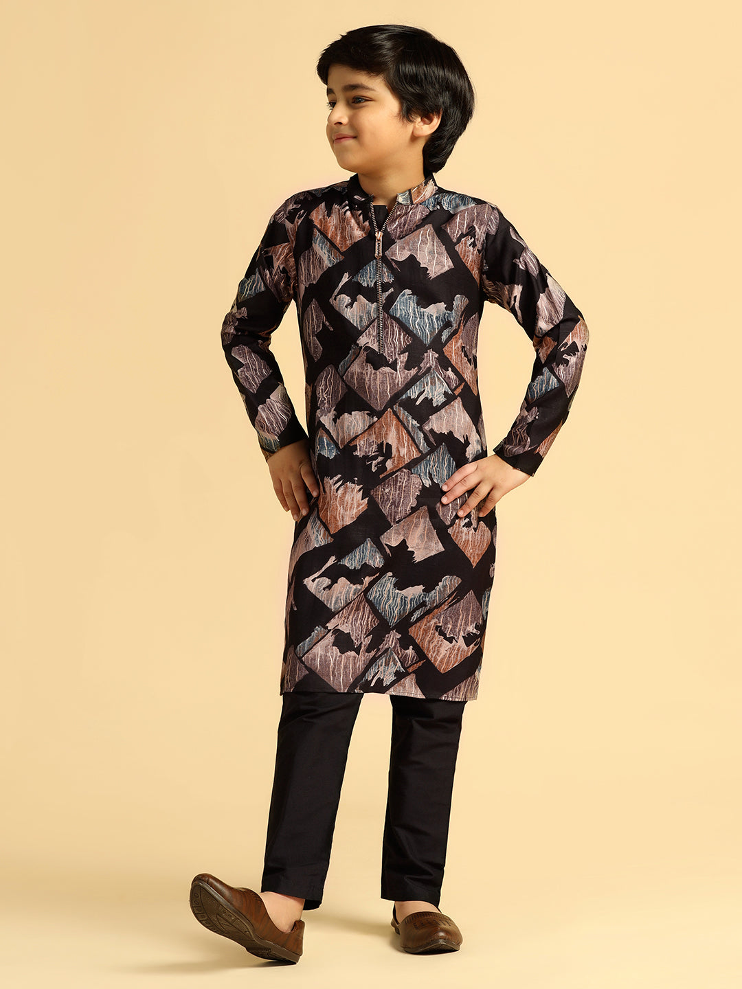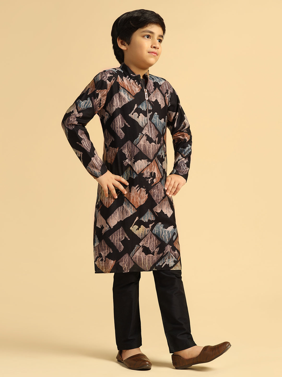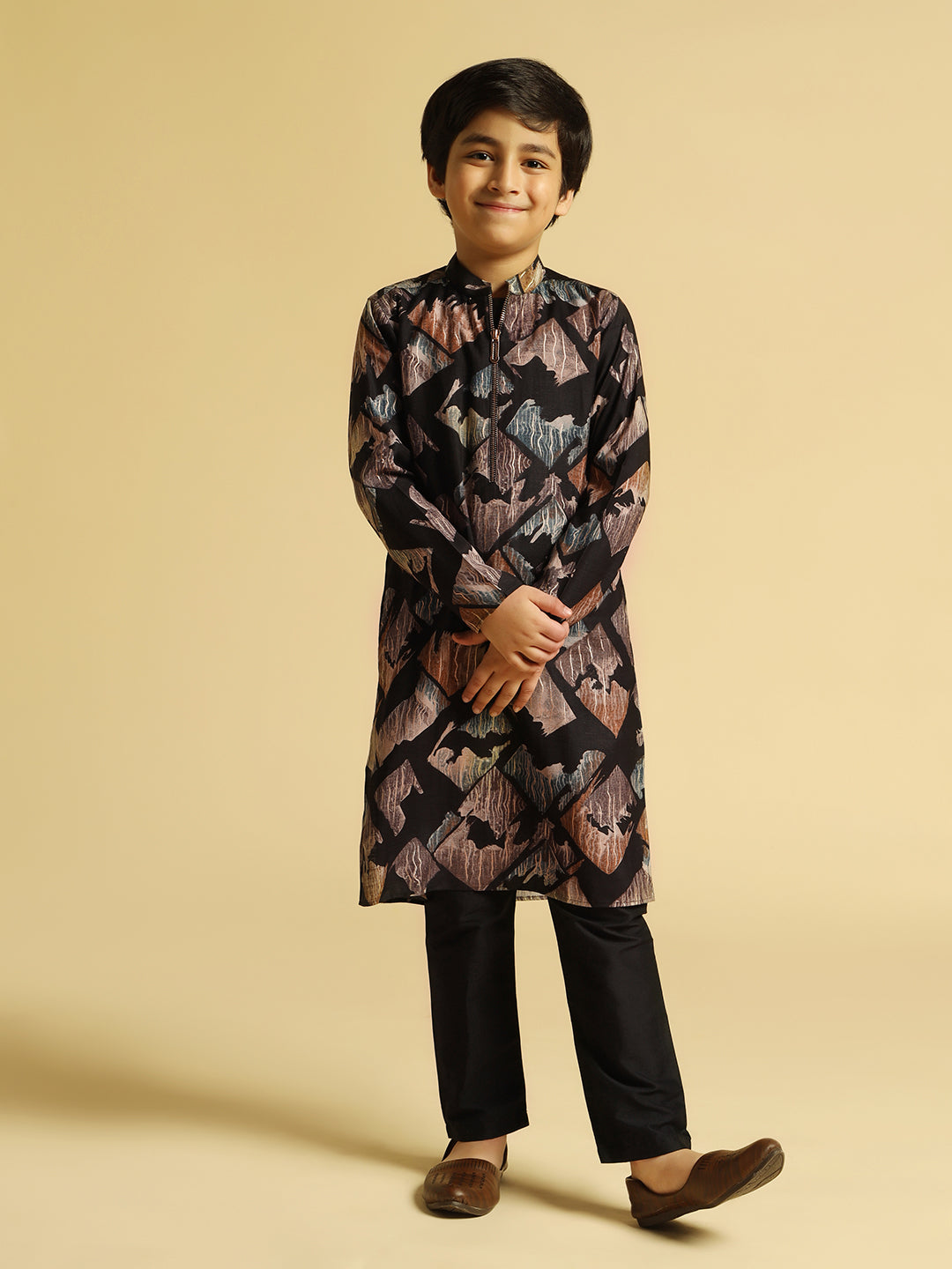 Experience classic elegance with this Kisah Boy's Black Printed Kurta. The breathable fabric ensures comfort throughout the day. Ideal for festive events or casual wear.