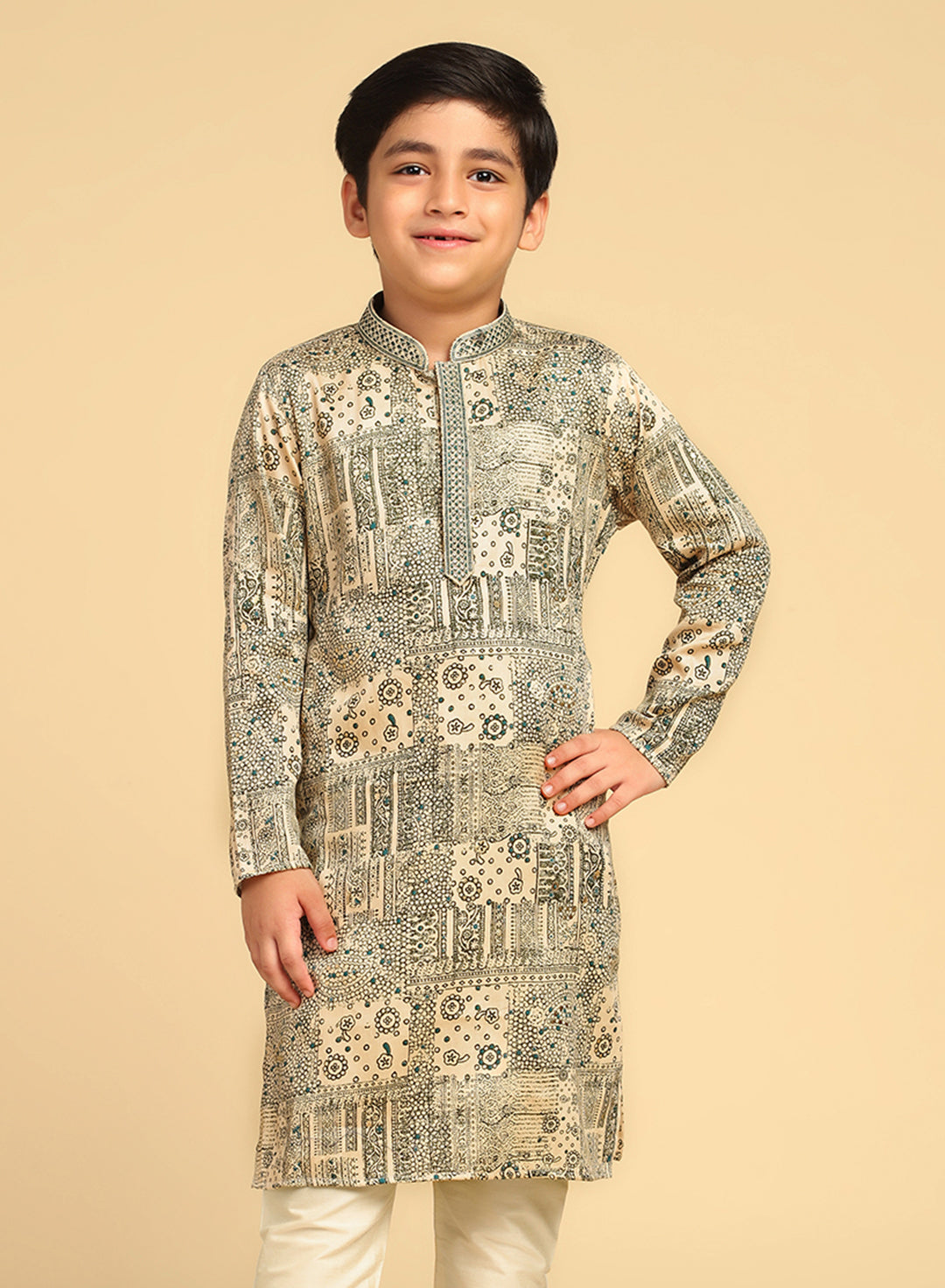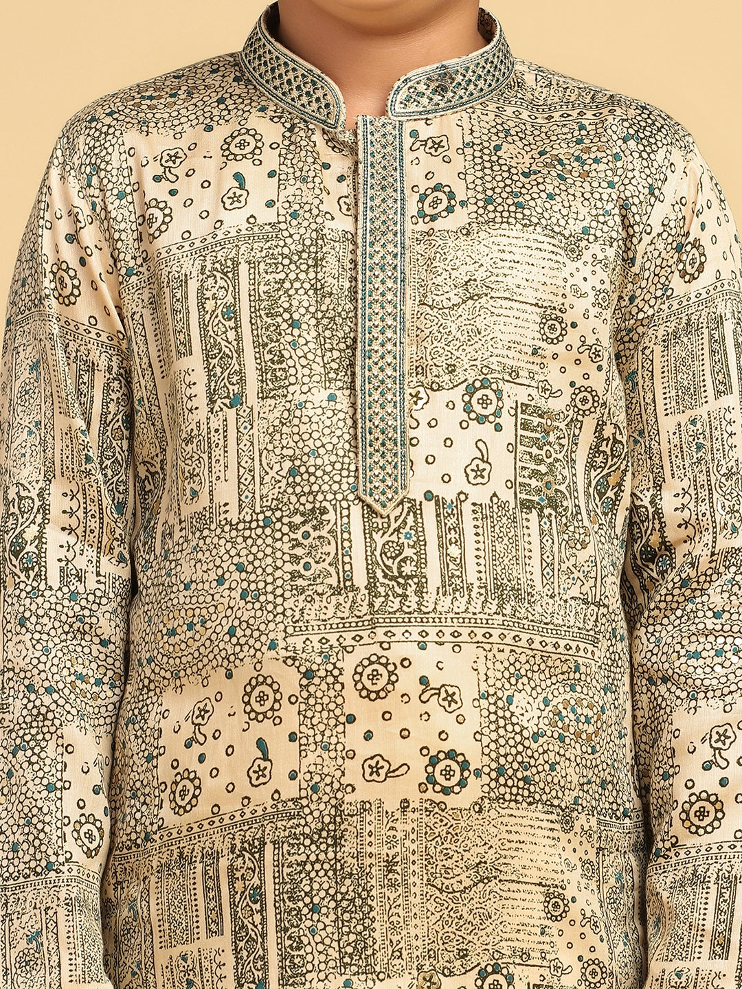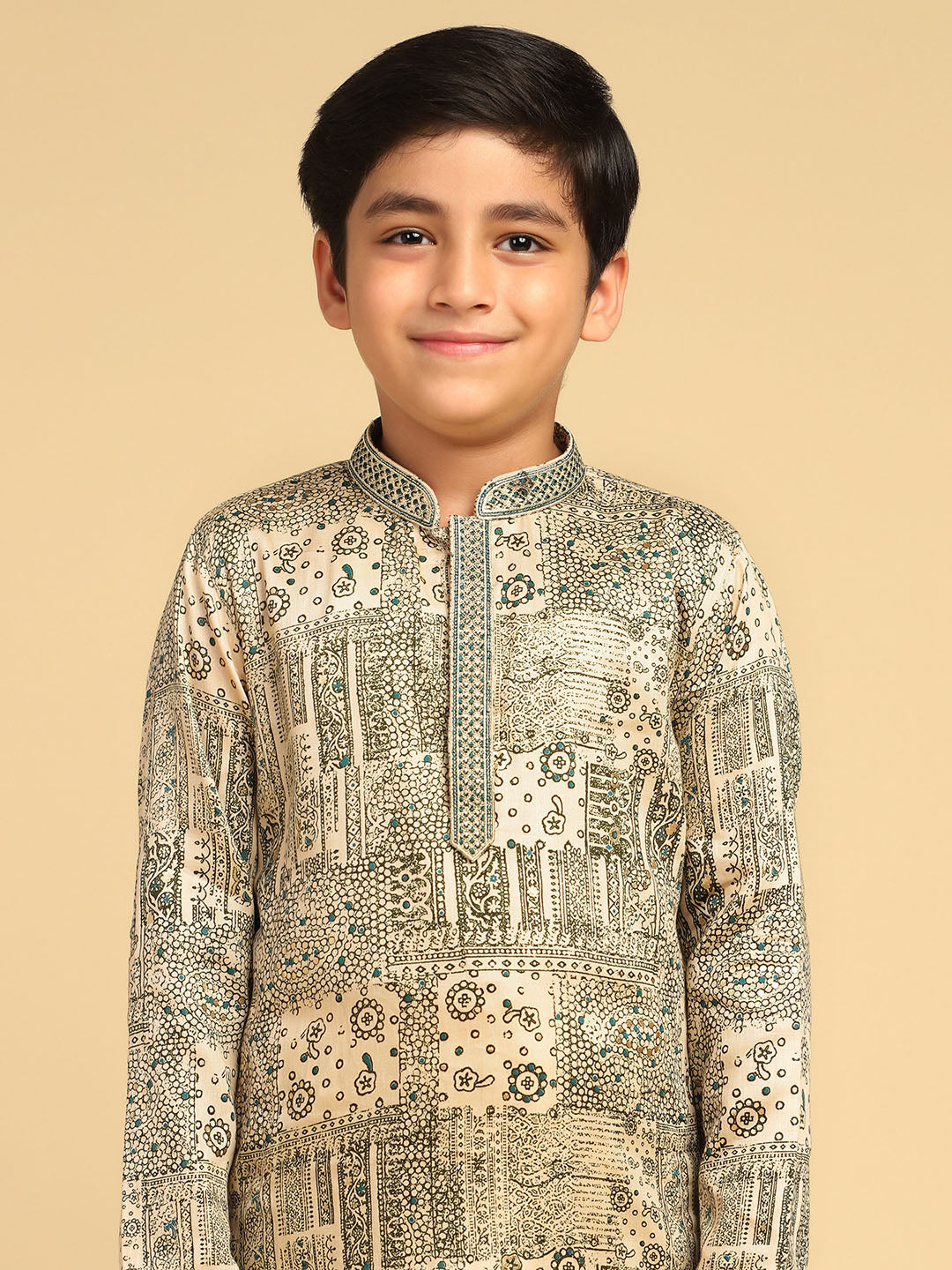 Experience classic elegance with this Kisah Boy's Bottle Green Cotton Blend Foil Print Kurta. The breathable fabric ensures comfort throughout the day. Ideal for festive events or casual wear.