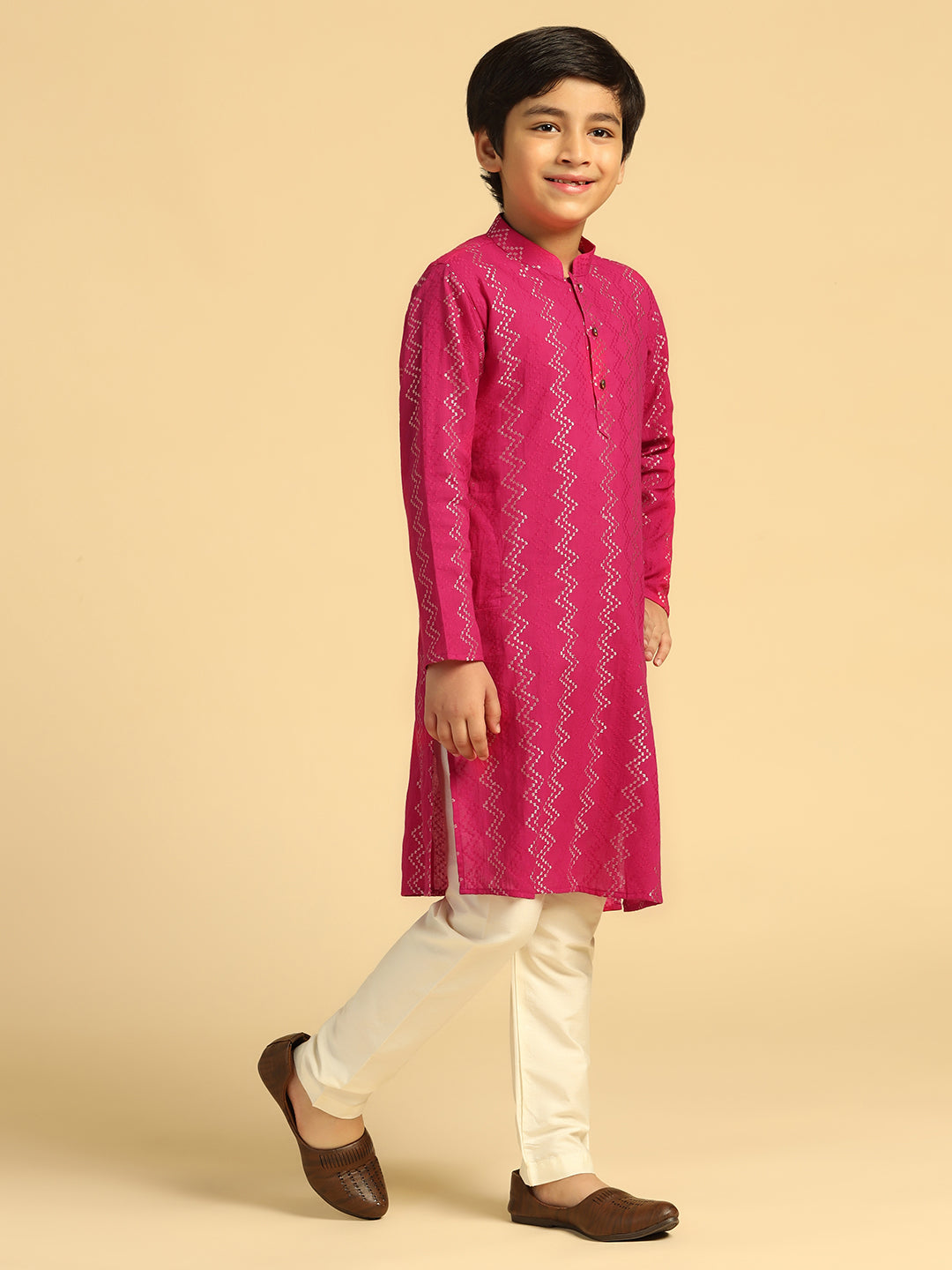 Experience classic elegance with this Kisah Boy's Hot Pink Embroidered Kurta. The breathable fabric ensures comfort throughout the day. Ideal for festive events or casual wear.