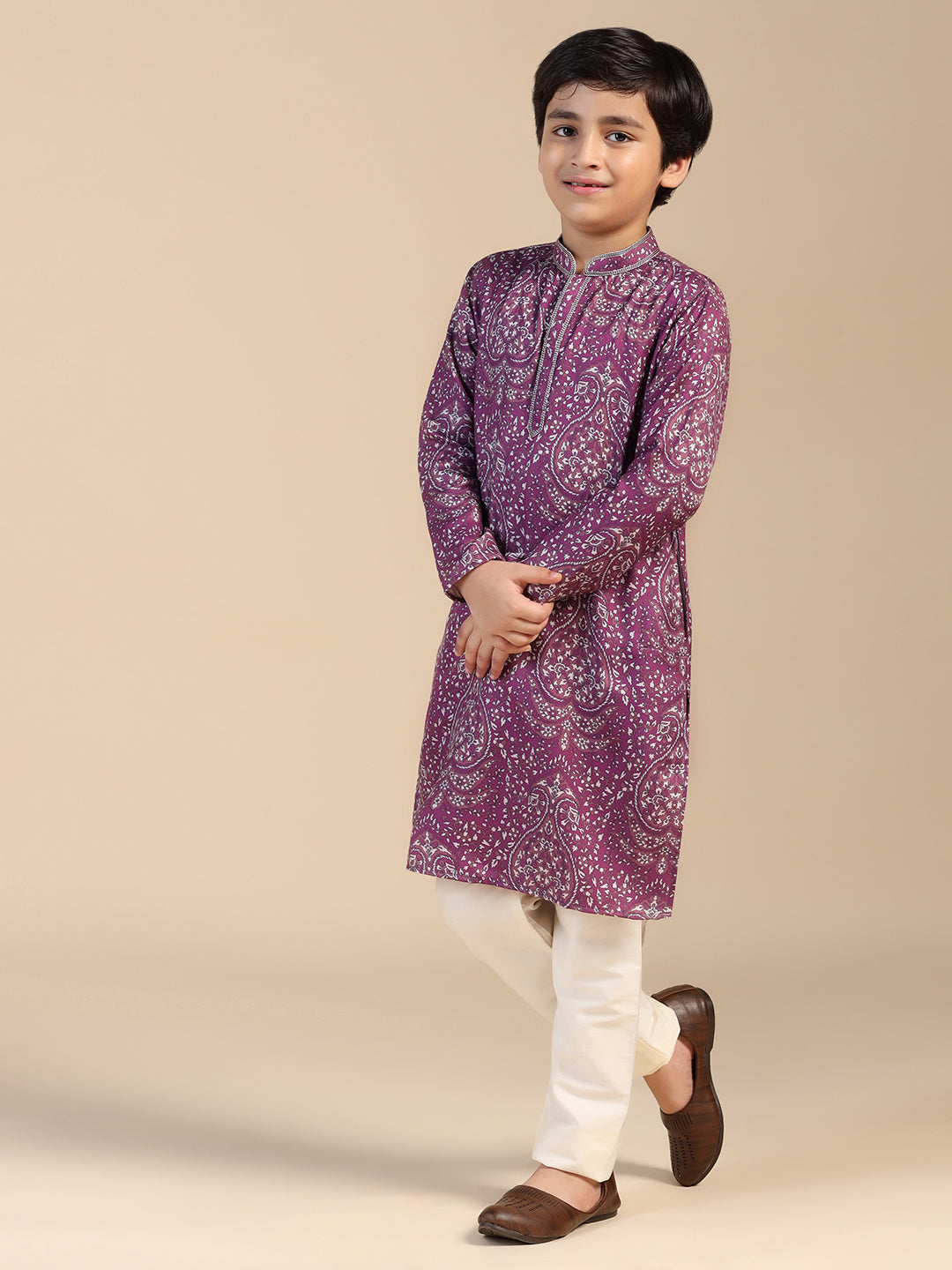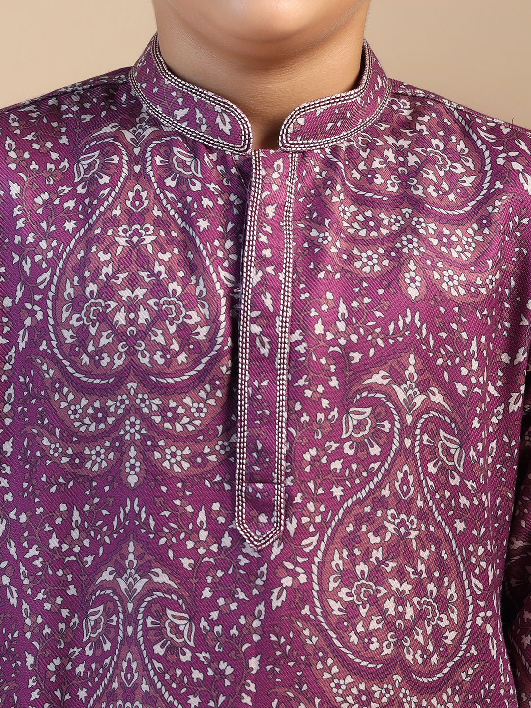Experience classic elegance with this Kisah Boy's Mauve Printed Kurta Pyjama Set. The breathable fabric ensures comfort throughout the day. Ideal for festive events or casual wear.