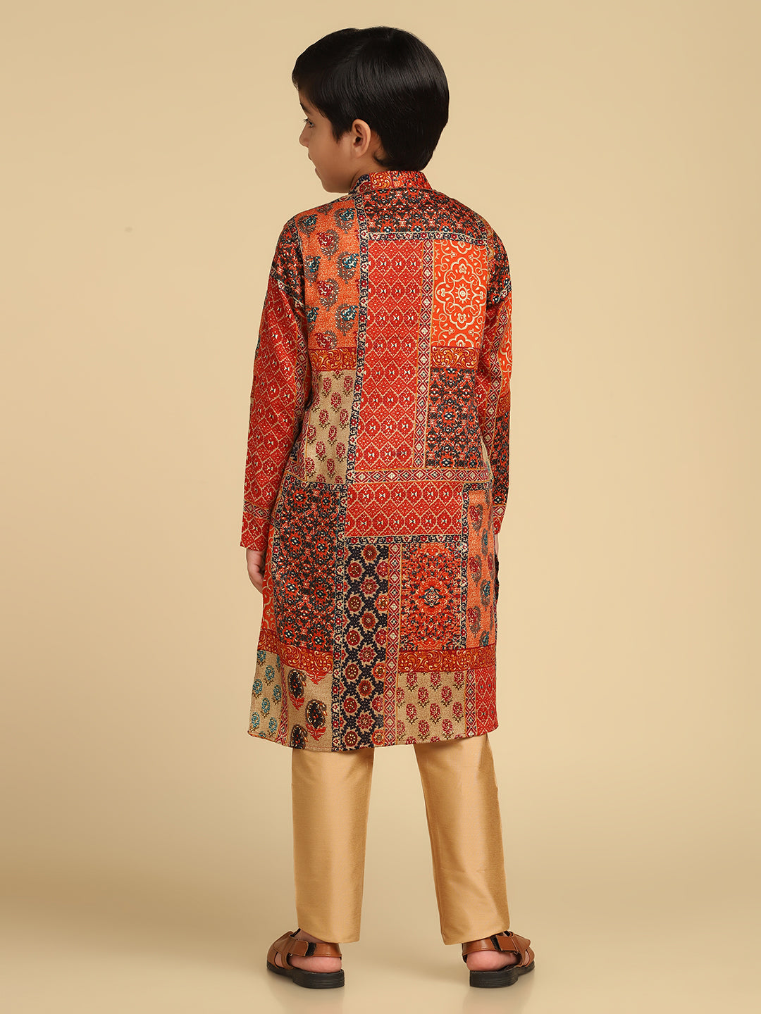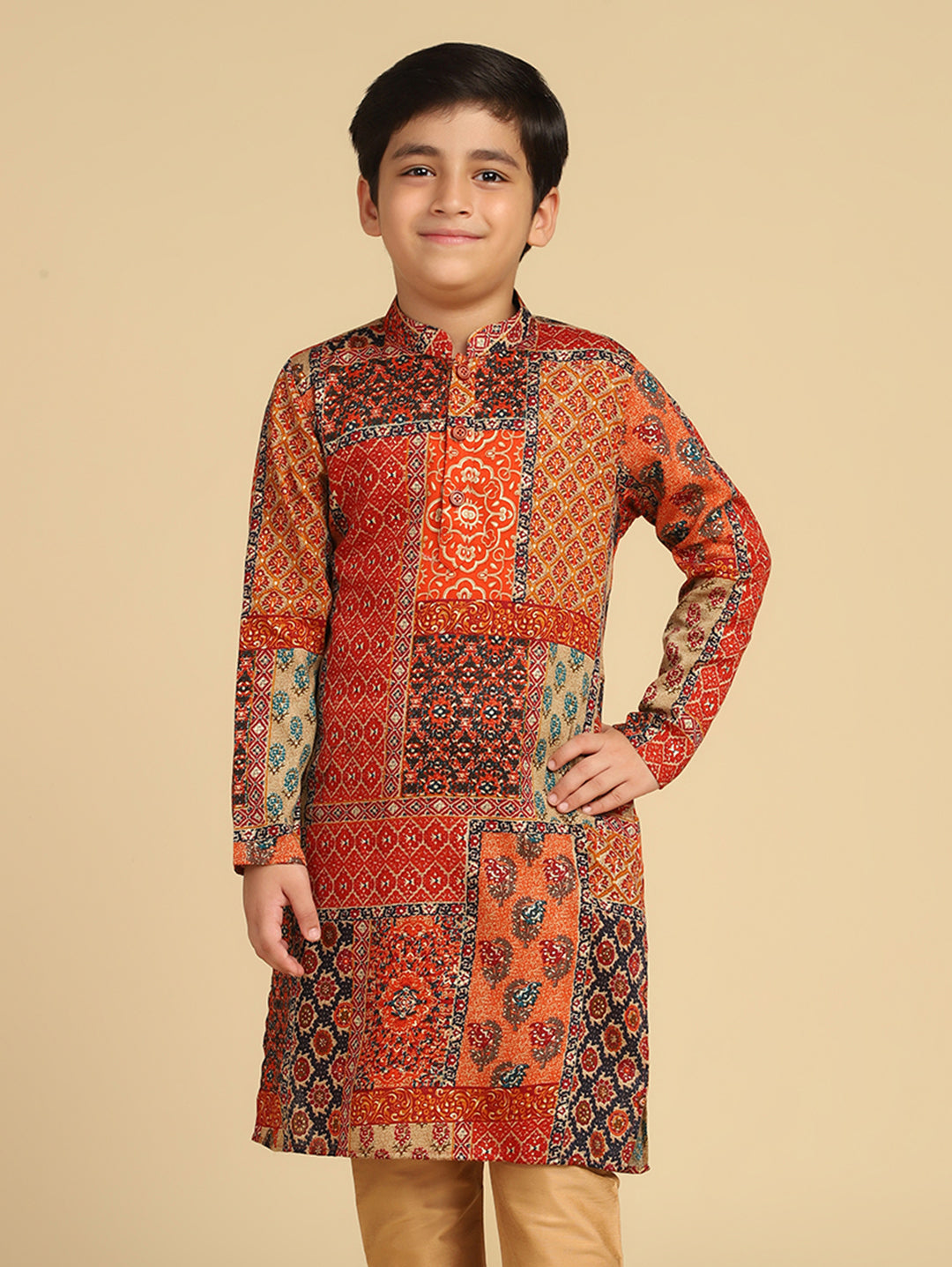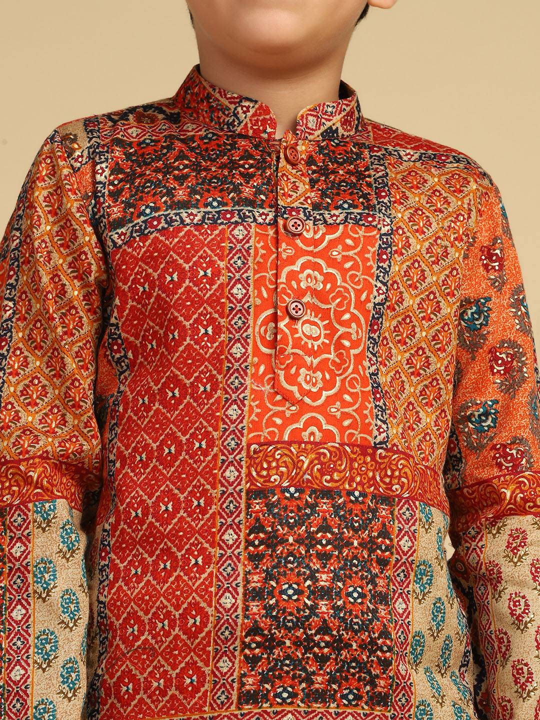 Experience classic elegance with this Kisah Boy's Multi Cotton Blend Foil Print Kurta. The breathable fabric ensures comfort throughout the day. Ideal for festive events or casual wear.