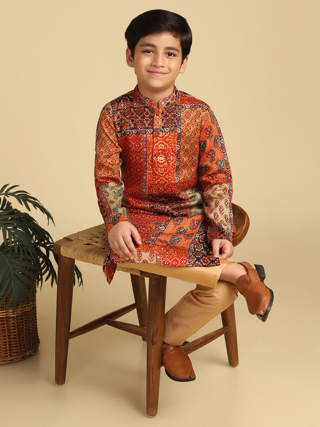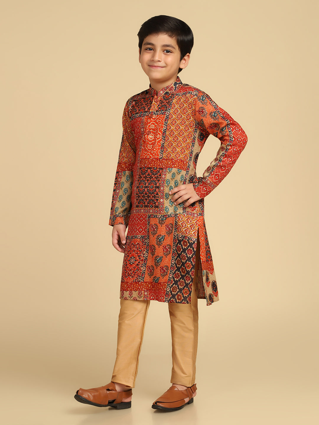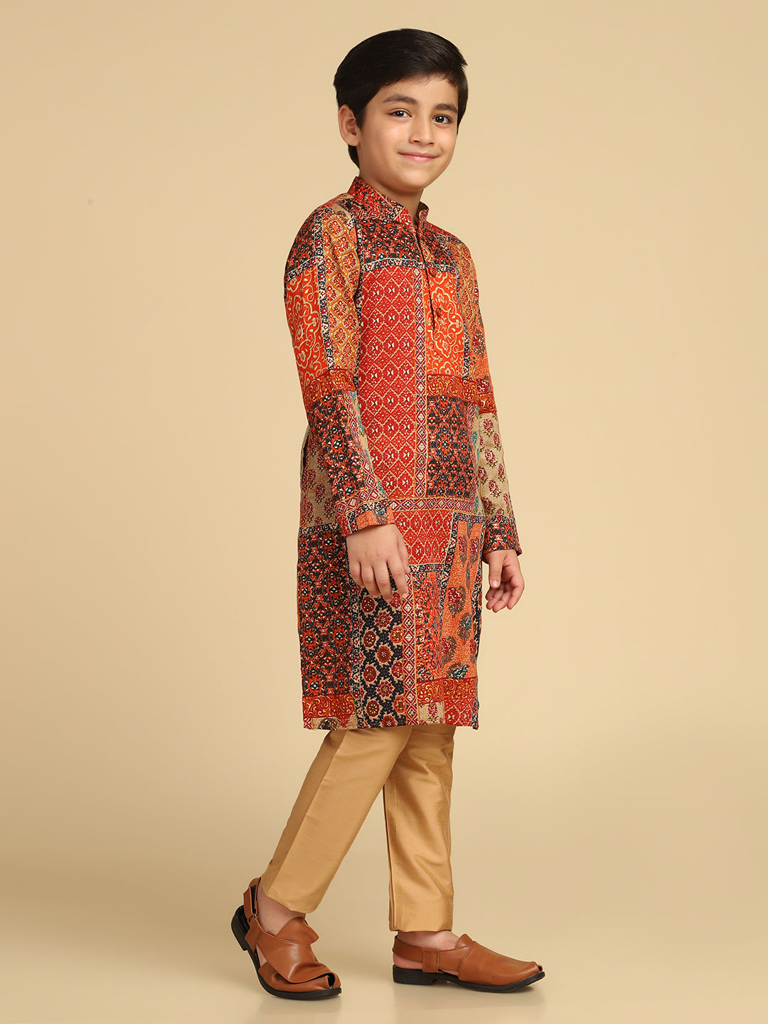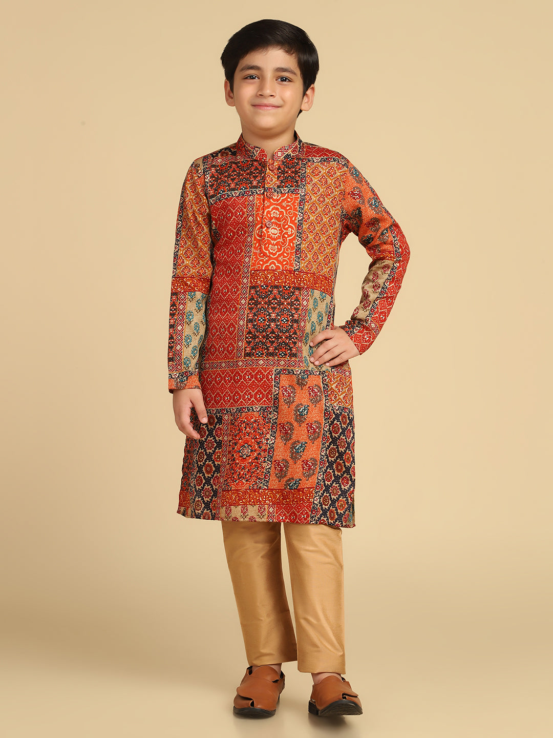 Experience classic elegance with this Kisah Boy's Multi Cotton Blend Foil Print Kurta Pyjama Set. The breathable fabric ensures comfort throughout the day. Ideal for festive events or casual wear.